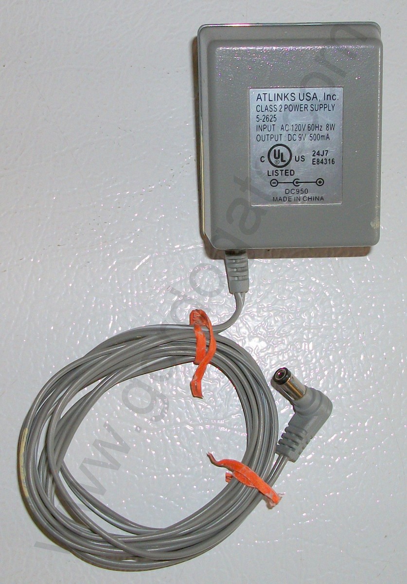 Input: 120VAC 60Hz 8W, Output: DC 9V 500mA. 5-2625 DC950. ATLINKS USA, Inc. Class 2 Power Supply 24J7 E84316 – Made in China. Barrel type plug with positive on center.