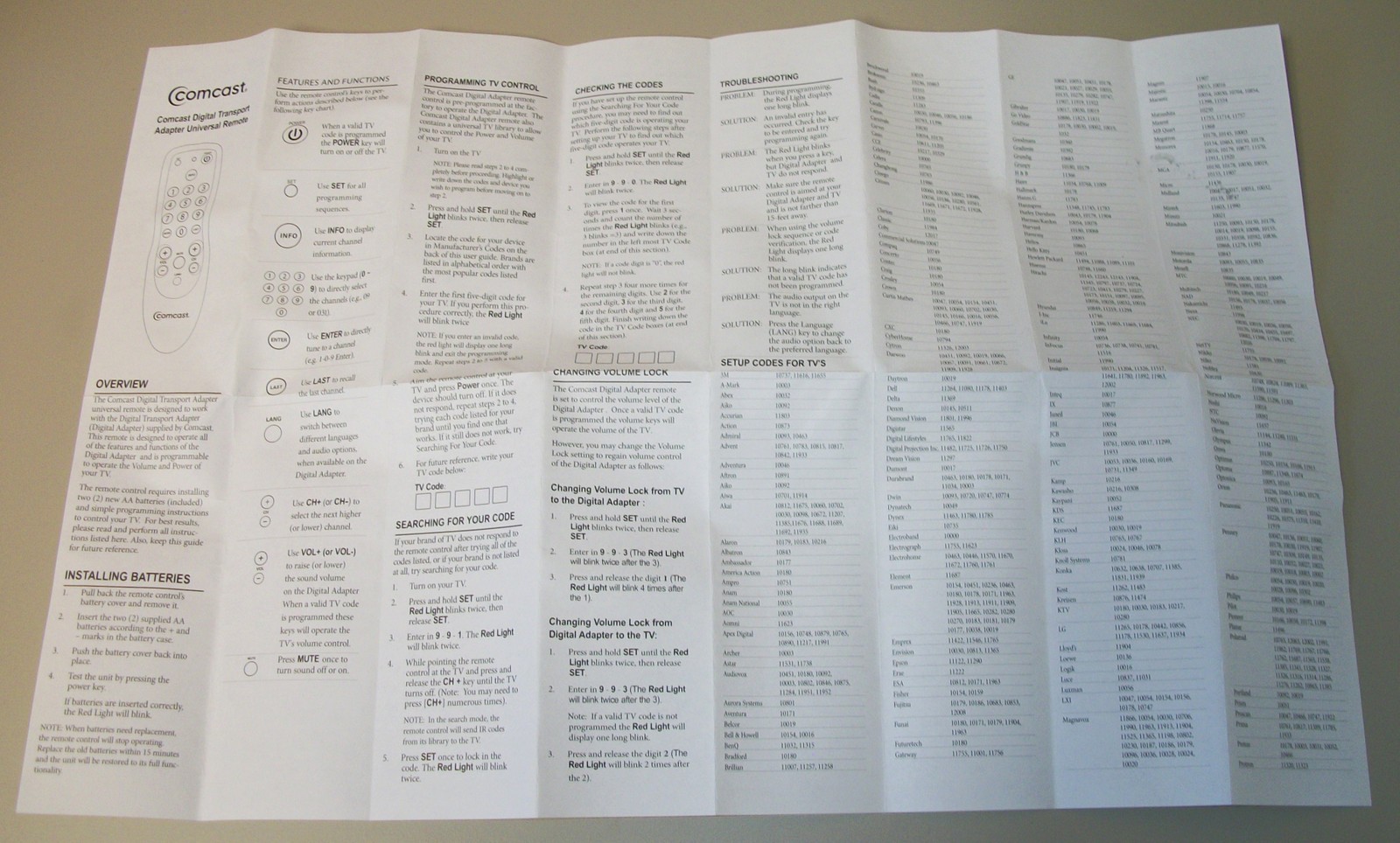 Up for sale is a Comcast Xfinity Remote Control in good used condition. It requires 2 AAA batteries. (not included) It is used to control some types of Comcast cable boxes and the TV connected to the cable box – the programming guide and code booklet is included. Hope someone out there can use it! It measures about 6 3/8 inches long by about 2 inches wide by about 1 inch thick. Made in China. On a sticker in the battery compartment: “3067ABC2-R” and “C111301”. Please check with Comcast for compatibility with your cable box BEFORE you purchase this item.