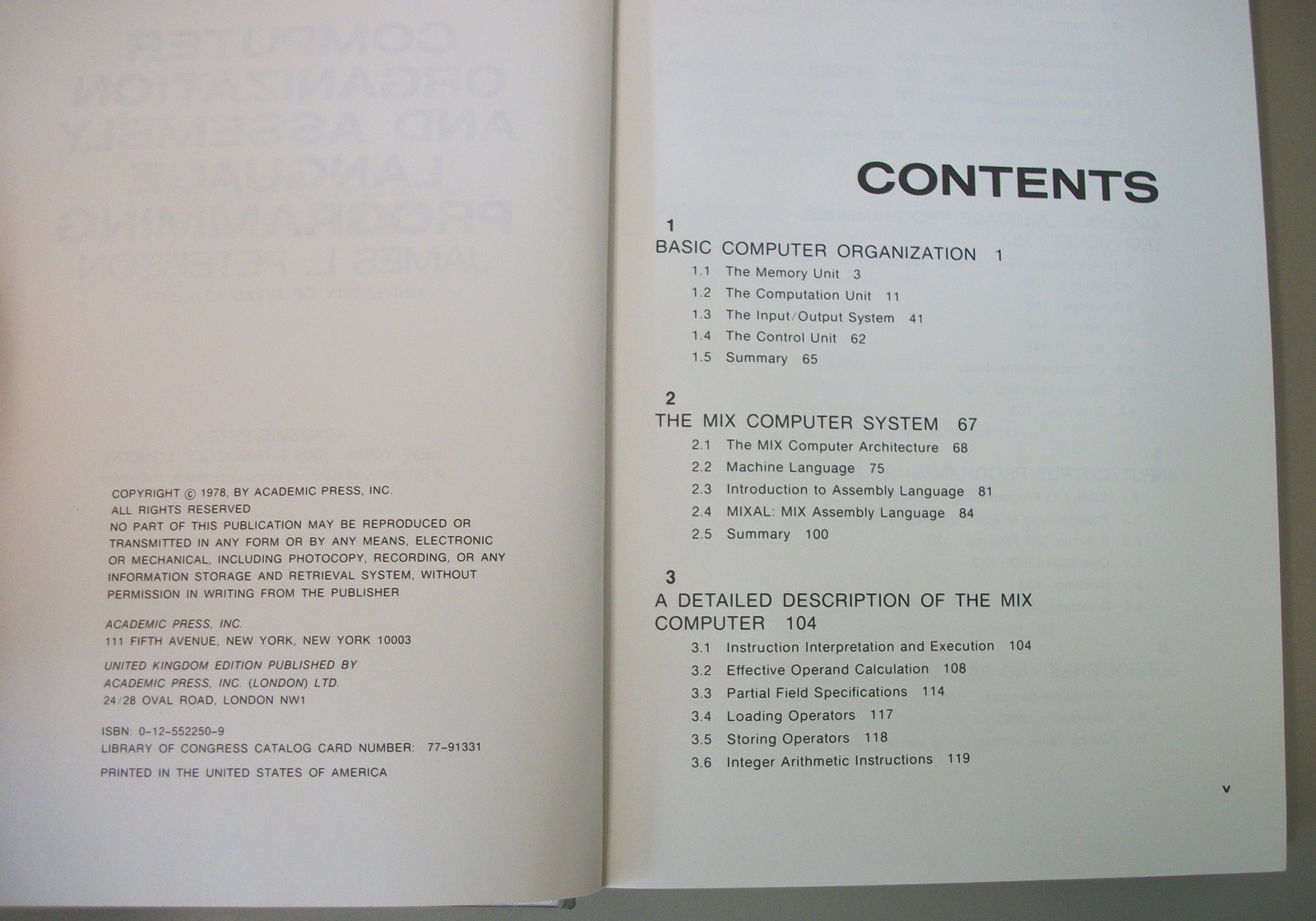 Up for sale is a hardcover book: Computer Organization and Assembly Language Programming by James Peterson. This is in good used condition with the exception of a torn out section on the inside cover where the name of the previous owner was. Examine the pictures BEFORE you make your decision to purchase this book! 1978.
