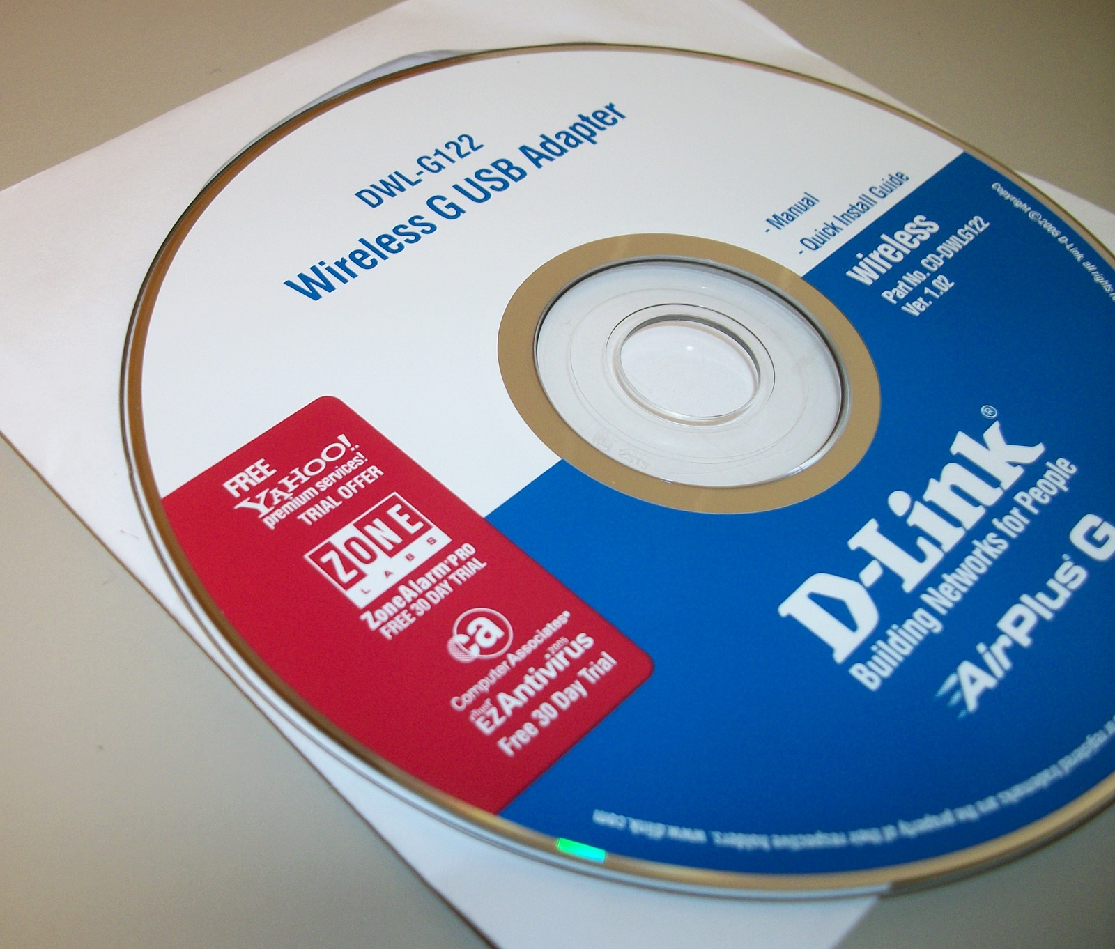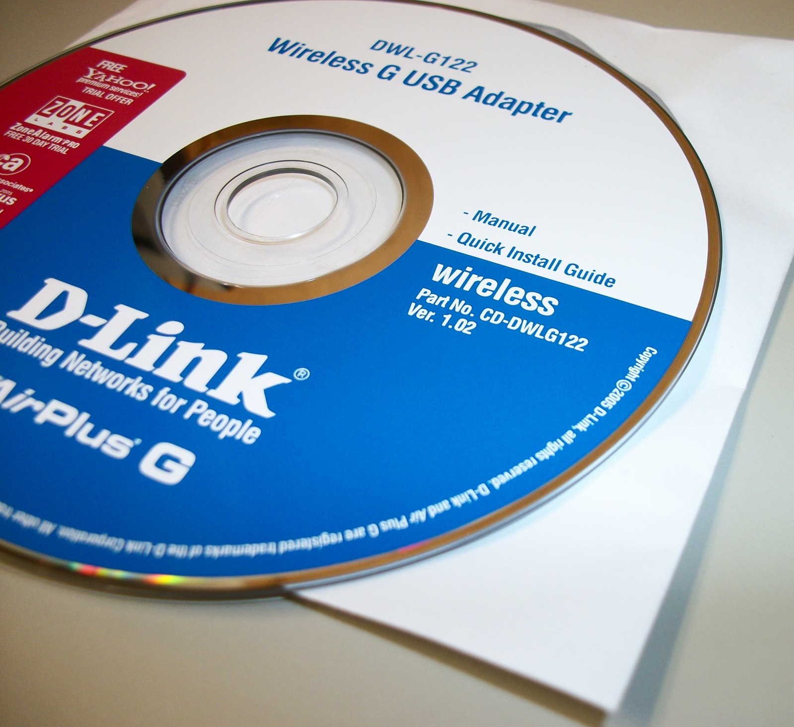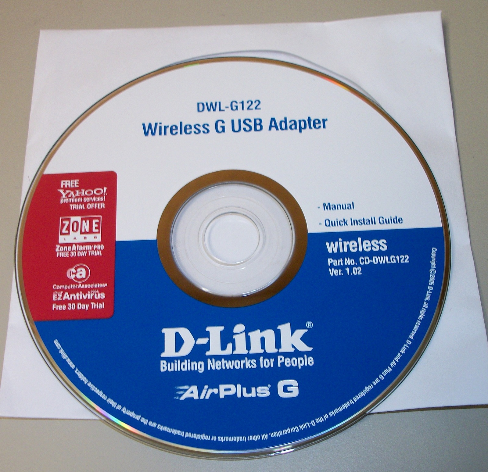 Up for sale is the original driver/install CD which came with a D-Link DWL-G122 USB wireless adapter from 2005. You get the CD: Part No. CD-DWLG122 Ver. 1.02.