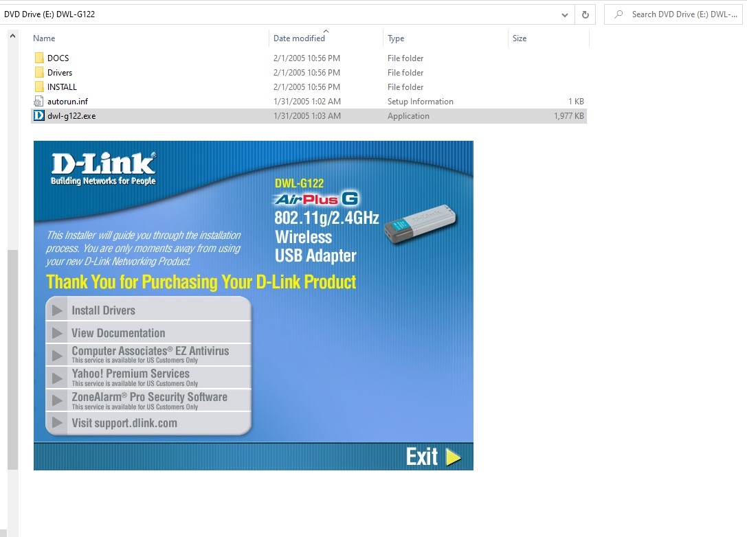 This includes documentation and driver software for D-Link DWL-G122 USB wireless adapter from 2005. DO NOT EXPECT THIS TO WORK WITH A MODERN OPERATING SYSTEM! We tried to run the ‘Dwl-G122.exe’ file in Windows 10 and it asked us to download the windows feature ‘DirectPlay’. We installed this, and the disc ran, but we did not try to install any software.