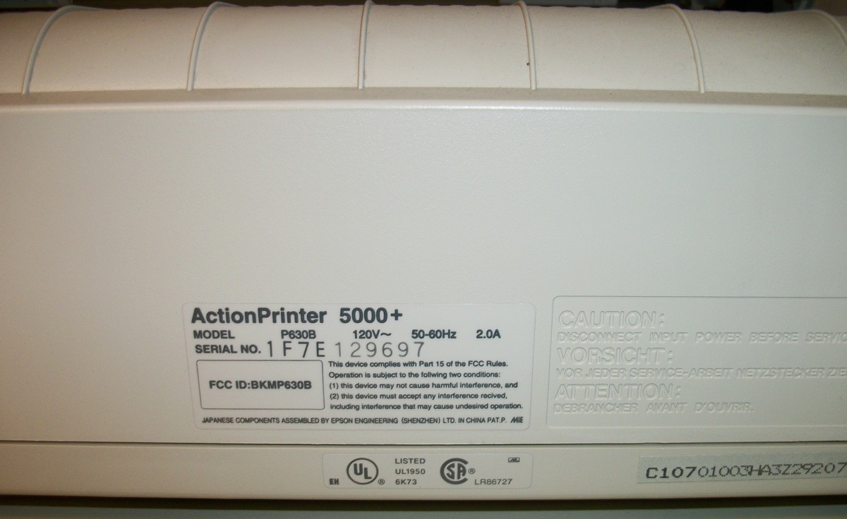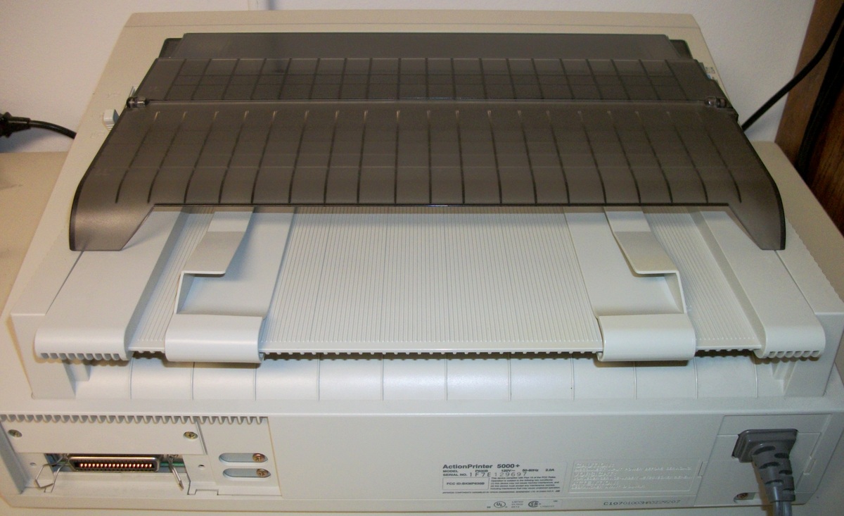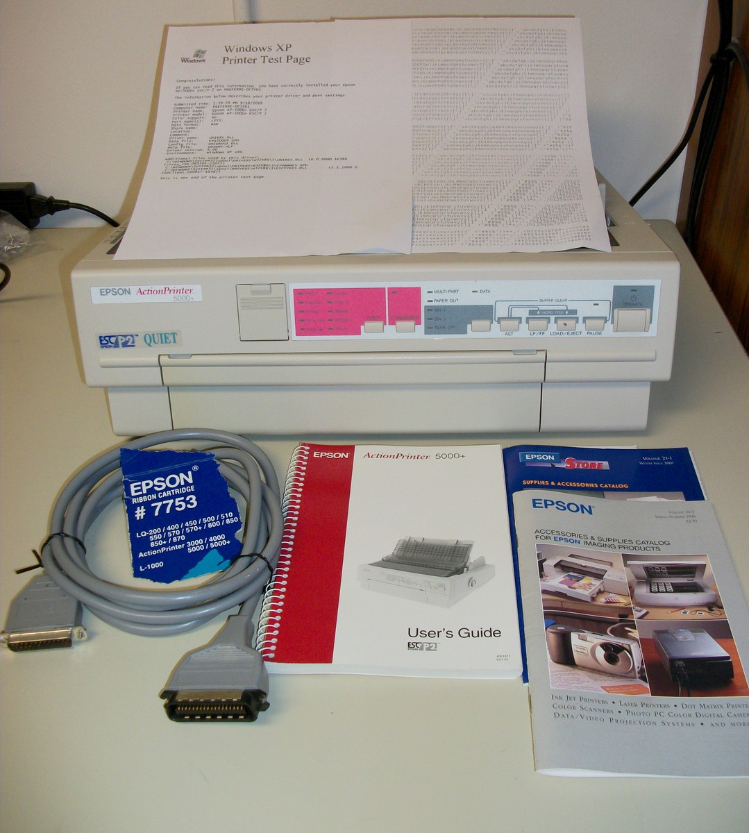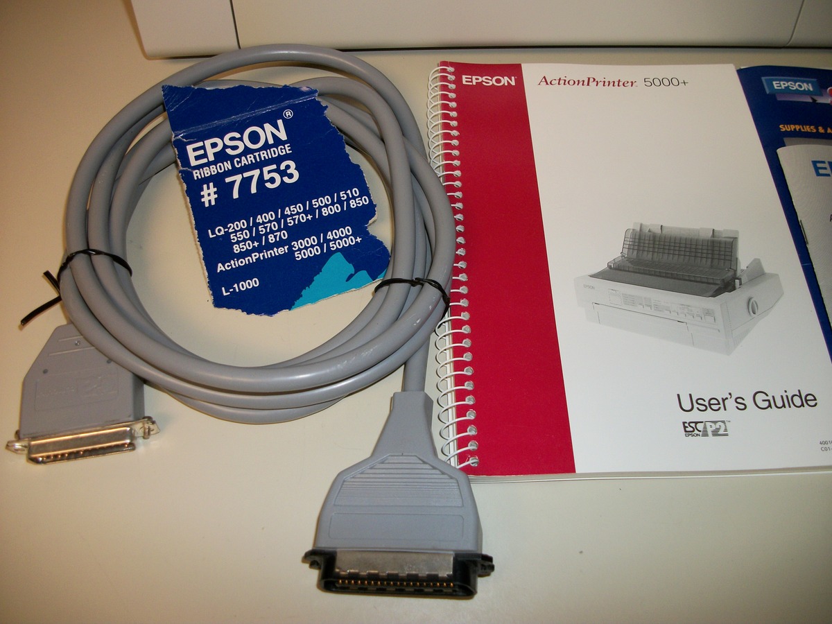 Up for sale is an old Epson ActionPrinter 5000+ dot matrix printer. We powered it on and were successfully able to print a test page – see pictures, we also connected it to an old Windows XP computer and we were able to get it to print a test page. The test pages are in good condition considering they were printed with the ribbon installed in the printer from about 20 years ago! This comes with the original user’s guide, a parallel cable (about 9′ long), and some old Epson accessory brochures – see pictures. If you would like to save on the shipping, you’re welcome to schedule an appointment and stop by to pick it up.