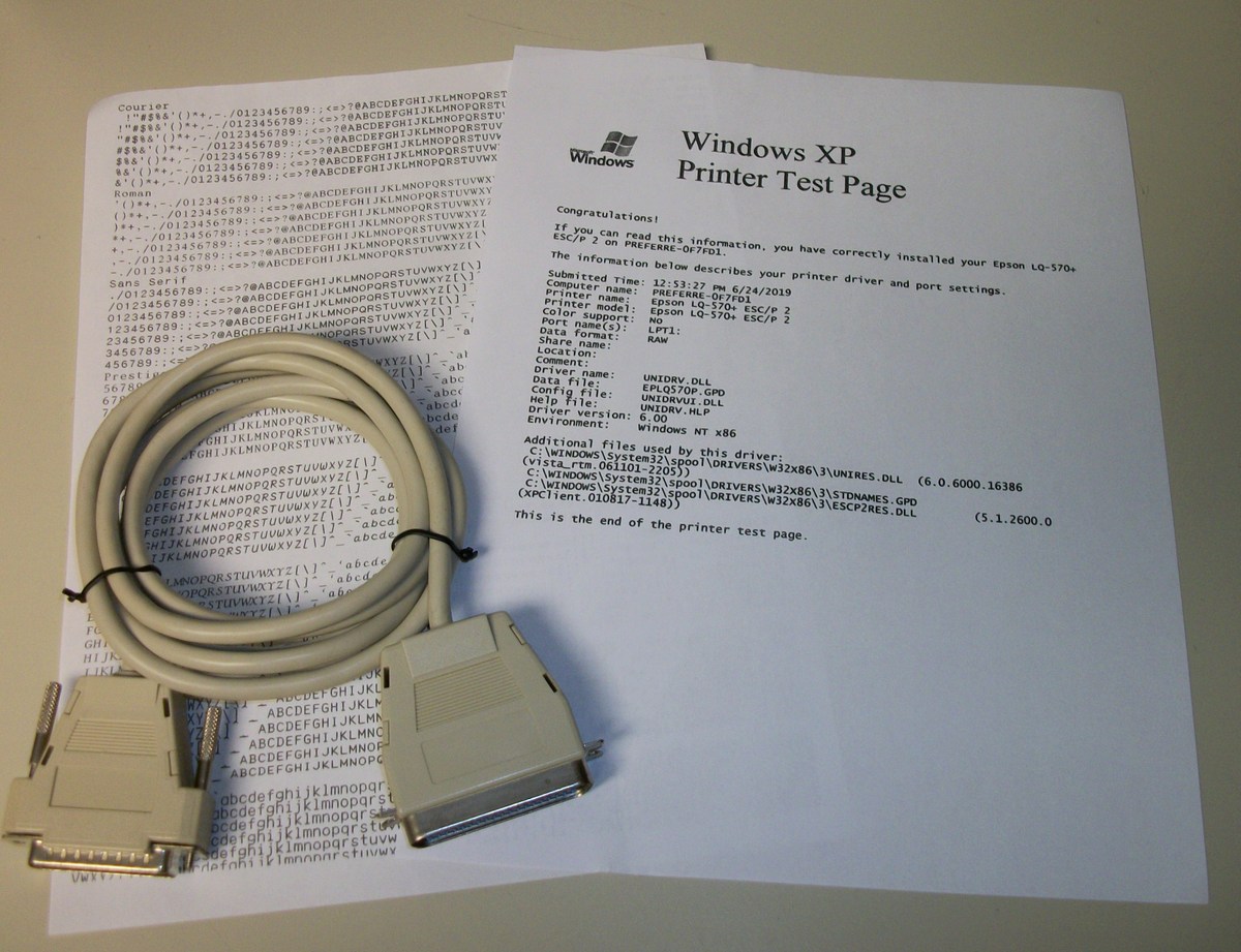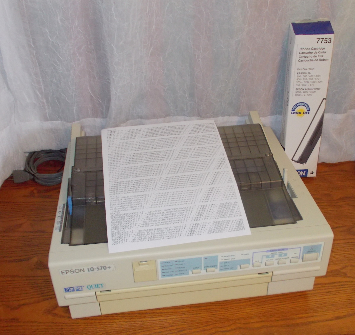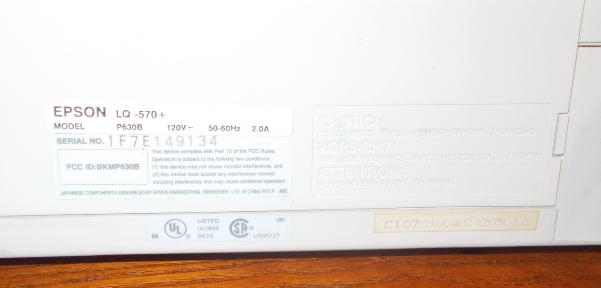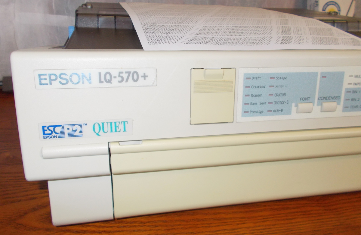 Up for sale is an old Epson LQ-570+ dot matrix printer. We powered it on and were successfully able to print a test page – see pictures, we also connected it to an old Windows XP computer and we were able to get it to print a test page. The test pages are in good condition since we installed a new, old stock ribbon into the printer to try it out. This comes with one extra ribbon in the original box – dated 2001 with ‘Linda’ written on it. If you would like to save on the shipping, you’re welcome to schedule an appointment and stop by to pick it up.