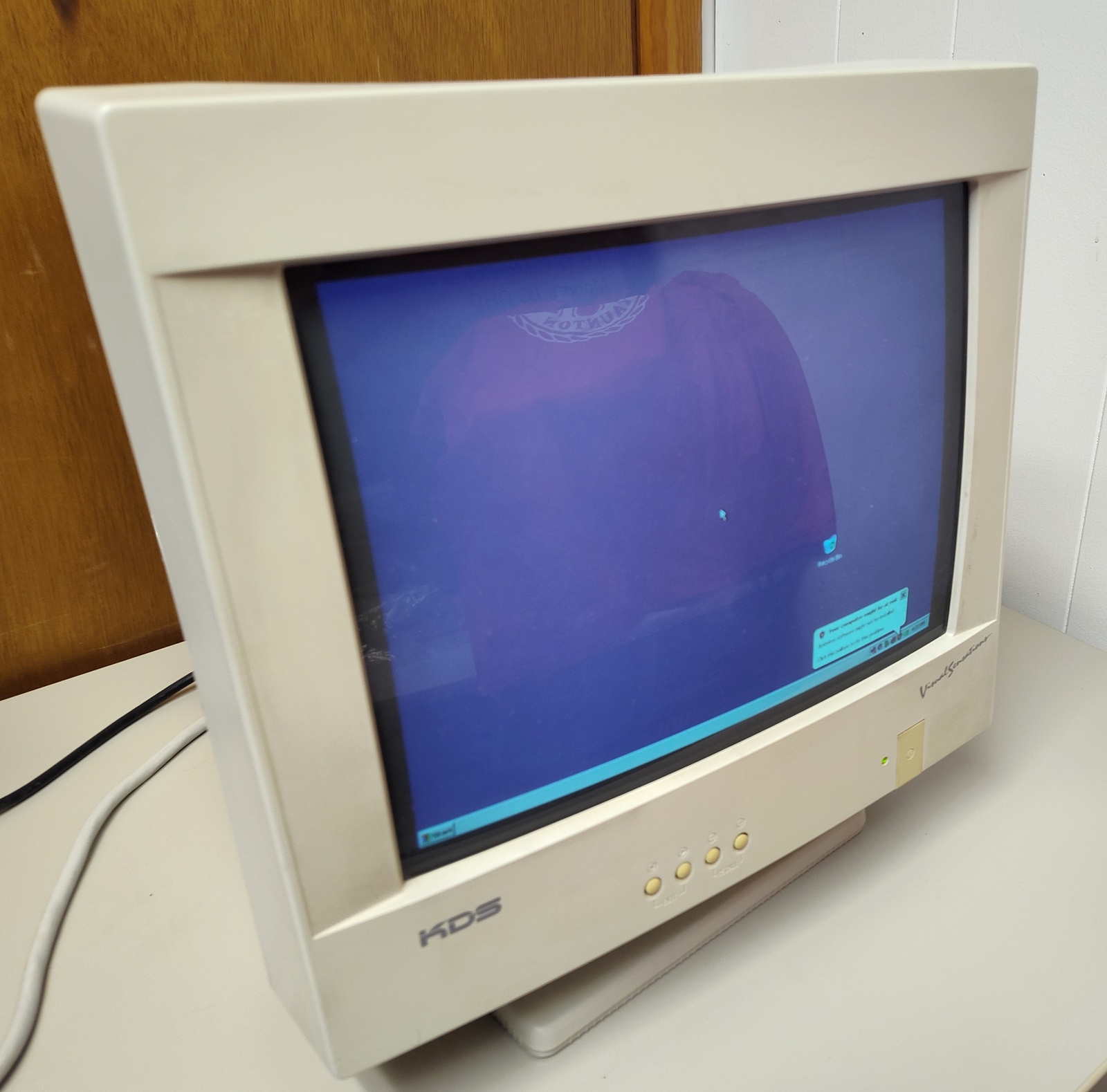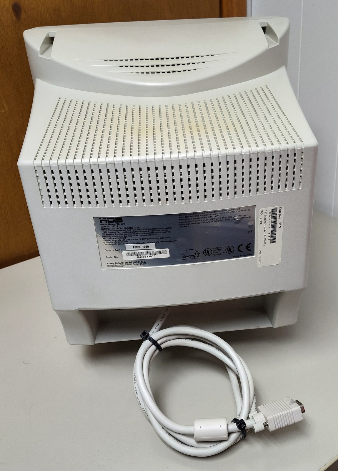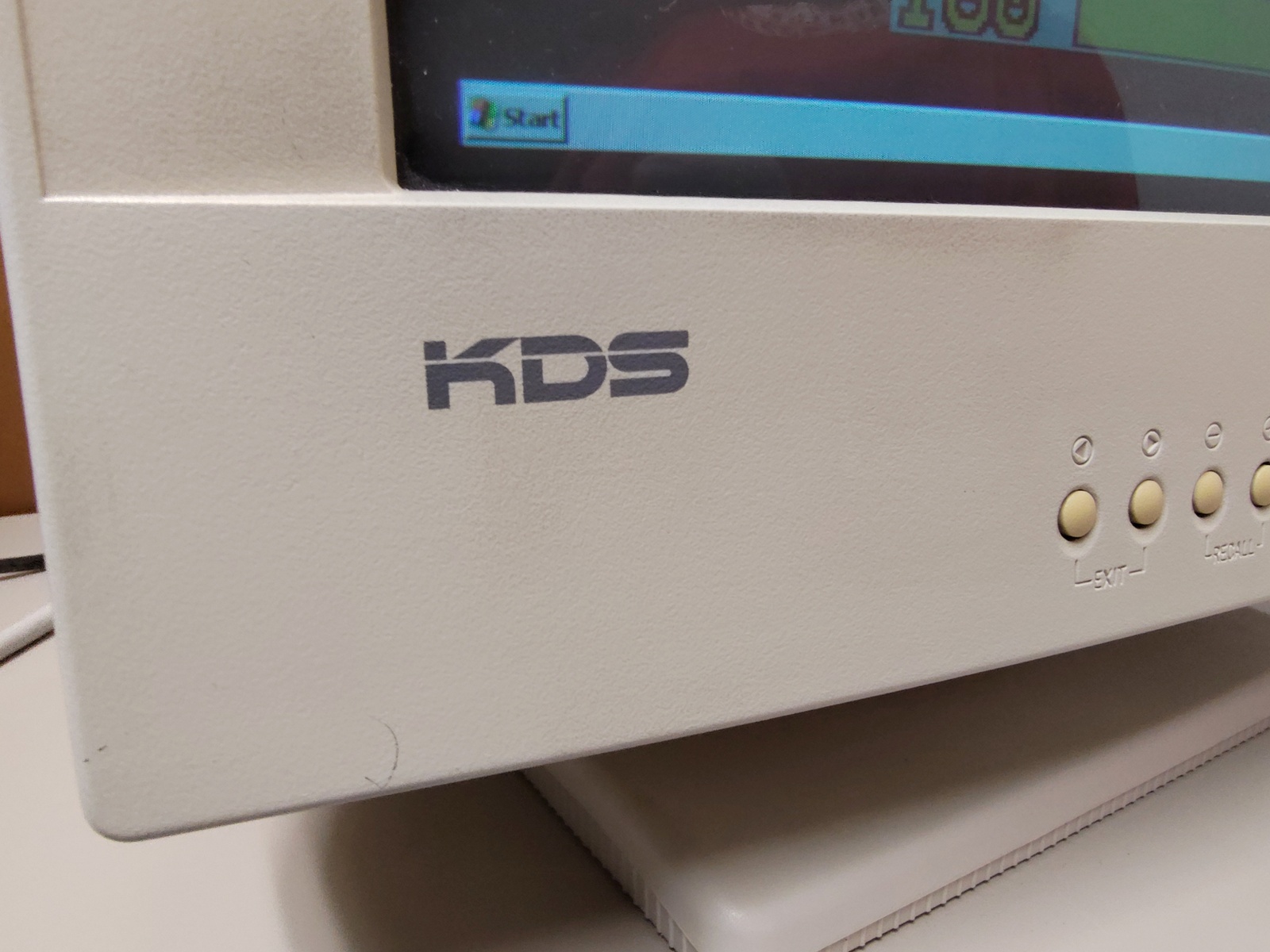 Up for sale is an old 15″ KDS (Korea Data Systems) CRT Monitor from 1999. We connected this old monitor to our Windows XP machine and it came on and was able to display the desktop, but the image was pretty dim and we adjusted the brightness all the way up and it was still a bit dim – LOOK AT THE PICTURES. We recall having CRTs repaired back in the day with this problem, but don’t really remember much more than that. Hopefully, someone out there is interested in getting it going? The last pictures are from the Internet Archive – from KDS’ website about this monitor.