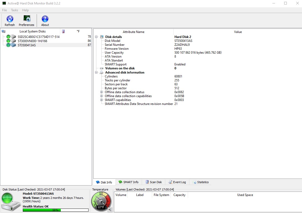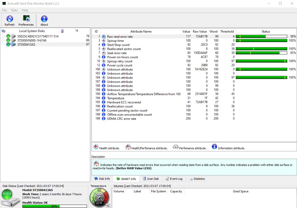 - 19591 Hours (2 Years, 2 Months, 26 Days, 7 Hours) (according to Active Hard Disk Monitor)