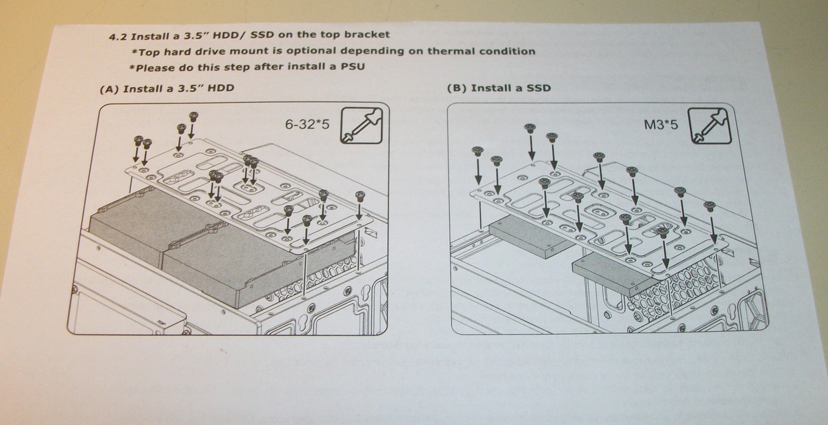 Up for sale is the top hard drive / SSD bracket for use with Cooler Master Elite 110 ITX cases – it is unused and was left over from a build which did not require a 3.5″ or 2.5″ drive. It may be compatible with other Cooler Master cases, but please check with Cooler Master for compatibility with your case BEFORE you purchase this item. It will hold either 2 3.5″ hard drives or 2 2.5″ hard drives – see picture of the original manual (not included). It does come with the small bag of screws – Quantity 12 of 6-32 x 5mm for holding the bracket to the case and securing 3.5″ hard drives AND Quantity 8 M3 x 5mm for securing 2.5″ hard drives to the bracket.