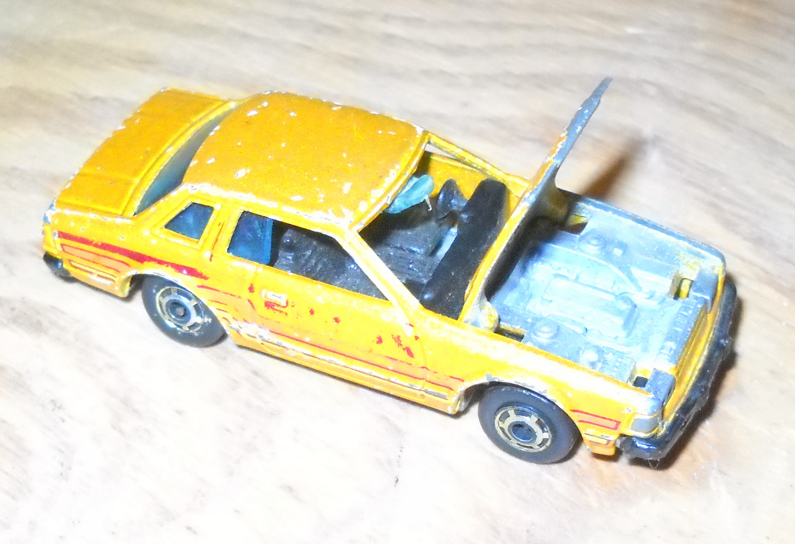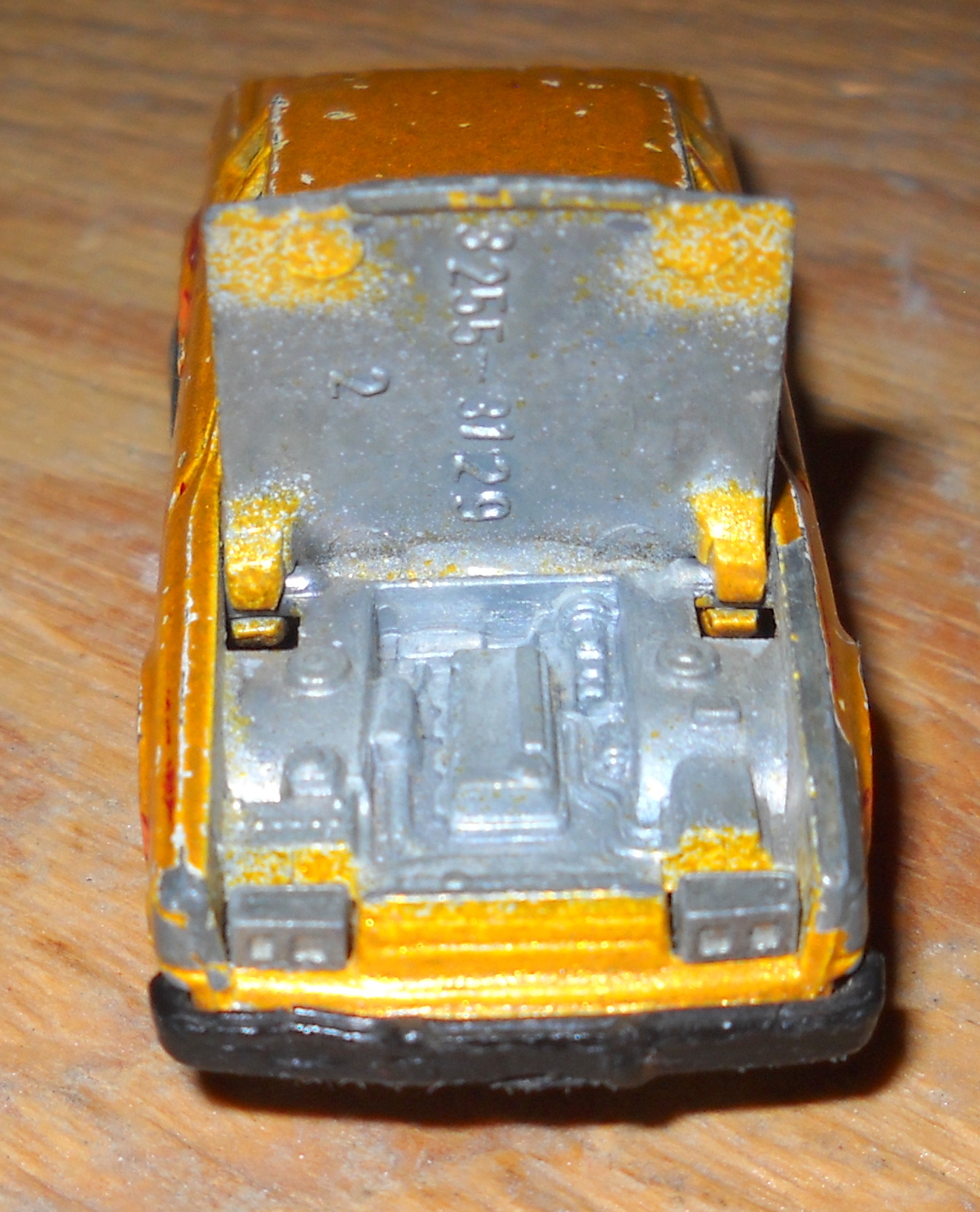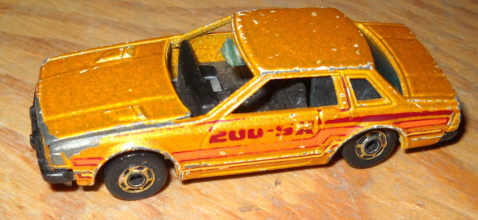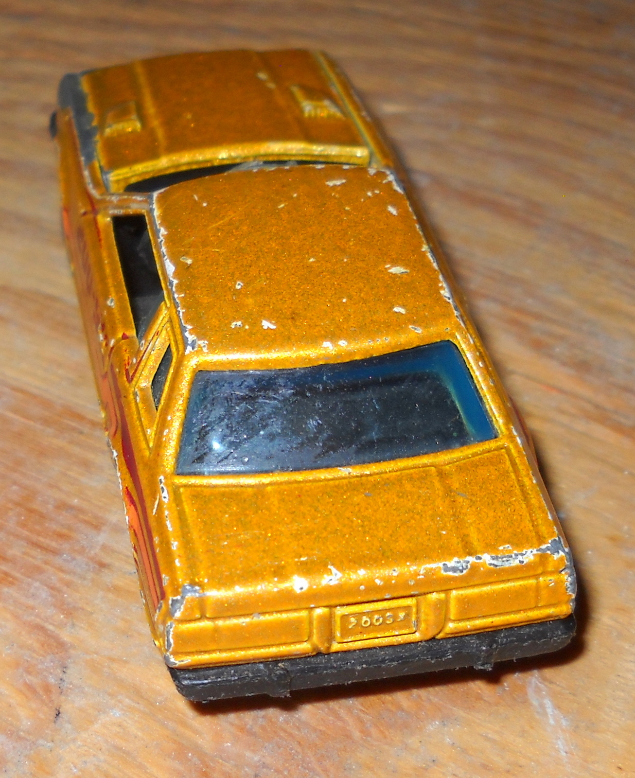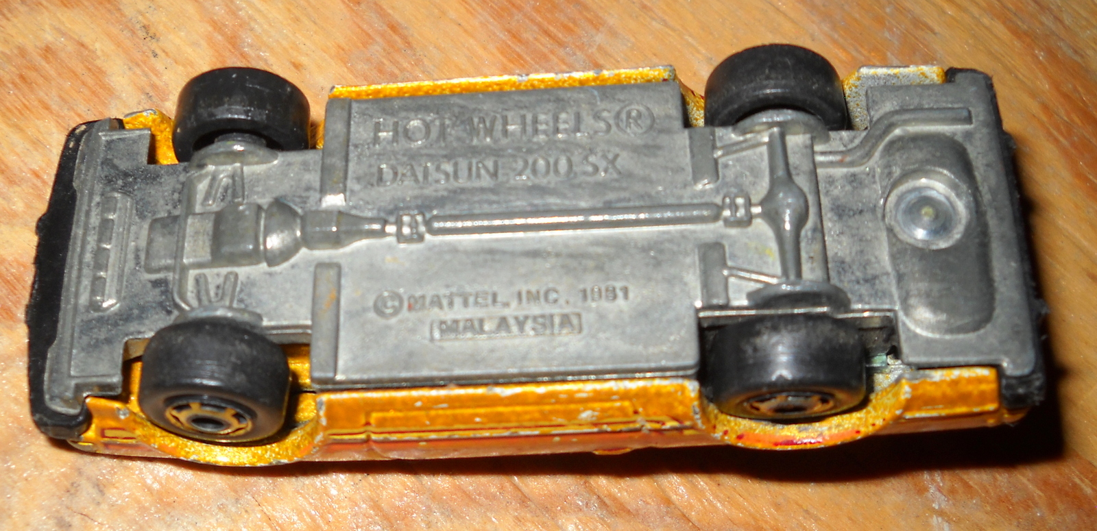 Up for sale is a 1:64 Replica gold Datsun 200 SX car manufactured by Mattel / Hot Wheels in Malaysia in 1981. Lots of scrapes, scratches, wear, missing the windshield, wheels are pushed up into the underside of the car, but it still rolls, just not very well – LOOK AT THE PICTURES!