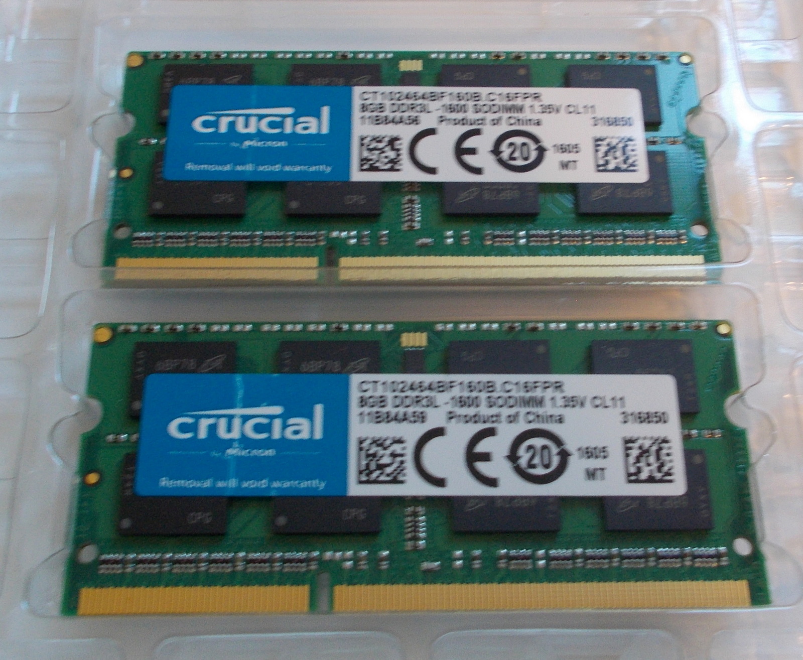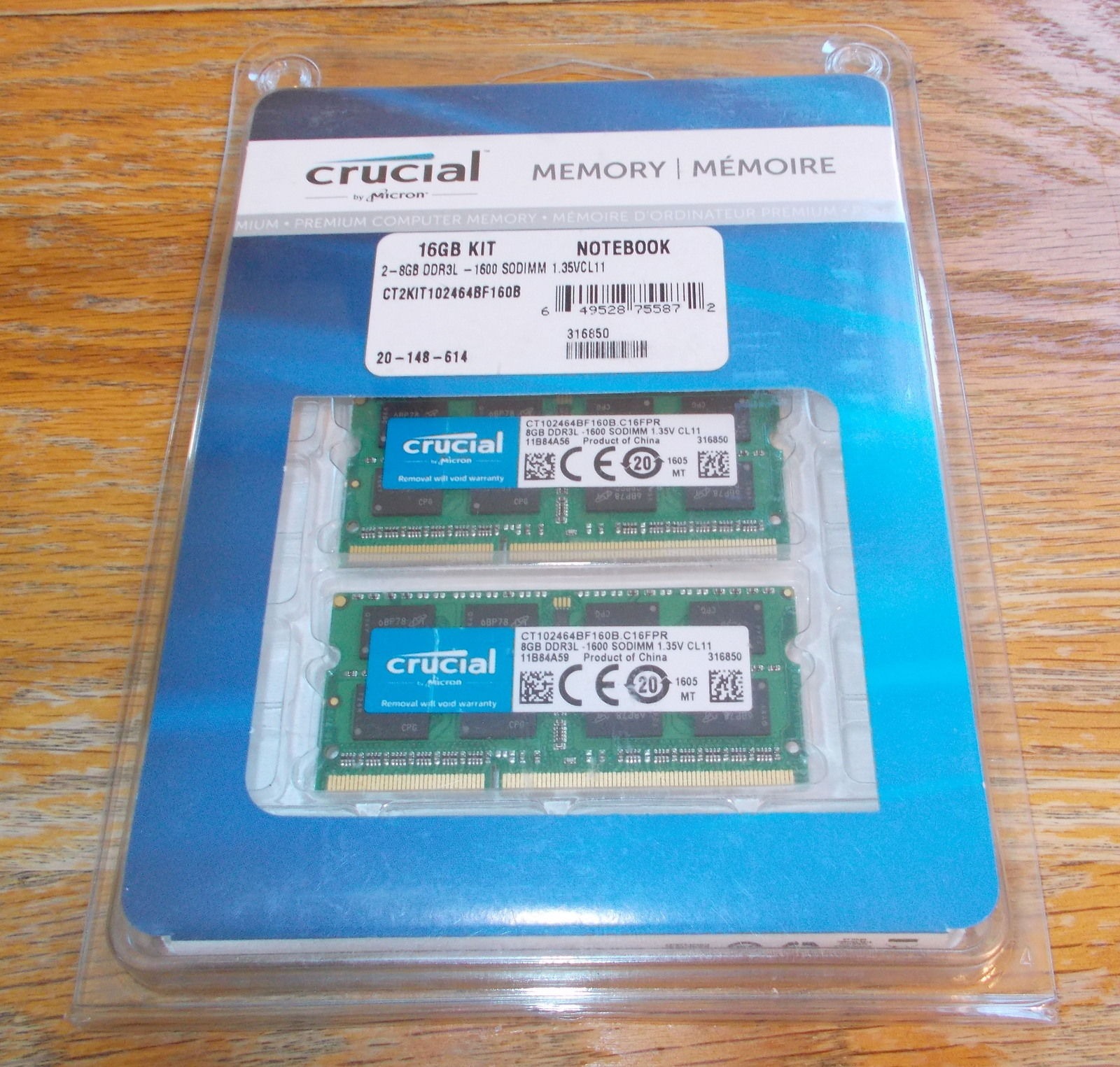 Up for sale is a 16GB kit of Crucial DDR3L-1600 SODIMM Memory RAM modules – we purchased these back in 2016 with the intention of using them to upgrade a laptop, however, we never got around to installing them. So, we’re offering them on the internet in hopes that someone out there can use ’em. Please check with the manufacturer of your computer for compatibility BEFORE you make your decision to purchase. You get one 16GB kit.