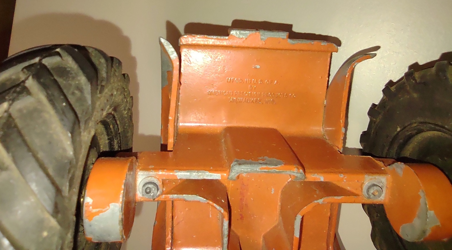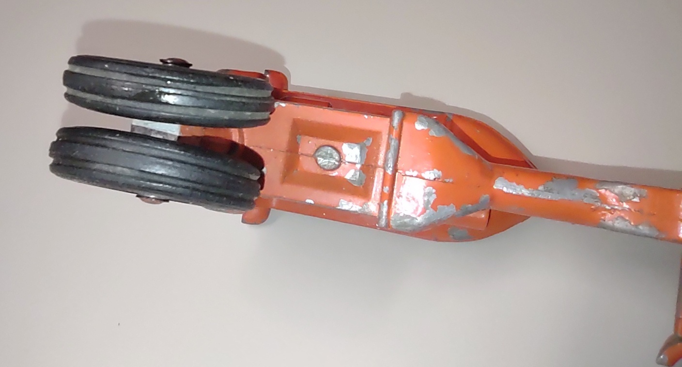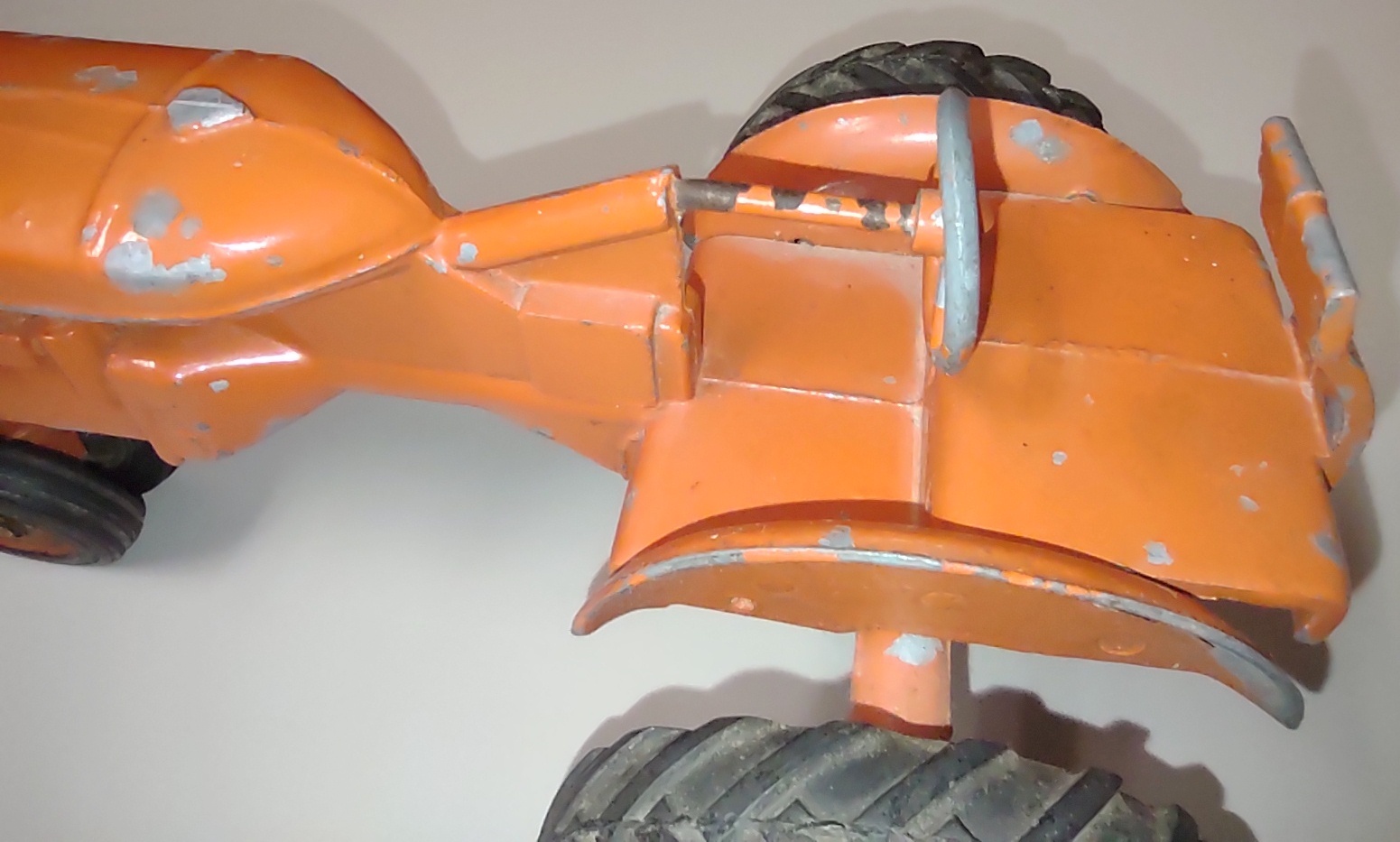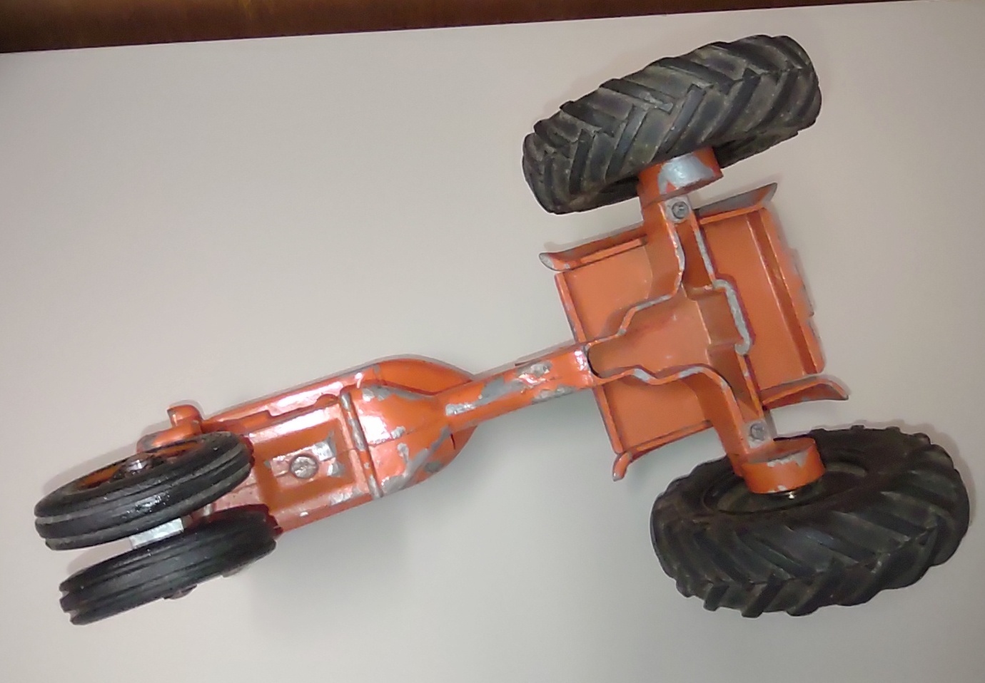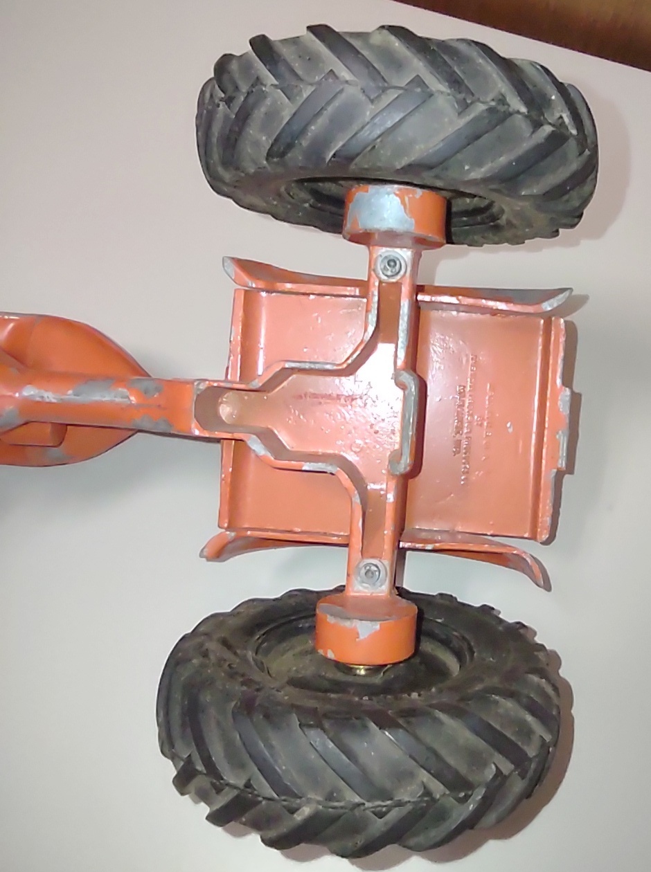 This tractor measures about 7 1/2″ long by about 5″ wide (measured at the rear wheels) by about 4 1/4″ tall.