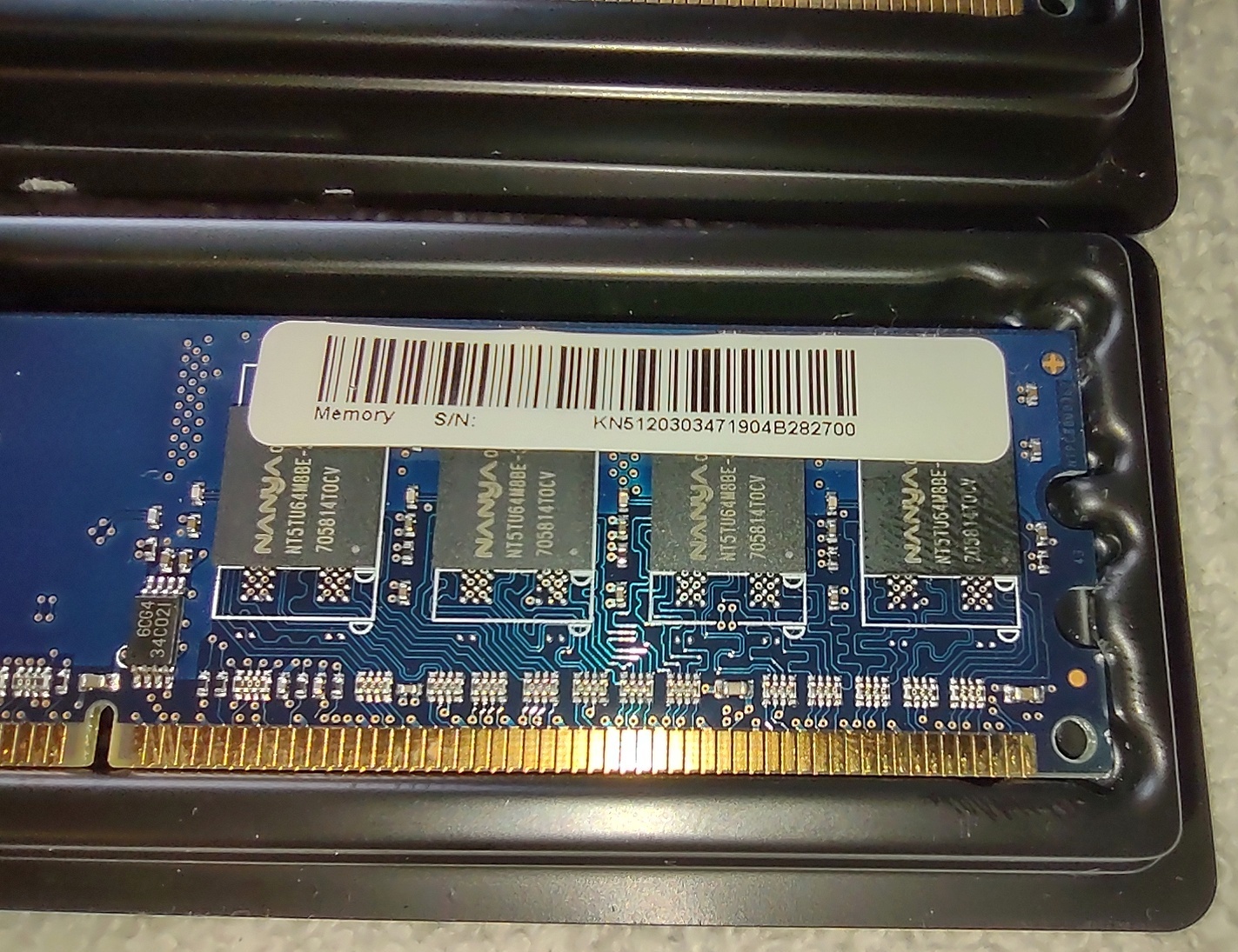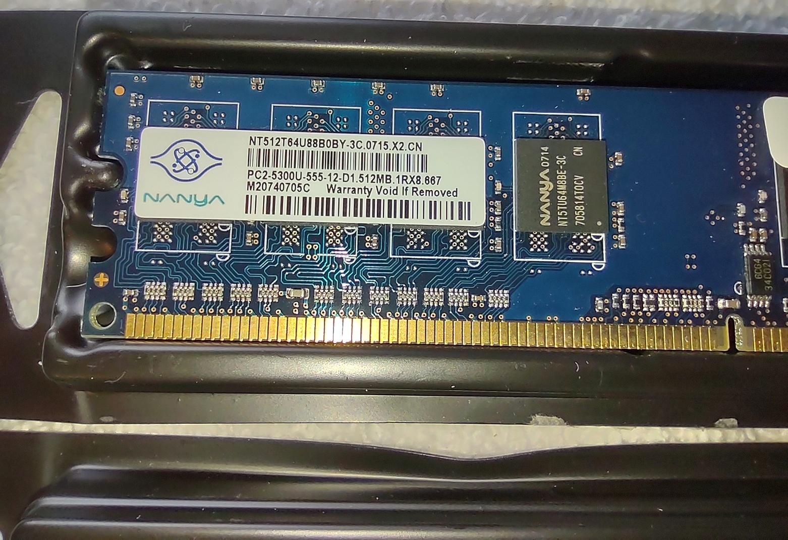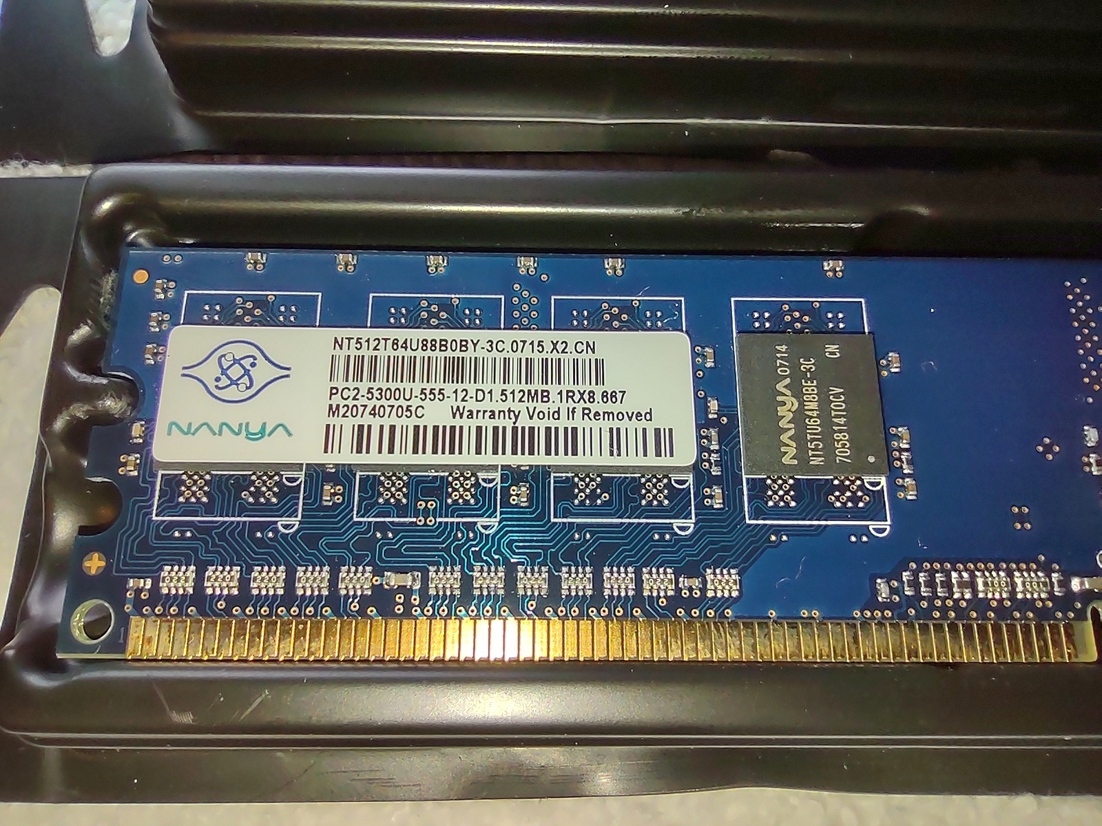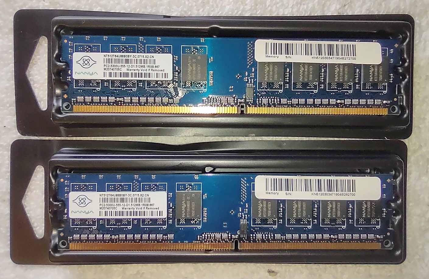 Up for sale is a lot of 2 512MB modules (1GB total capacity) of Nanya PC2-5300 Desktop Memory RAM. This pair was pulled from a computer that was upgraded back in 2014 and has sat on the shelf since – hopefully someone out there can put them to use.