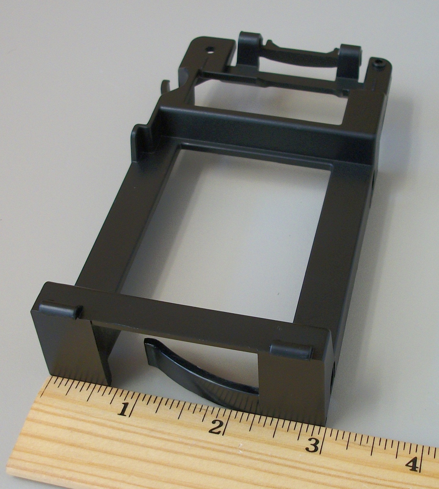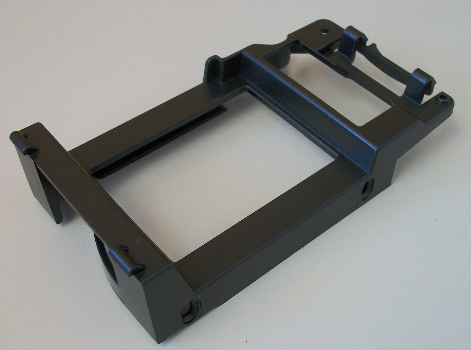 Up for sale is an internal bracket for 2.5″ solid state drives or 2.5″ hard drives from a Corsair Obsidian 750D computer case. It holds one 2.5″ drive. This is in unused condition – hope someone out there on the internet can put it to use! A conventional 2.5″ hard drive is able to fit into this bracket, but it’s held in by tension from the plastic clips and does not have any screws, so for a mechanical drive, it might be better to mount it elsewhere and only use this for SSDs as it might damage a conventional drive – USE IN THIS WAY AT YOUR OWN RISK! This bracket also might be useful in your own custom creation – it measures about 5.5″ long x 2 15/16″ wide x 1 7/16″ thick (at the thickest point) and is black plastic.