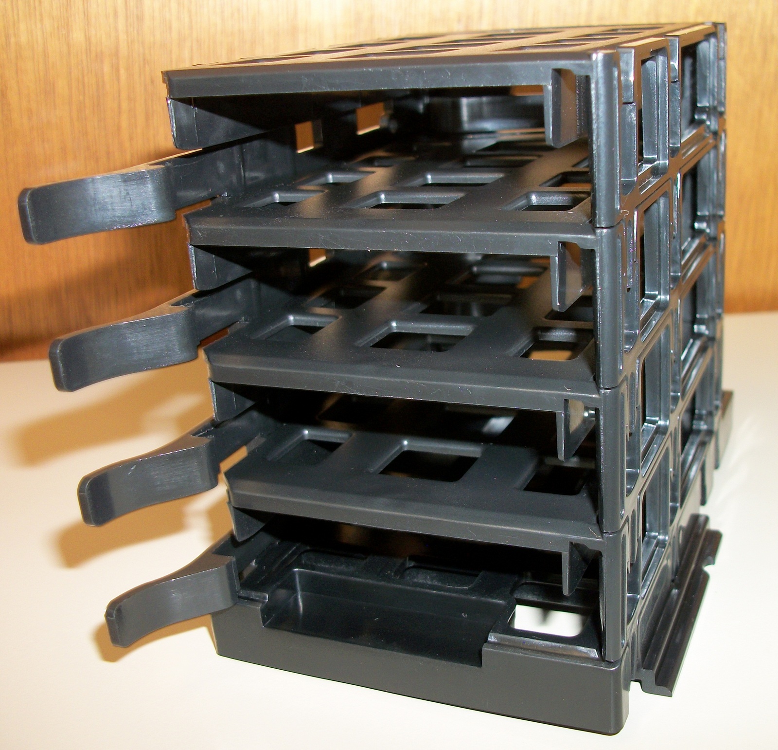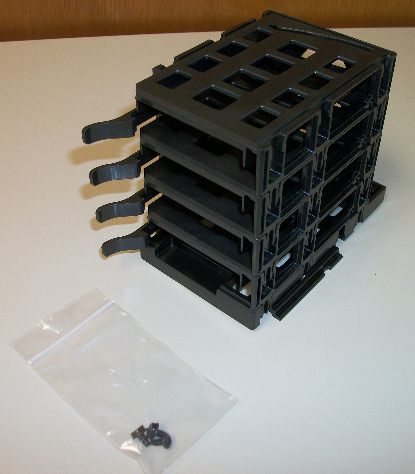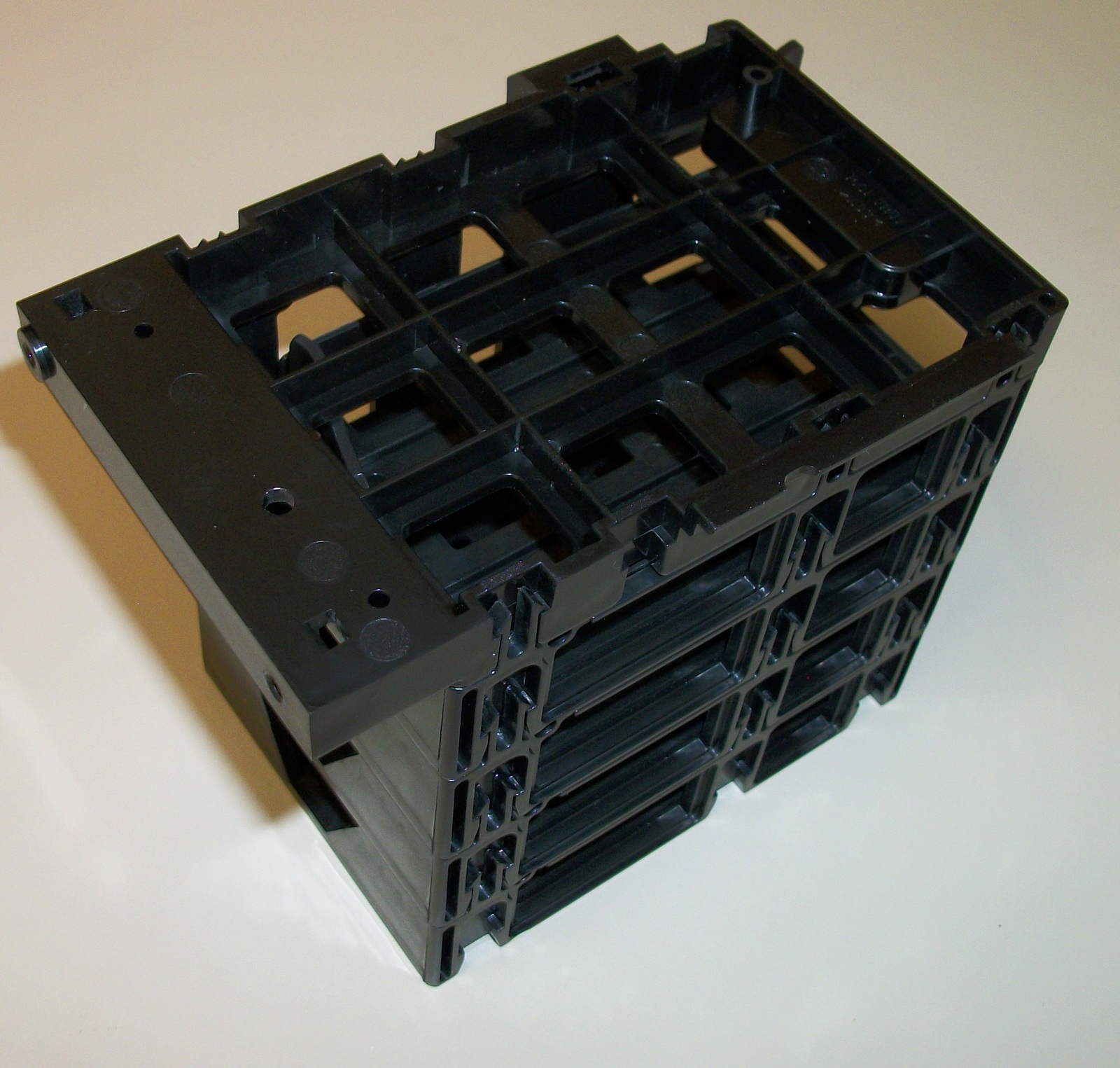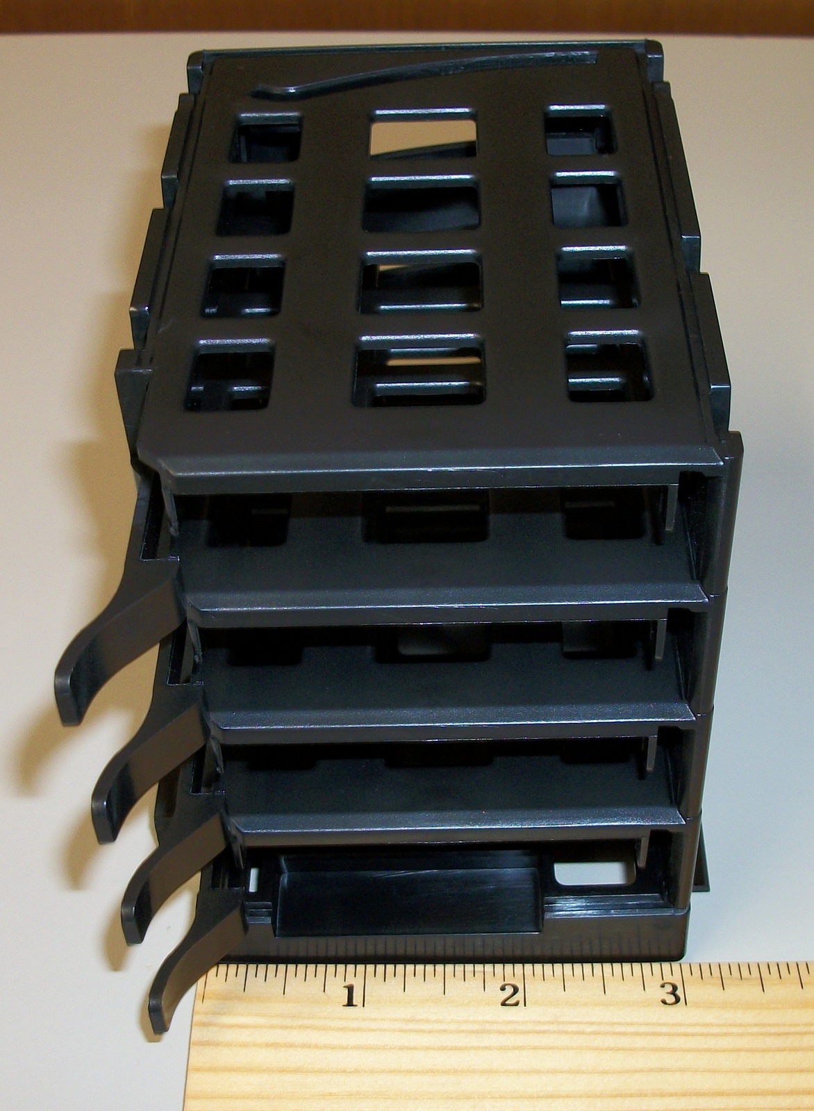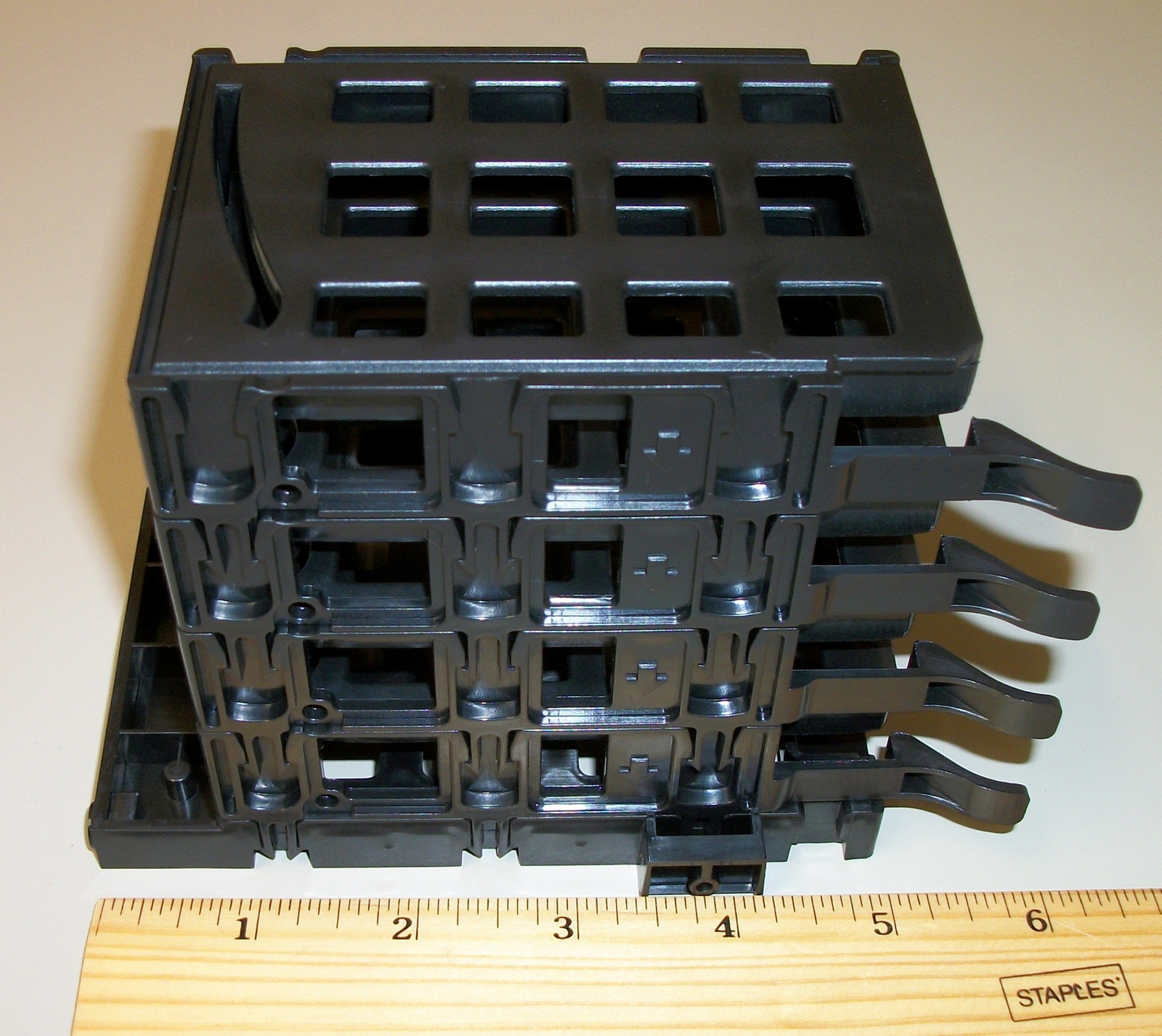 Up for sale is an SSD bracket for use with Corsair Crystal 680X RGB cases. It holds 4 2.5″ drives (SSDs) and is made out of black plastic. This may fit other cases, but we’re not for certain – you should check with Corsair for compatibility with your case BEFORE you purchase this one. You might be able to use it with your own custom creation. It measures about 3 inches wide by about 5 1/4 inches long (to the end of the clip) by about 4 3/16 inches tall. You could try to install mechanical 2.5″ drives, but it probably wouldn’t be a good idea since the plastic clips which hold the drives into the cage would put pressure on the mechanical drives which might not be a good idea – if you decide to install mechanical drives, do so at your own risk!