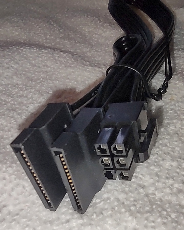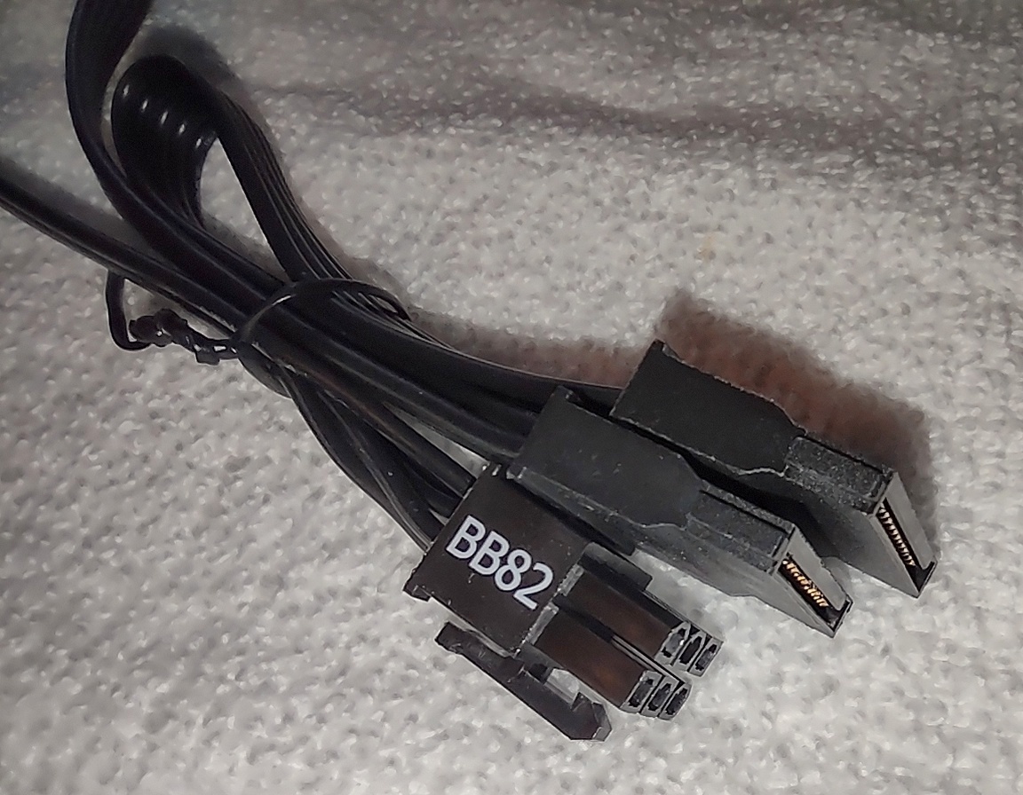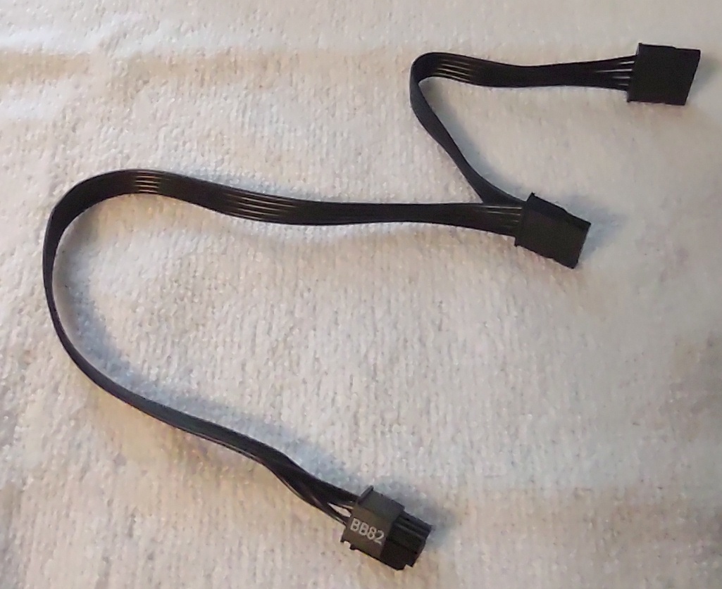 Up for sale is an original cable for use with a Seasonic Core GM-550 Power Supply. BB82. This cable has 2 SATA power connector ends. This cable is pretty short in that it measures about 19″ long overall with about 12.5″ between the plug which connects to the power supply and the first SATA plug and another 6.5″ to the plug on the end. This may be compatible with other power supplies, but please check with your manufacturer for compatibility BEFORE you purchase this item.