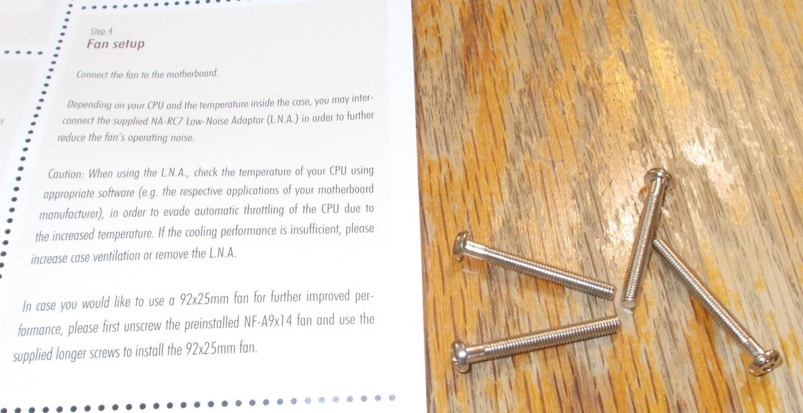 Up for sale is a lot of four 26mm long cooling fan screws for a Noctua NH-L9a-AM4 Low Profile L-Type CPU Cooler. These are for using an optional 92x25mm tall fan with the cooler instead of the included NF-A9x14mm fan. M3 Thread x 26mm long with Phillips heads. These are in unused condition and are left over from system builds. We hope someone out there on the interwebs can put them to use! The page from the instruction booklet is NOT included – just in the picture to show you how the screws are meant to be used.