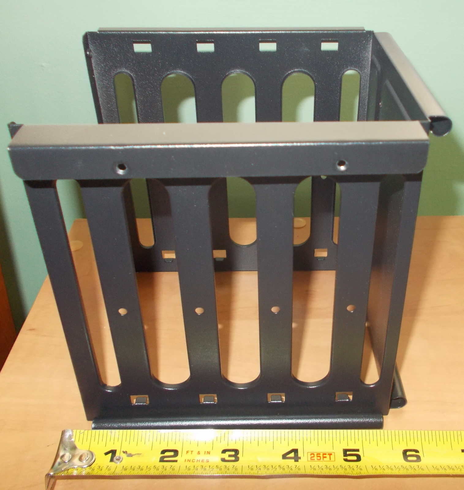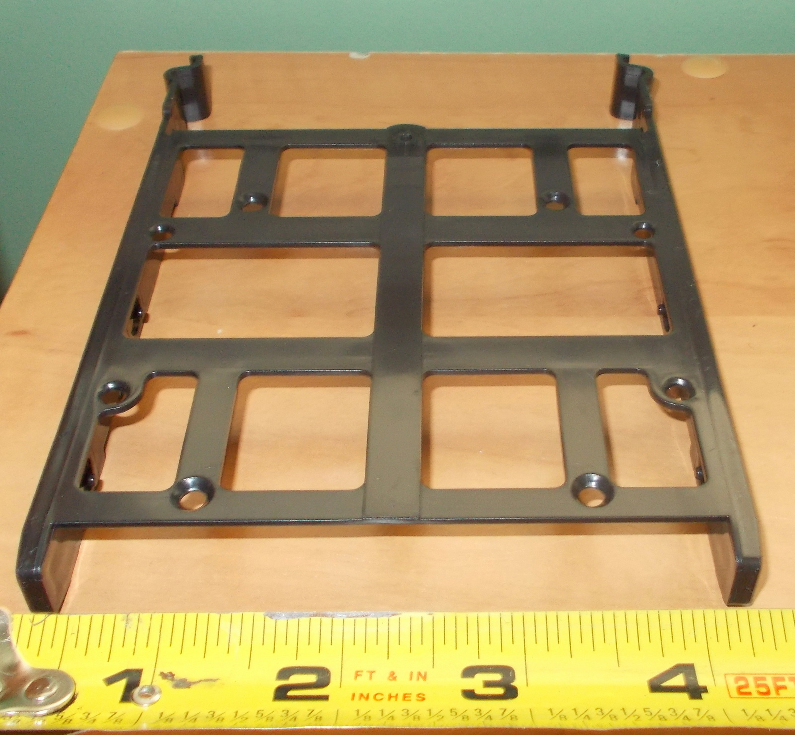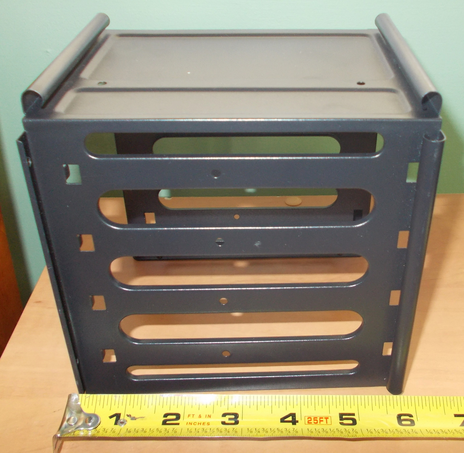Up for sale is an internal bracket for 3.5″ hard drives or 2.5″ solid state drives from a Corsair Carbide 100R computer case. It holds 4 x 3.5″ drives OR 4 x 2.5″ drives. The fasteners which screw the cage to the case are included as are the screws for attaching 2.5″ drives to the sleds. 3.5″ drive do not need screws as there are plastic nubs which fit into the screw holes on 3.5″ drives. We removed this bracket from a build which did not require 3.5″ or 2.5″ hard drives. Hope someone out there on the internet can put it to use! It also might be useful in your own custom creation – it measures about 6″ x 5.5″ x 5.5″ and is black.