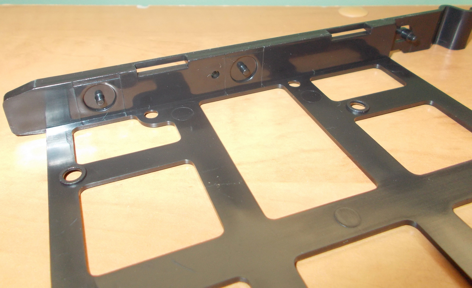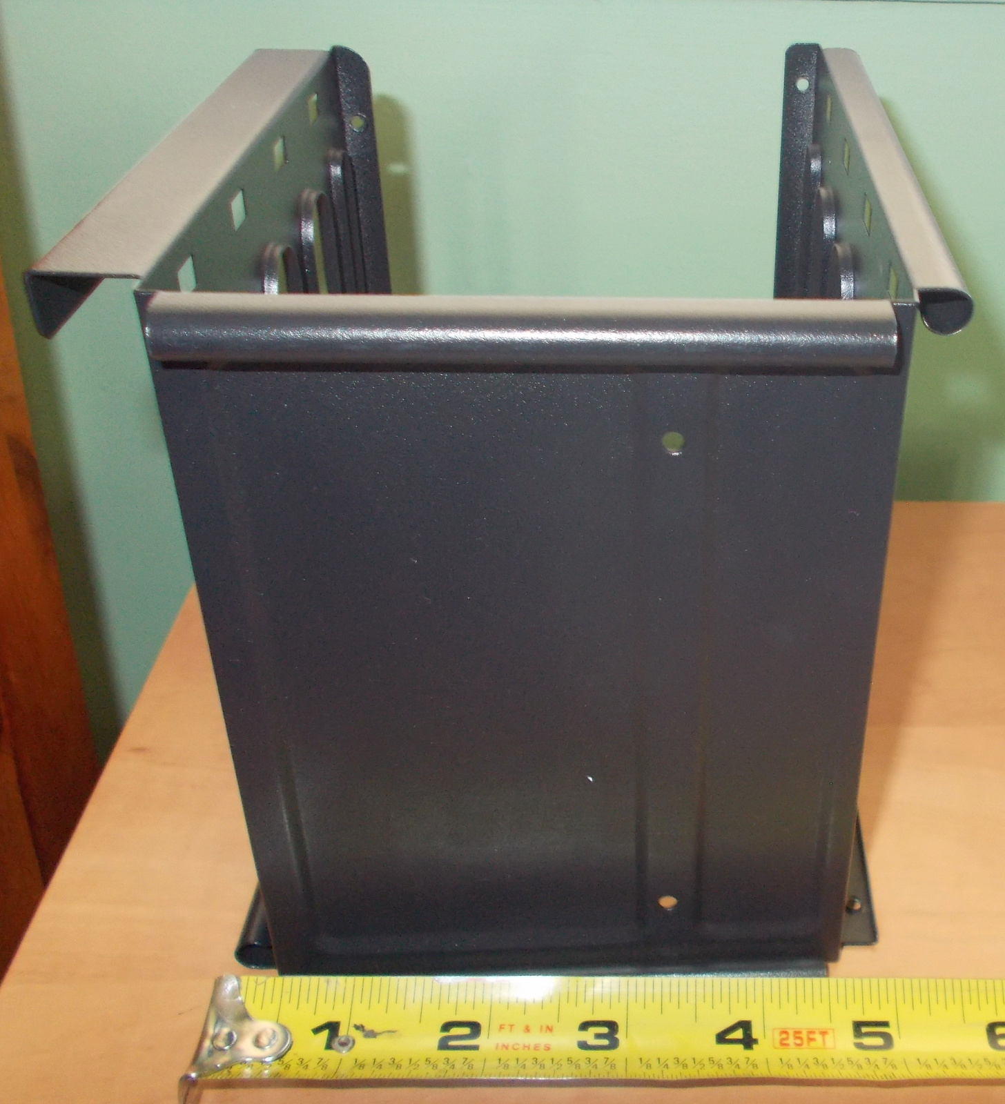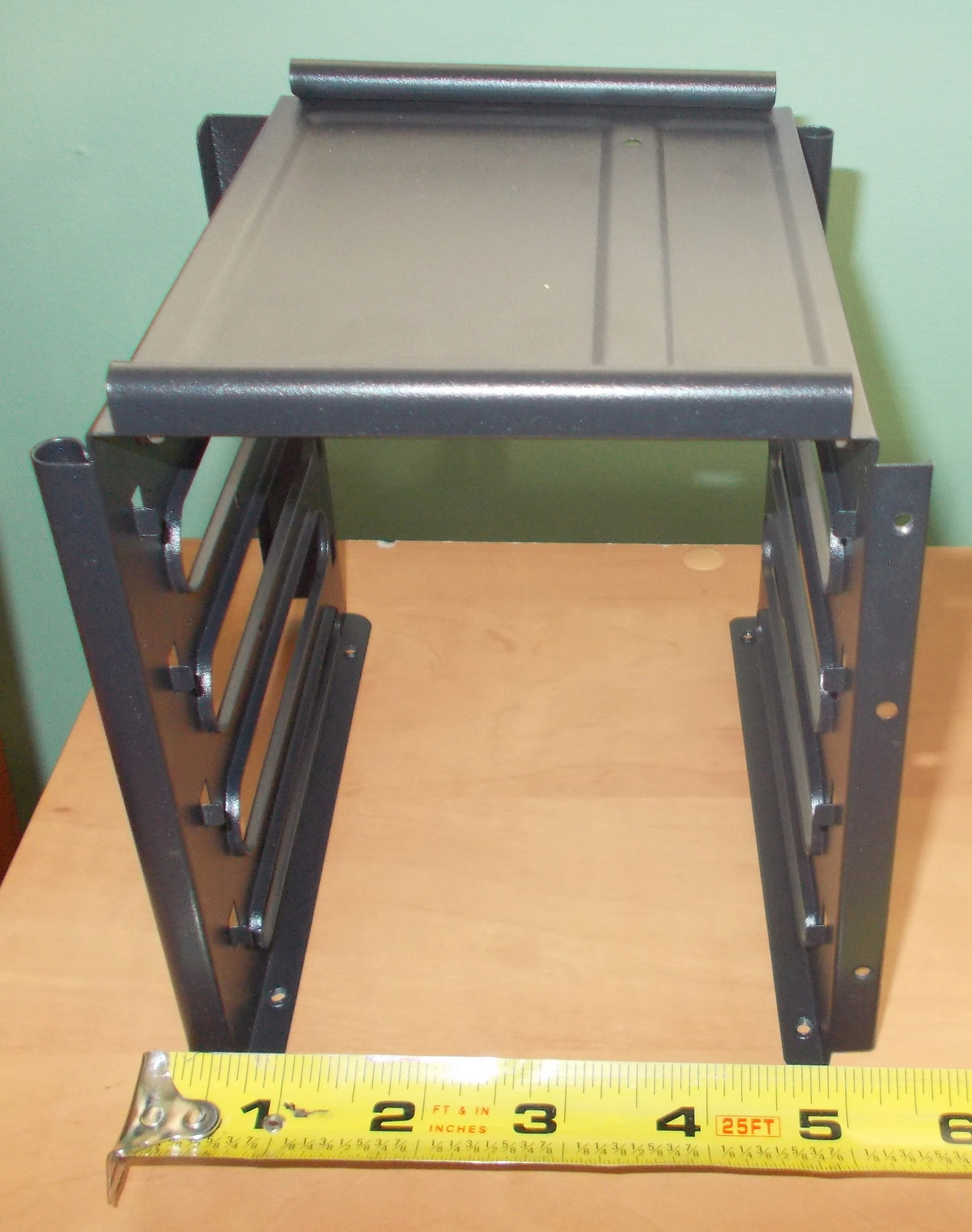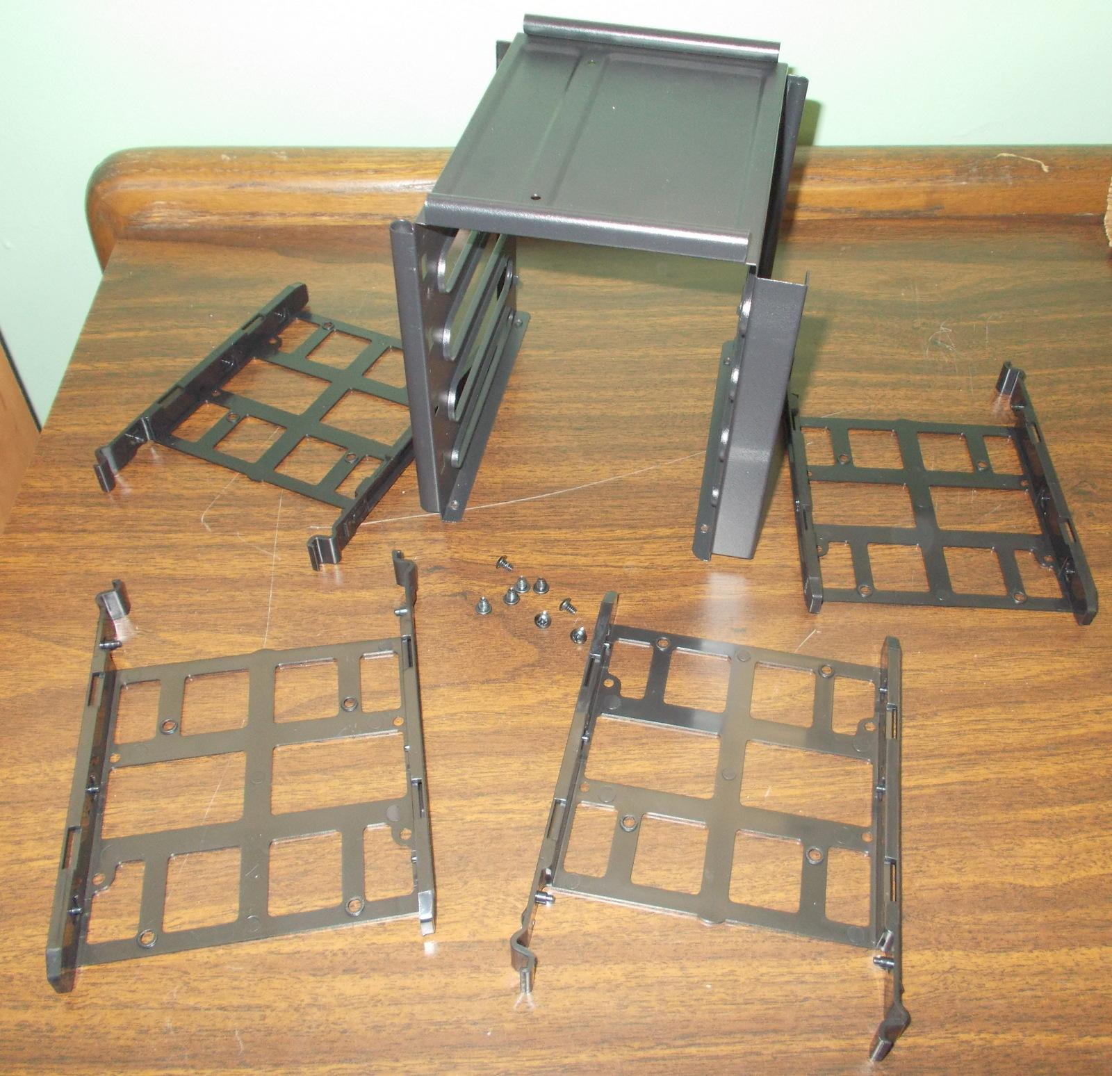 Up for sale is an internal bracket for 3.5″ hard drives or 2.5″ solid state drives from a Corsair Carbide 100R computer case. It holds 4 x 3.5″ drives OR 4 x 2.5″ drives. The fasteners which screw the cage to the case are included as are the screws for attaching 2.5″ drives to the sleds. 3.5″ drive do not need screws as there are plastic nubs which fit into the screw holes on 3.5″ drives. We removed this bracket from a build which did not require 3.5″ or 2.5″ hard drives. Hope someone out there on the internet can put it to use! It also might be useful in your own custom creation – it measures about 6″ x 5.5″ x 5.5″ and is black.