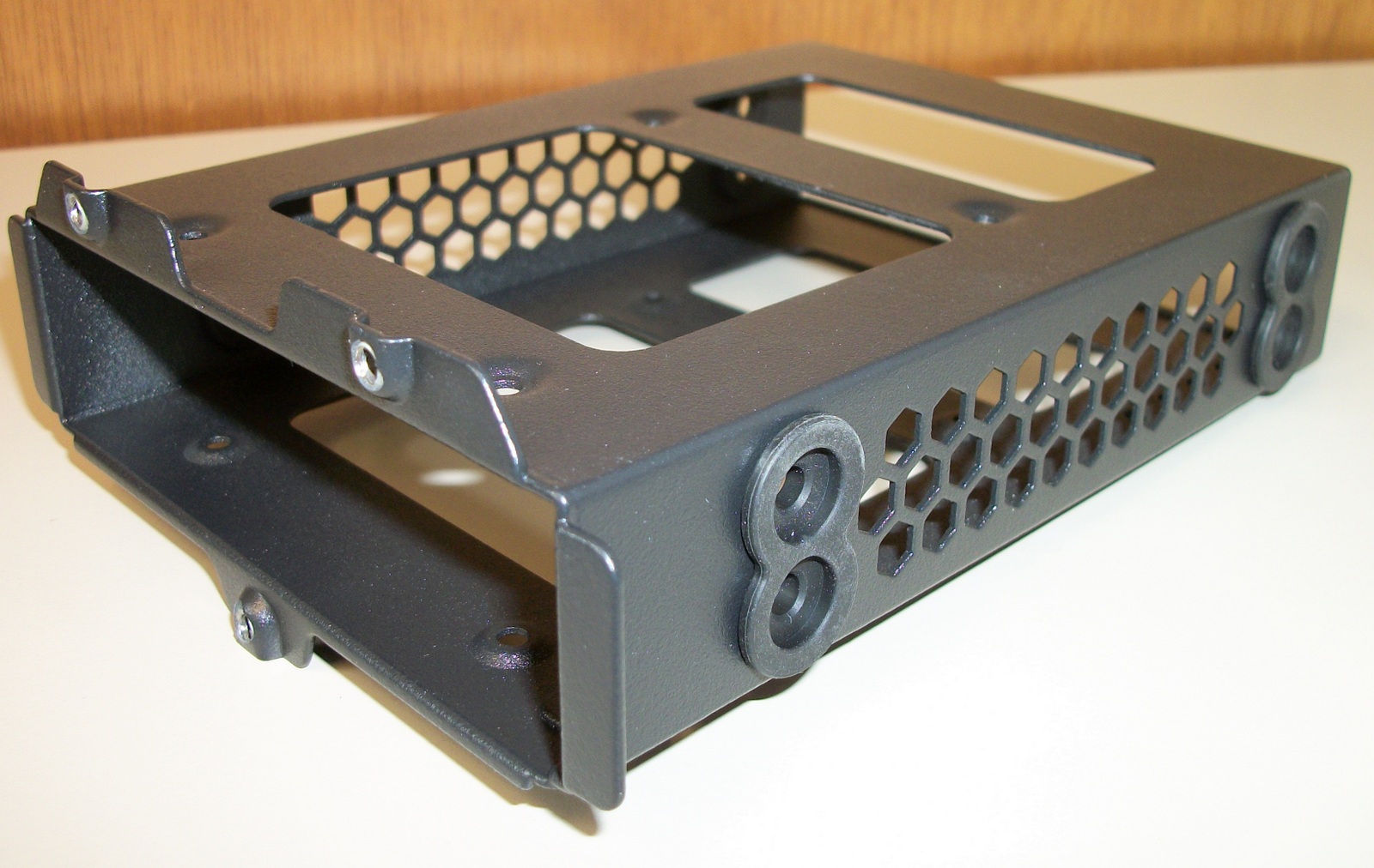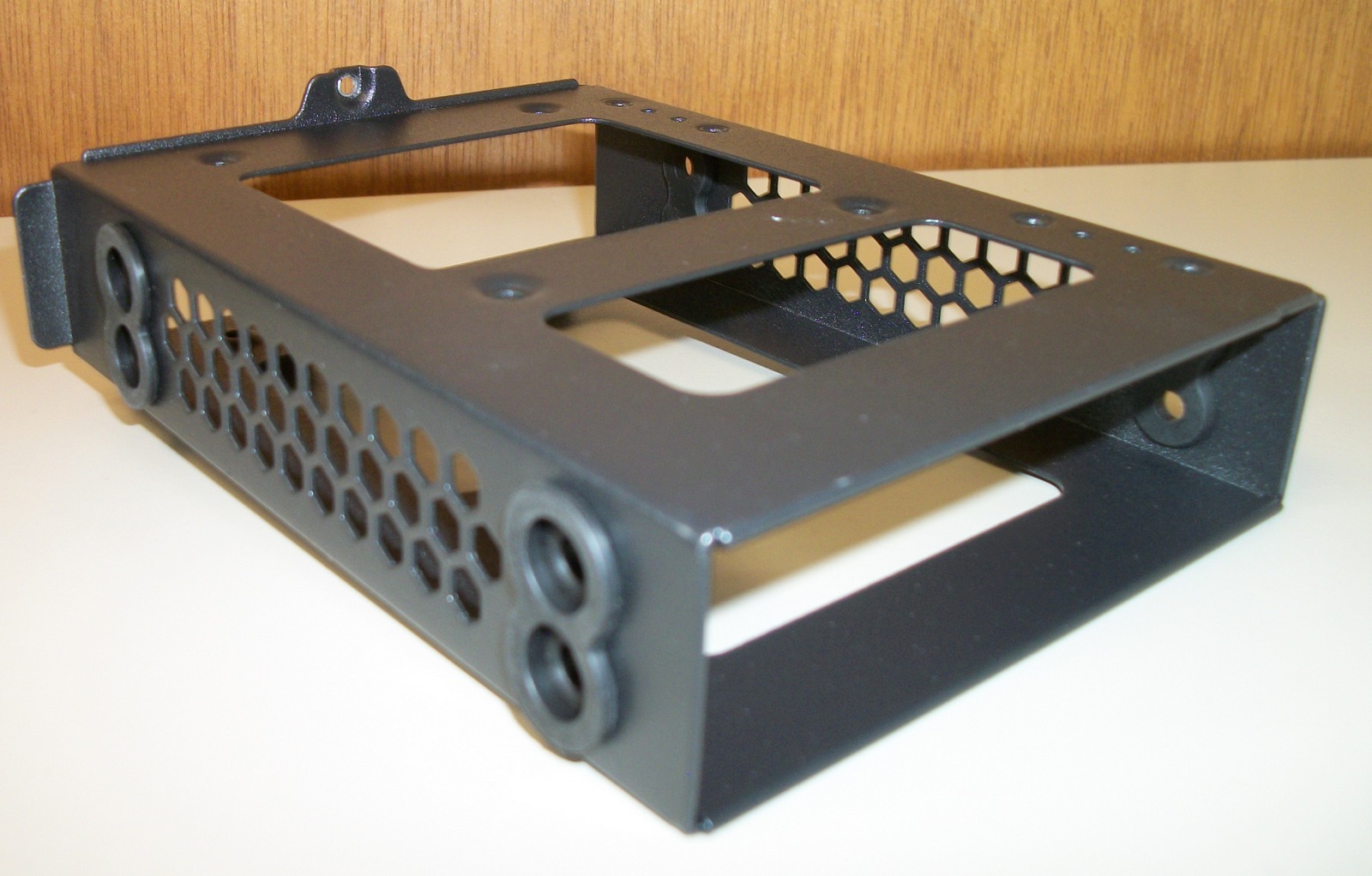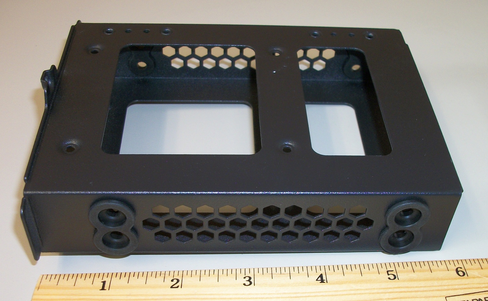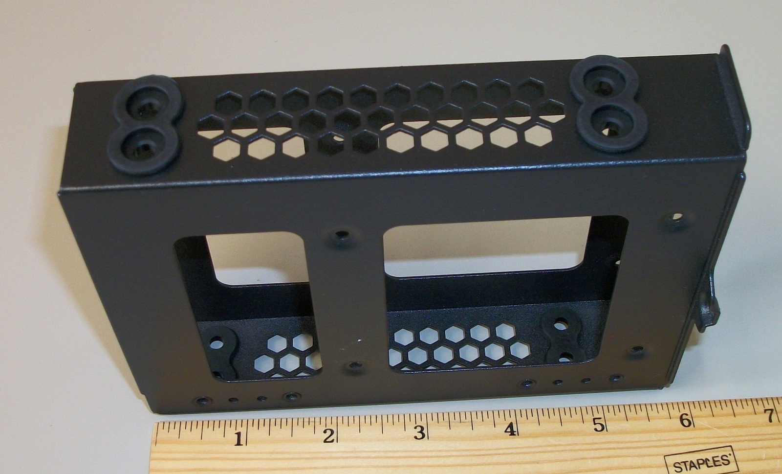 Up for sale is an internal bracket for 3.5″ hard drives from a Corsair Carbide 678C computer case. It holds one 3.5″ drive. Hope someone out there on the internet can put it to use! A conventional 3.5″ hard drive is able to fit into this bracket and you can mount two 2.5″ drives in the bracket – they screw in from the top and bottom. Fasteners for the drives are NOT included and you would need to provide your own. This bracket also might be useful in your own custom creation – it measures about 6″ long x 4.25″ wide x 1 1/4″ thick and is black steel. This comes with three thumb screws to fasten the bracket to the case – see pictures!