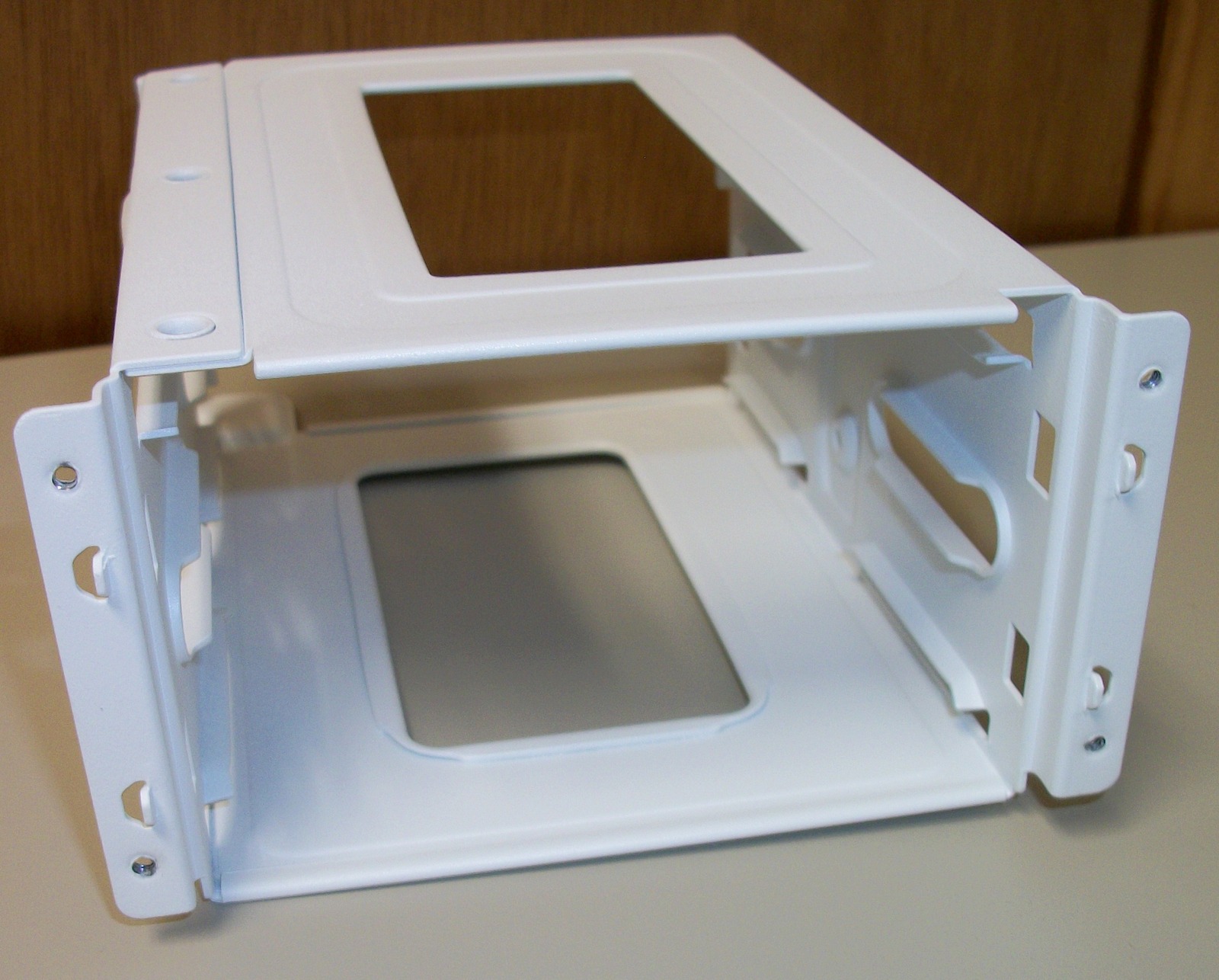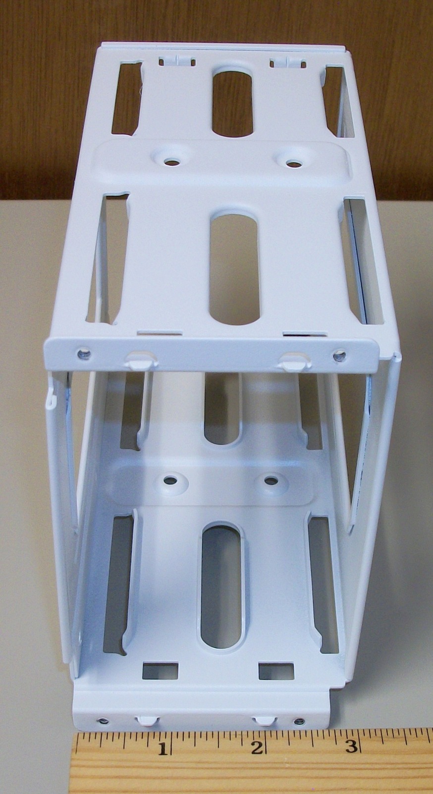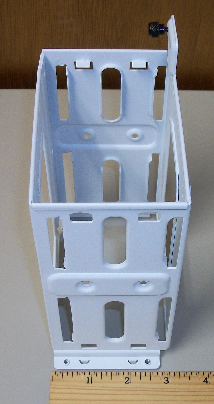 Up for sale is a white metal internal bracket for 3.5″ hard drives for a Corsair Crystal 280X RGB computer case. It holds 2 x 3.5″ drives. This comes with the four screws pictured and the one thumb screw – see pictures) You will need to provide your own mounting sleds for the drives. Hope someone out there on the internet can put it to use! It also might be useful in your own custom creation – it measures about 3″ tall x 6.25″ deep x 4 1/2″ wide and is made of steel and painted white.
