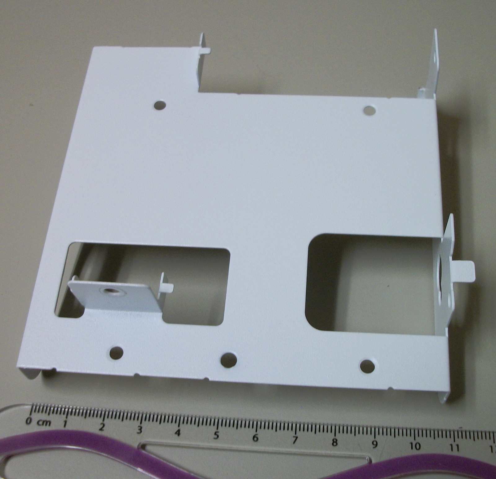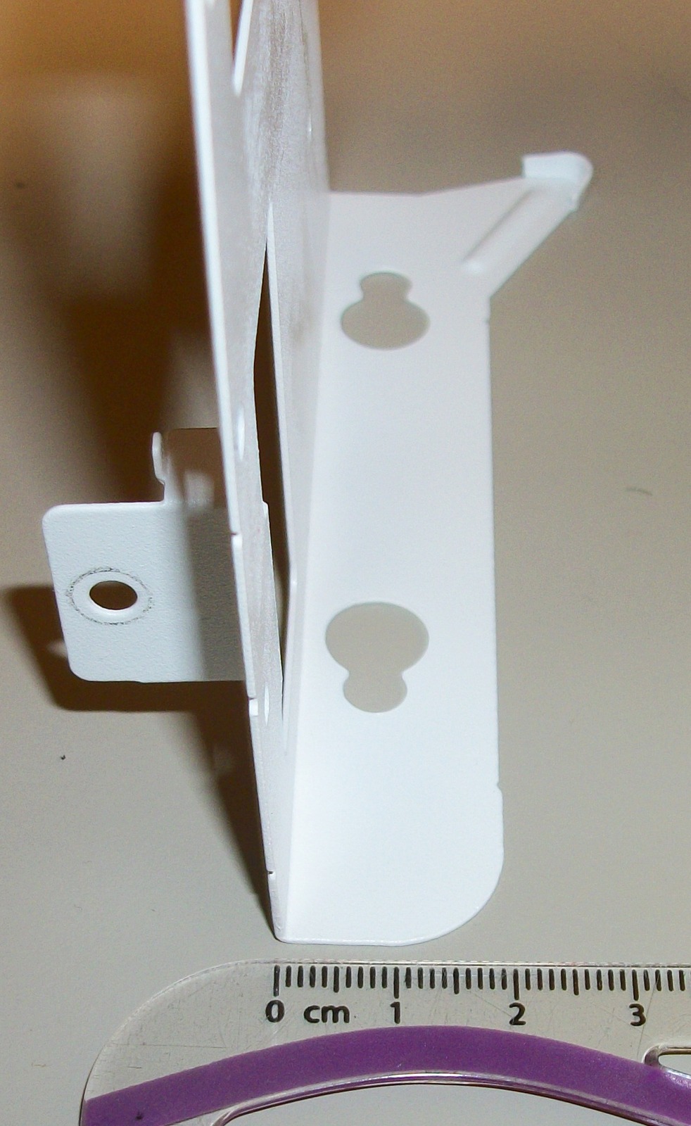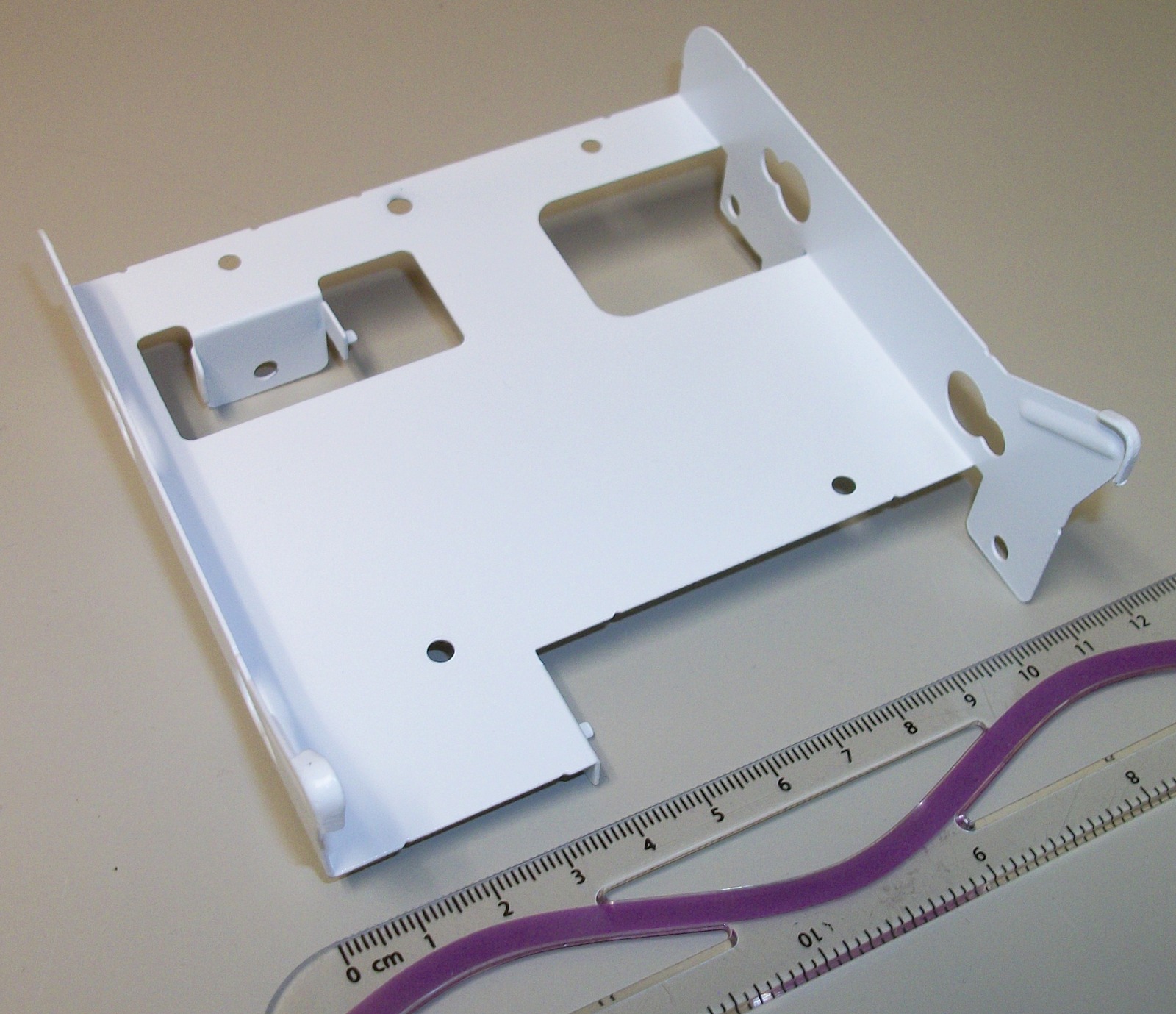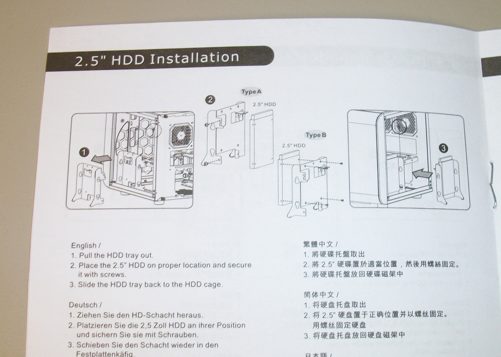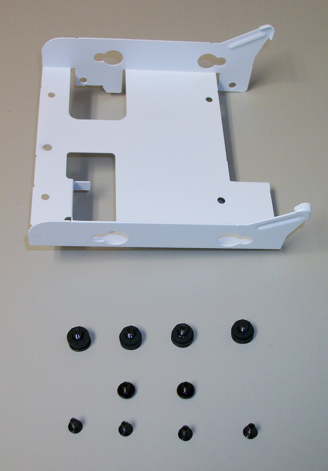 Up for sale is an internal bracket for hard drives from a Thermaltake Core V1 Snow computer case. It holds one 3.5″ drive OR one 2.5″ drive. Hope someone out there on the internet can put it to use! The screws for holding the 3.5″ hard drive and the screws for holding the 2.5″ hard drive are included as is the thumb screw for fastening the bracket to the case (not pictured). This bracket also might be useful in your own custom creation – it measures about 4 3/8″ long x 4.25″ wide x 1 3/4″ thick at the thickest point and is white steel. The last two pictures are of the pages from the manual that show how the brackets fit into the case and how to mount either a 2.5″ drive or a 3.5″ drive. The manual is NOT included.