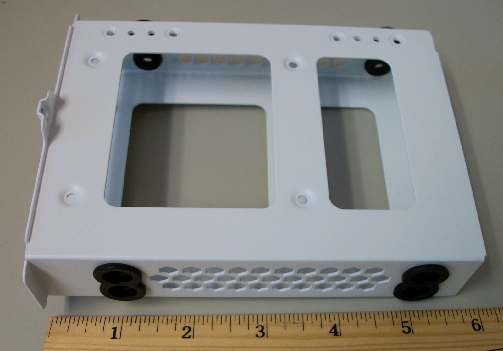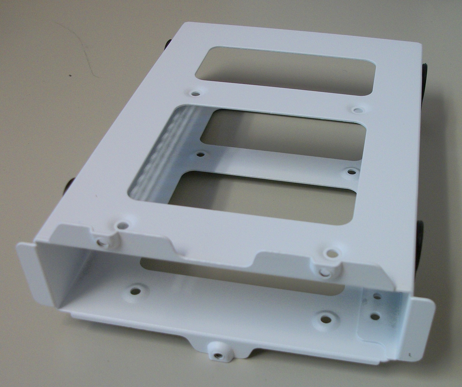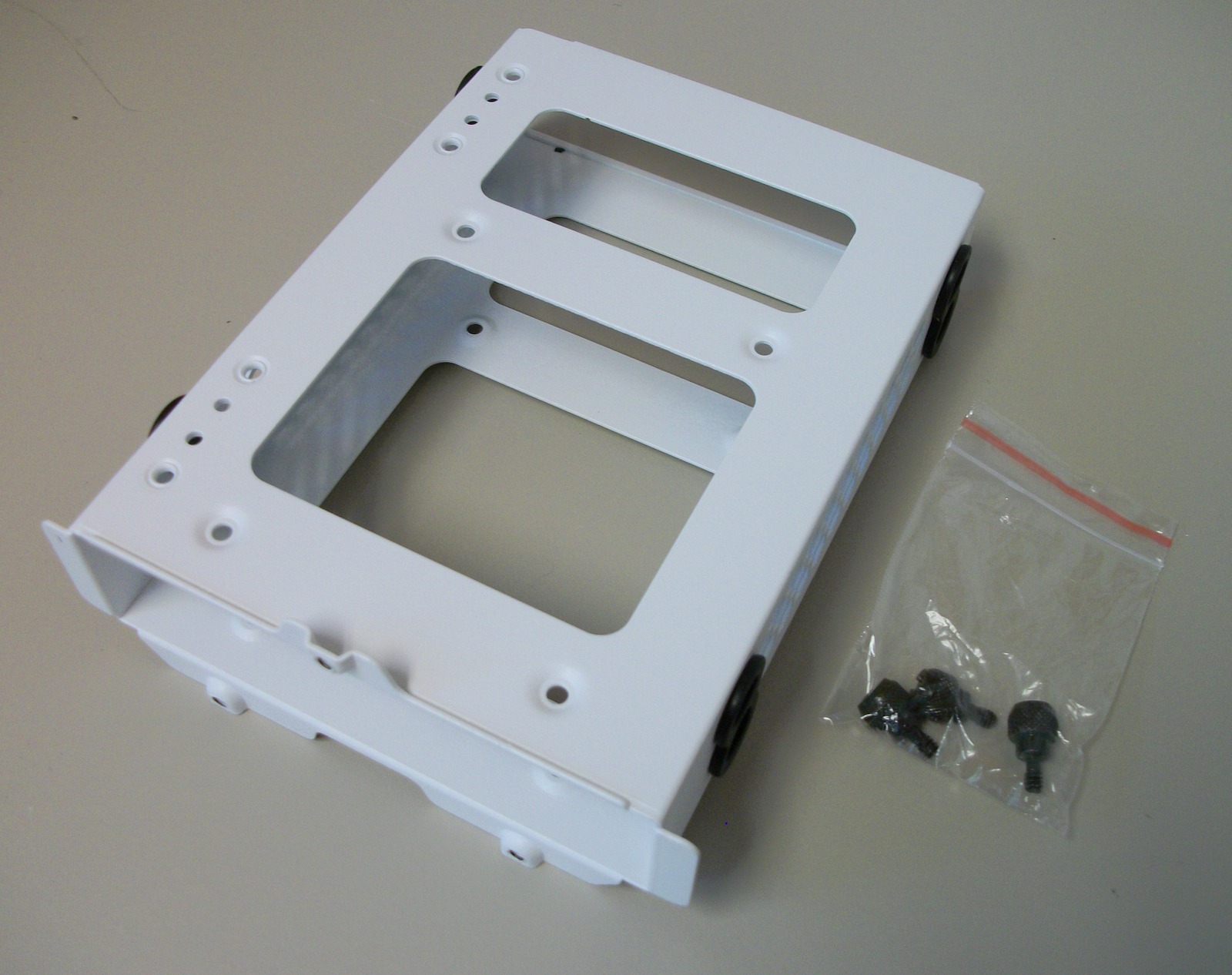 Up for sale is an internal bracket for 3.5″ hard drives from a Corsair Carbide 678C computer case. It holds one 3.5″ drive. Hope someone out there on the internet can put it to use! A conventional 3.5″ hard drive is able to fit into this bracket and you could possibly mount a 2.5″ drive in the bracket if you used an adapter – the adapter is NOT included and you would need to provide your own. This bracket also might be useful in your own custom creation – it measures about 6″ long x 4.25″ wide x 1 1/4″ thick and is white steel. This comes with three thumb screws to fasten the bracket to the case – see pictures!