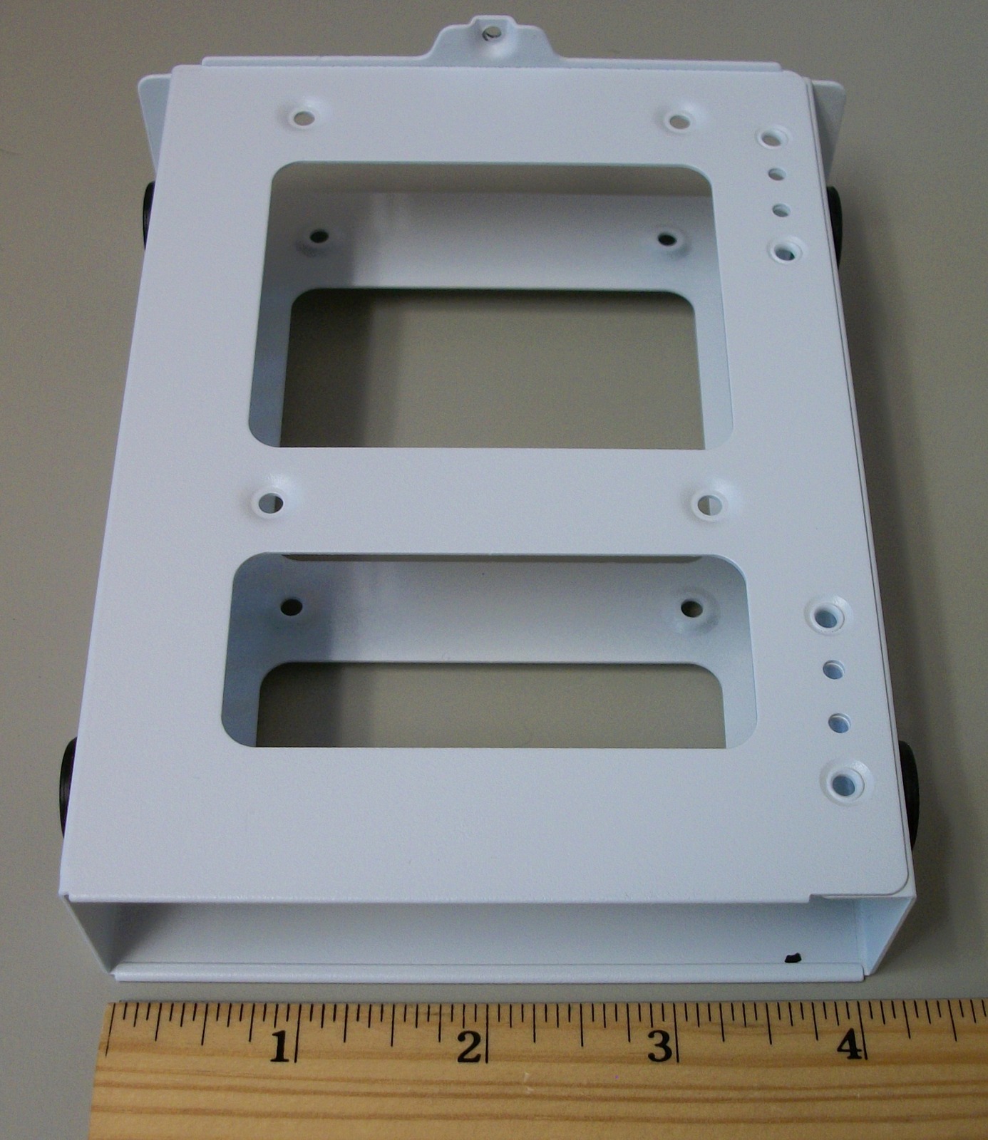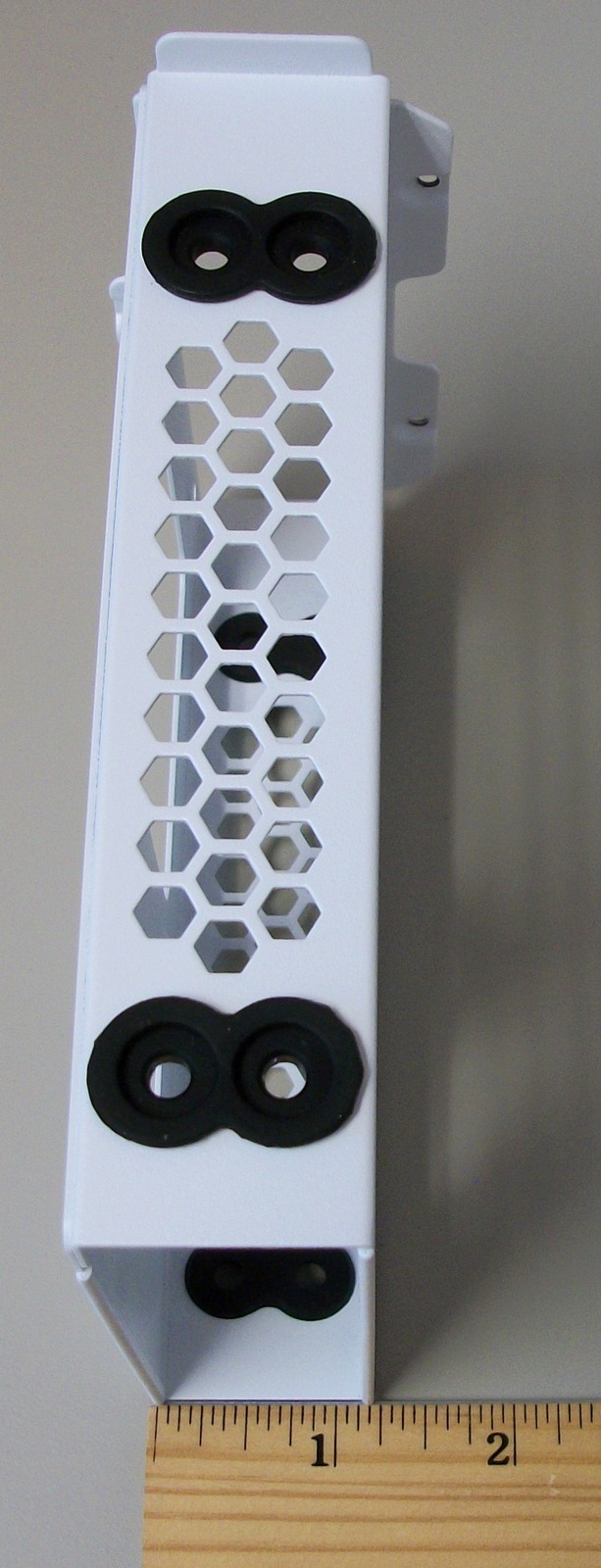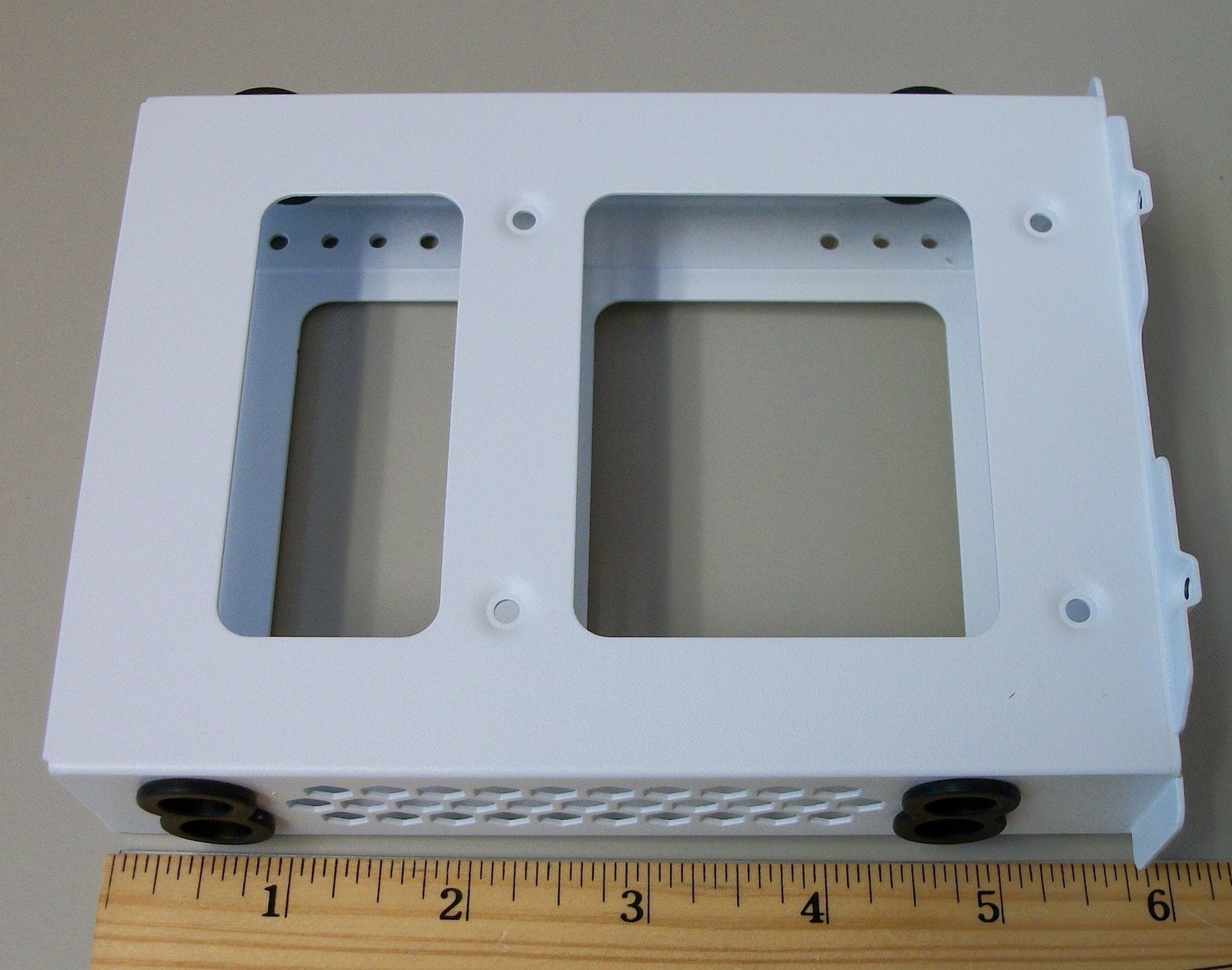 Up for sale is an internal bracket for 3.5″ hard drives from a Corsair Carbide 678C computer case. It holds one 3.5″ drive. Hope someone out there on the internet can put it to use! A conventional 3.5″ hard drive is able to fit into this bracket and you could possibly mount a 2.5″ drive in the bracket if you used an adapter – the adapter is NOT included and you would need to provide your own. This bracket also might be useful in your own custom creation – it measures about 6″ long x 4.25″ wide x 1 1/4″ thick and is white steel. This comes with three thumb screws to fasten the bracket to the case – see pictures!