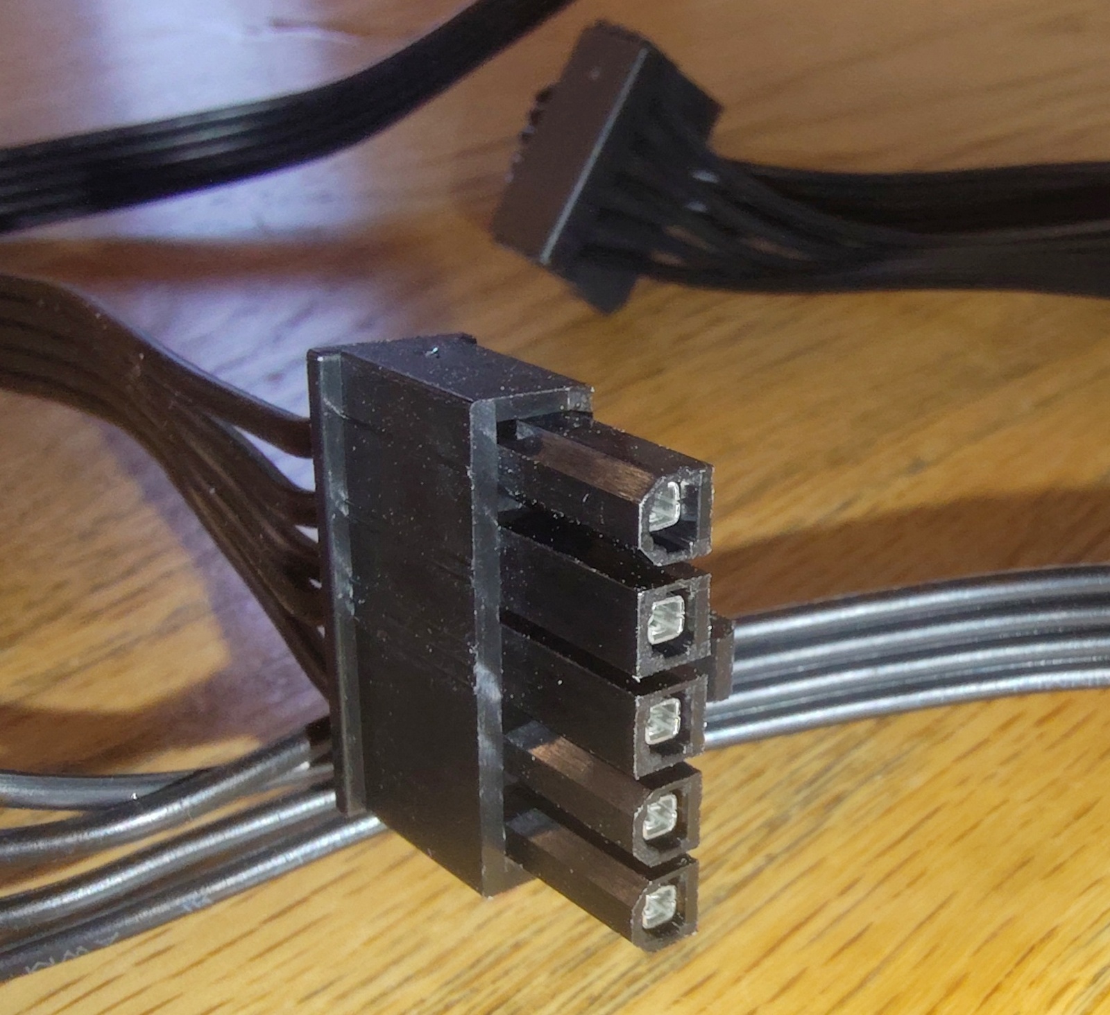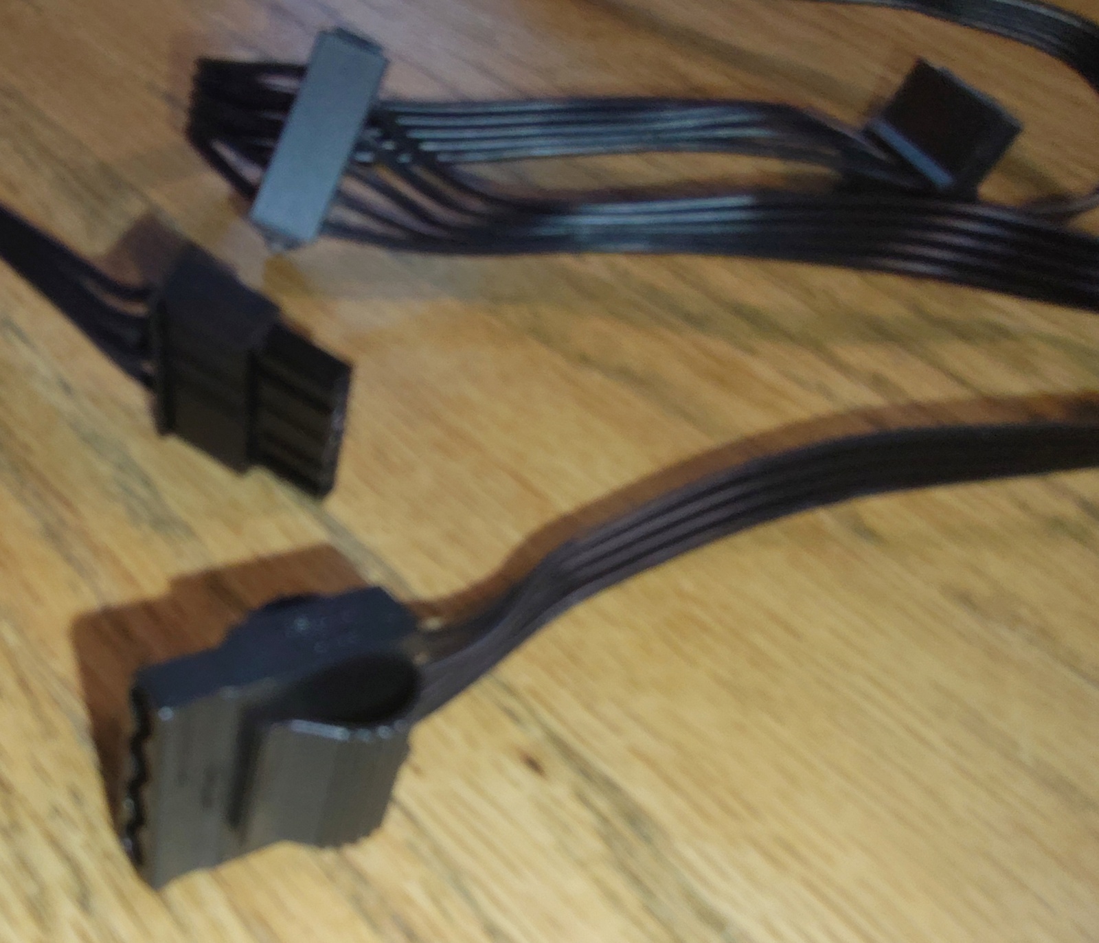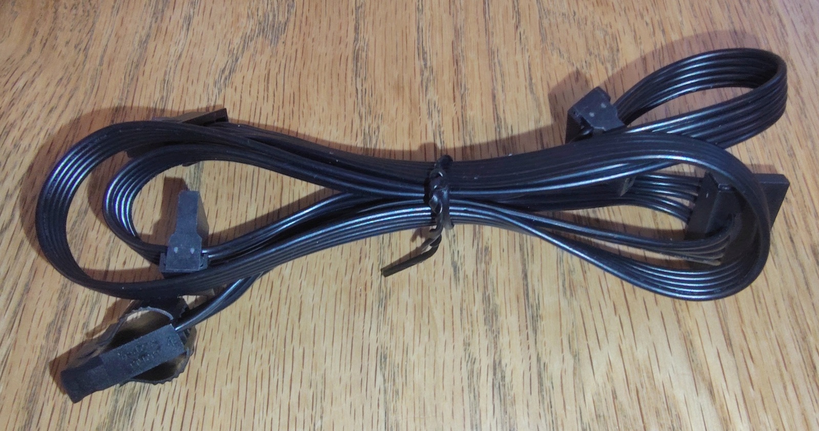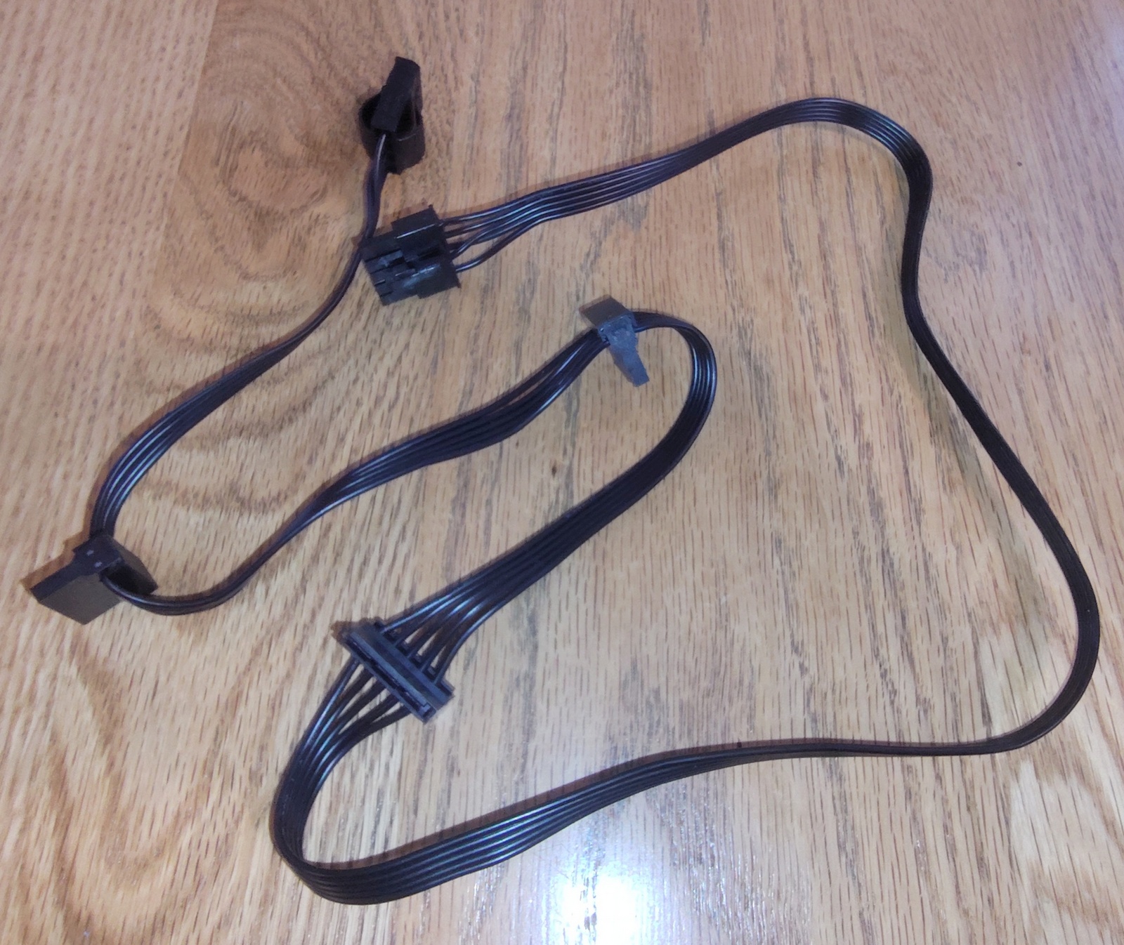 Up for sale is an original cable for use with a Cooler Master MWE Gold 850 V3 Power Supply. This cable has 3 SATA & 1 Molex power connector ends. It measures about 36″ long overall with about 20″ between the plug which connects to the power supply and the first SATA plug, and about 5″ to the next SATA plug, and about 5″ to the third SATA plug, and then about another 6″ to the Molex on the end. This may be compatible with other power supplies, but please check with yCooler Master for compatibility with your PSU BEFORE you purchase this item.