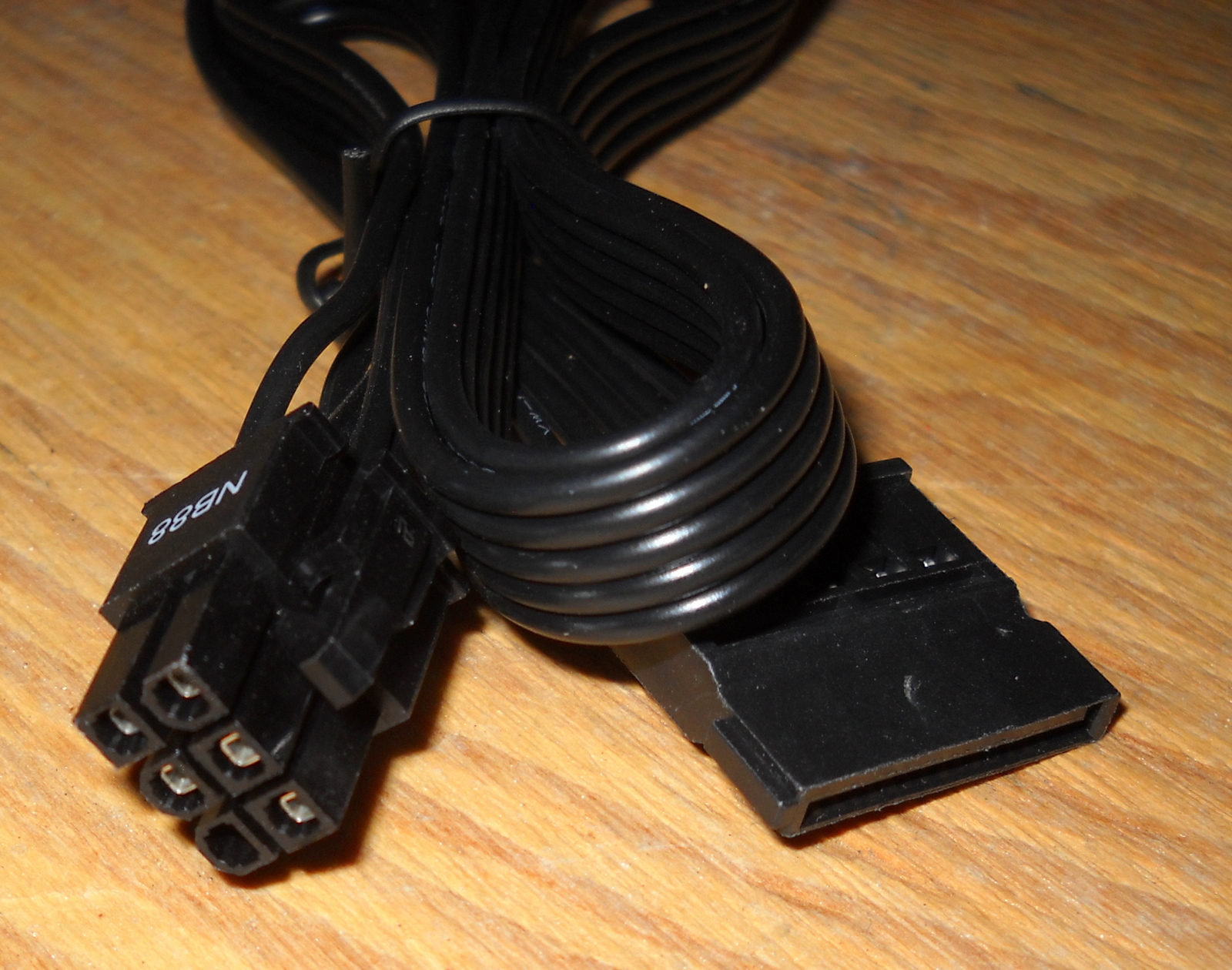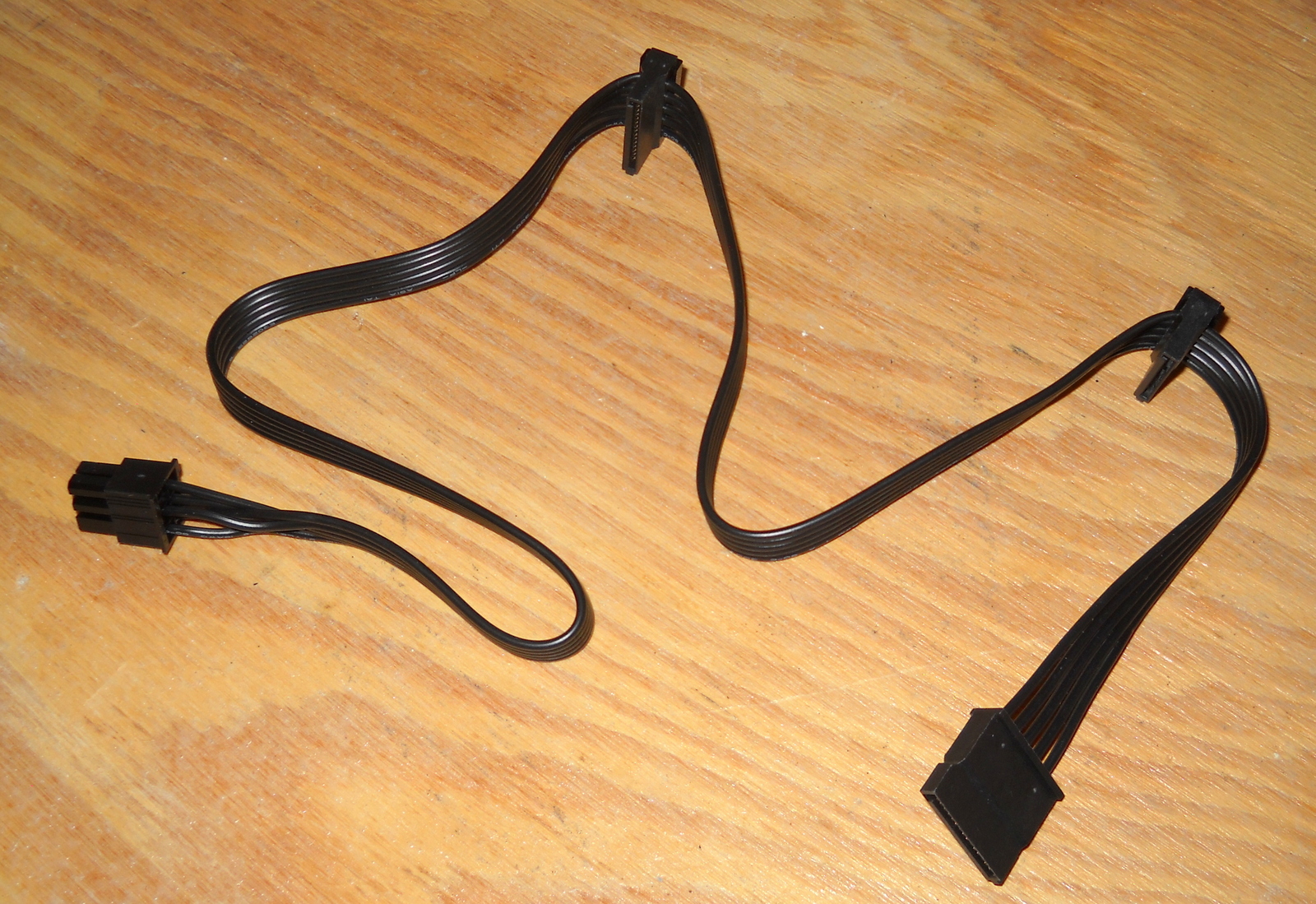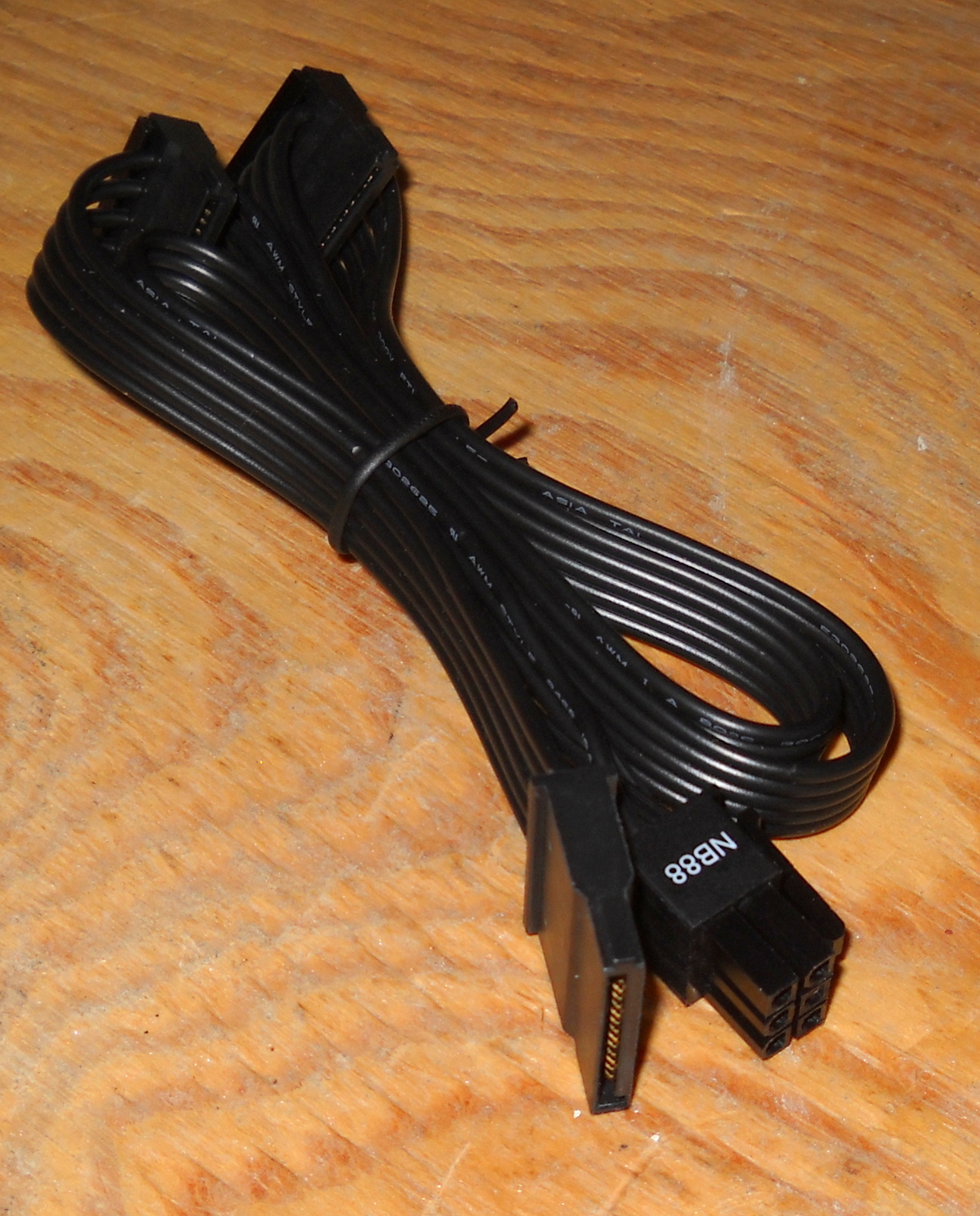 Up for sale is an original cable for use with a Seasonic Core GX-500 Power Supply. NB88. This cable has 3 SATA power connector ends. This cable is pretty short in that it measures about 26″ long overall with about 13″ between the plug which connects to the power supply and the first SATA plug, with about 8″ to the SATA plug in the middle, and another 5″ to the plug on the end. This may be compatible with other power supplies, but please check with your manufacturer for compatibility BEFORE you purchase this item.