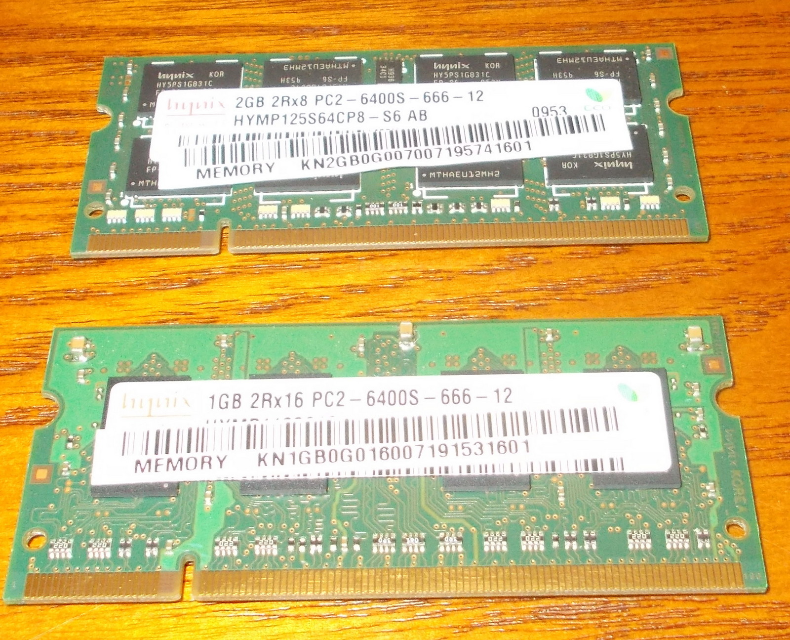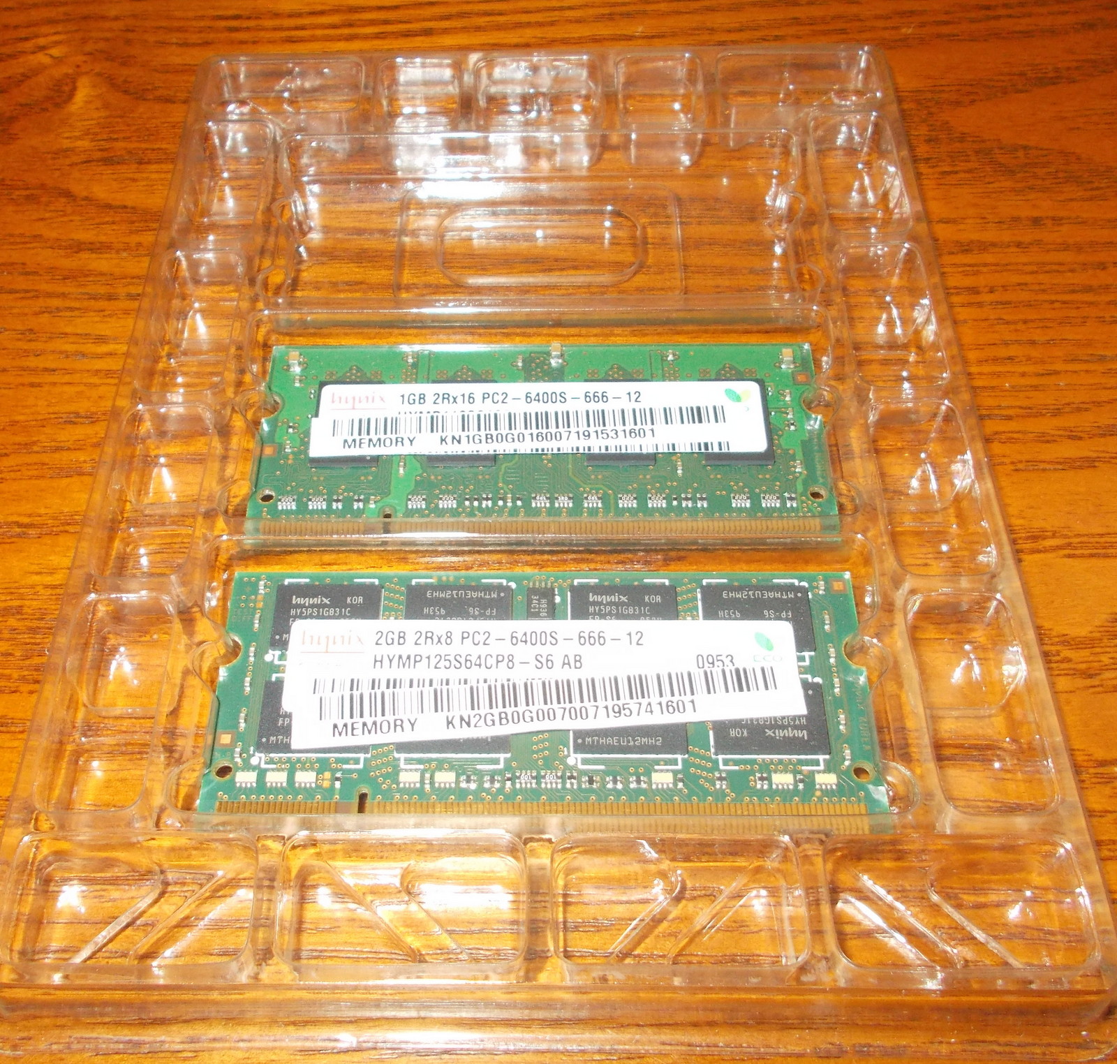 Up for sale is a 3GB kit of Hynix PC2-6400 SODIMM Memory RAM modules pulled from an older laptop computer which was upgraded. These were pulled from the laptop in good working condition. Please check with the manufacturer of your computer for compatibility BEFORE you make your decision to purchase. You get one 2GB module and 1 1GB module.