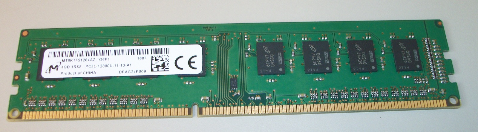 Up for sale is a 4GB module of Micron DDR3L-12800U Memory RAM pulled from an older desktop computer which was upgraded. This was pulled from the desktop in good working condition. Please check with the manufacturer of your computer for compatibility BEFORE you make your decision to purchase. You get one 4GB module.
