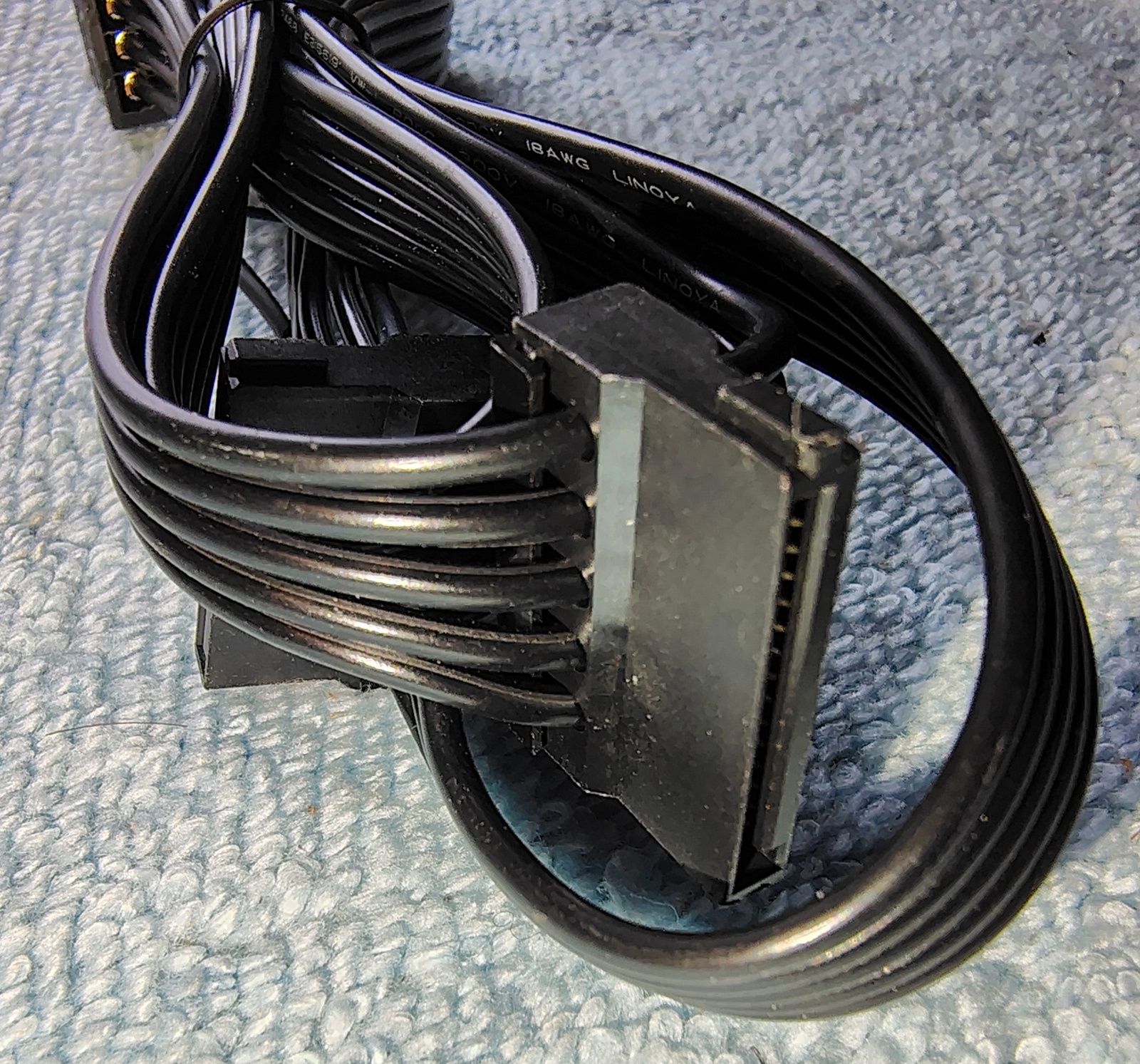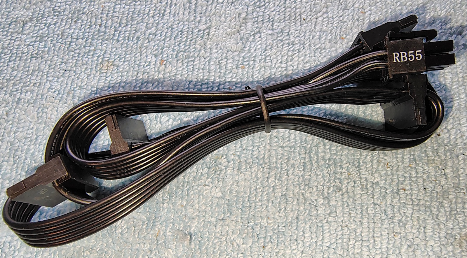 Up for sale is an original cable for use with a Seasonic Core GX-550 Power Supply. RB55. This cable has 4 SATA hard drive / peripheral power connector ends. These plugs are for use with devices which require a SATA power connector like SATA hard drives and SSDs. This cable measures about 33″ long overall with about 18″ between the plug which connects to the power supply and the first plug, then about 5″ between each of the remaining plugs. This may be compatible with other power supplies, but please check with your manufacturer for compatibility BEFORE you purchase this item.