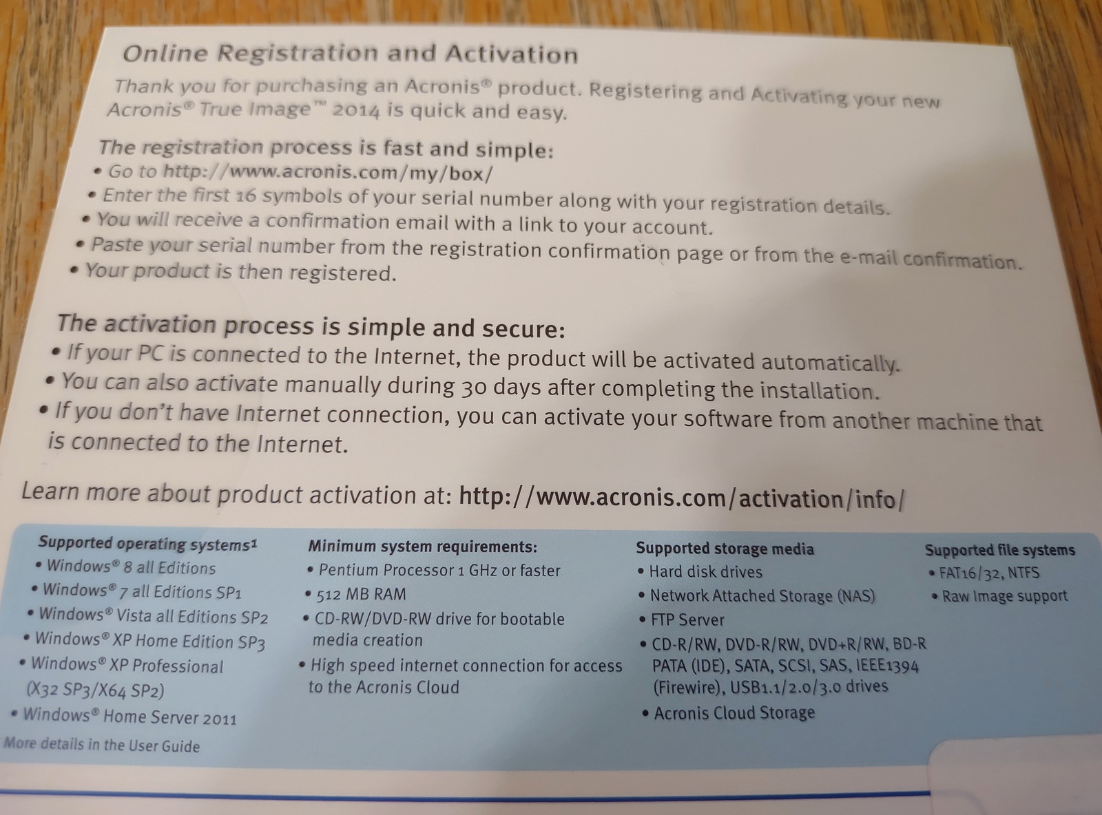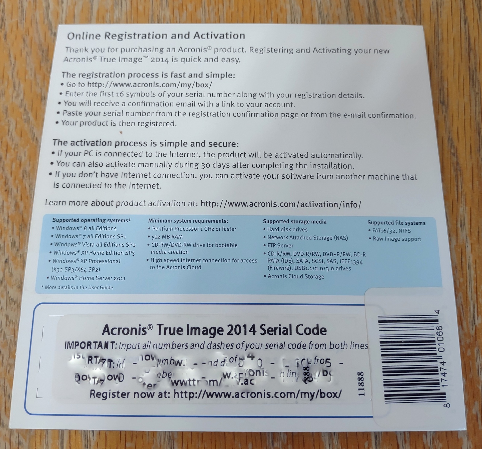 Up for sale is the original install disc, sleeve, and serial number for Acronis True Image 2014 for 1 computer. This is an old version of Acronis which we no longer use and no longer need. Upon purchase of this item, we will use the license transfer feature in our Acronis account to transfer the license to your Acronis account (your email address) – this is shown in the last picture. We will also send through the mail the original install disc, sleeve, and serial number. What you see in the pictures is what you get. If you need backup software for an older operating system, then this is a pretty good one! Barcode: 817474010684 After transfer of the license, you will be able to go ahead and download and activate the software and don’t need to wait for it to arrive in the mail.