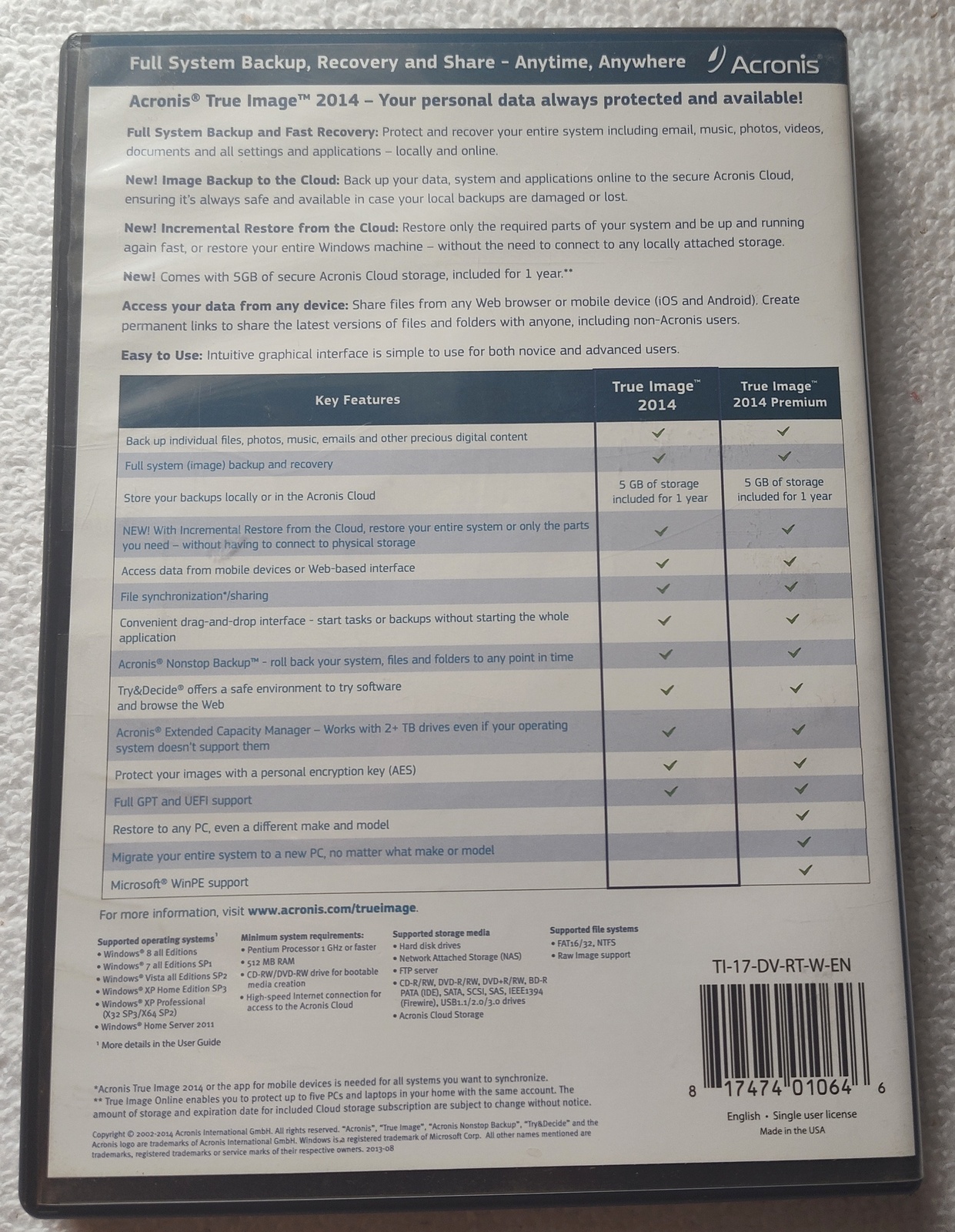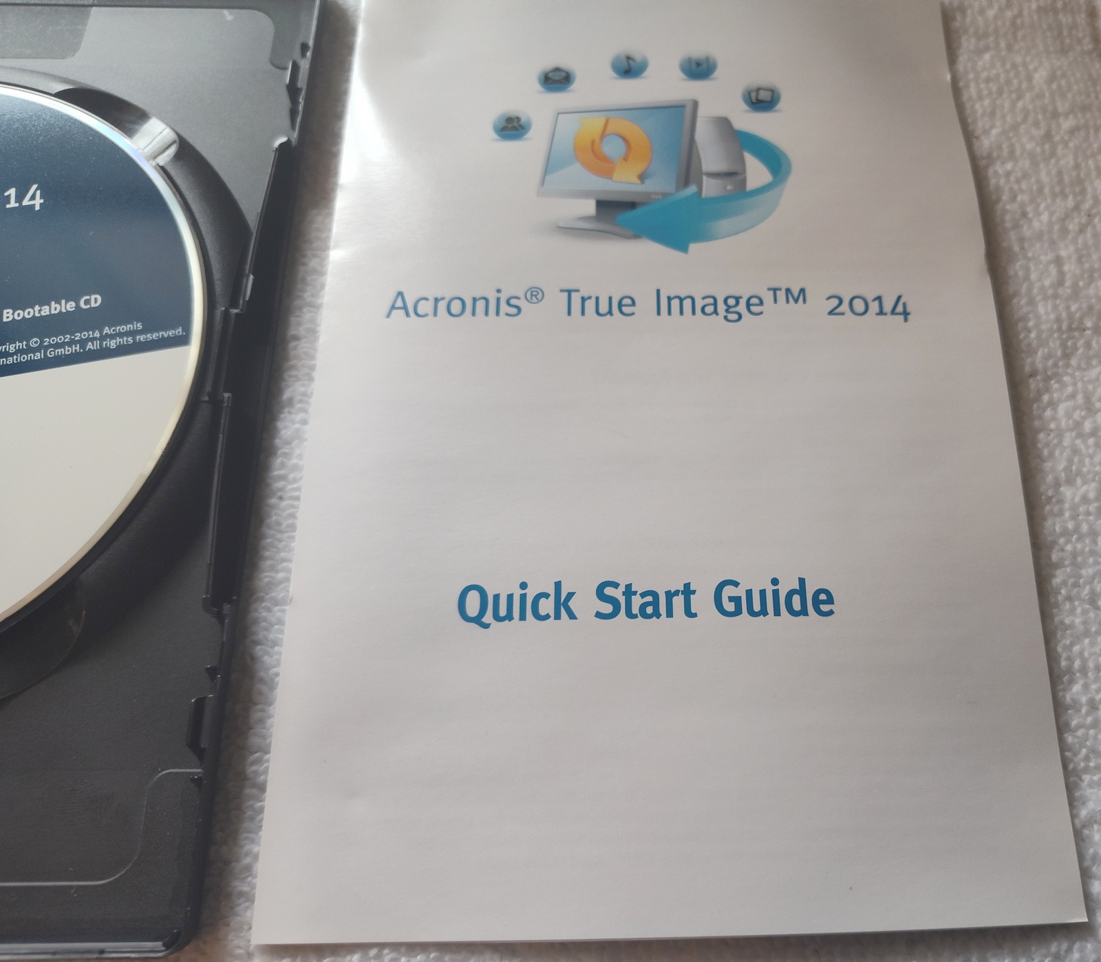 Up for sale is the original install disc, case, serial number, and Quick Start Guide for Acronis True Image 2014 for 1 computer. This is an old version of Acronis which we no longer use and no longer need. Upon purchase of this item, we will use the license transfer feature in our Acronis account to transfer the license to your Acronis account (your email address) – this is shown in the last picture. We will also send through the mail the original install disc, case, serial number, and Quick Start Guide. What you see in the pictures is what you get. If you need backup software for an older operating system, then this is a pretty good one! After transfer of the license, you will be able to go ahead and download and activate the software and don’t need to wait for it to arrive in the mail.
