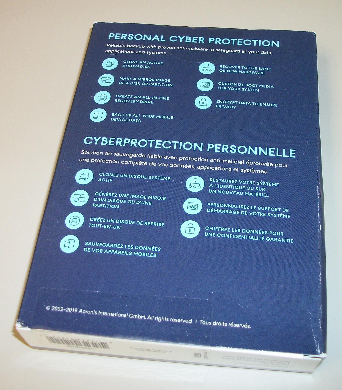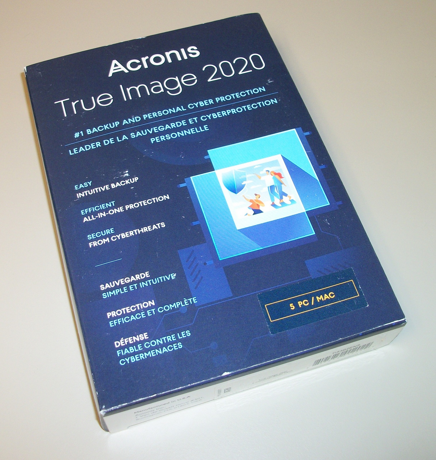 Up for sale is a new box & serial number for Acronis True Image 2020 for 5 computers. We ended up with some extra copies of this software which we never used and now no longer need. This is sealed in the original box. Inside of the box is a piece of paper with the serial number on it. You will need to create an Acronis account, register the serial number with Acronis, and download the software. THERE IS NO DISC INCLUDED! What you see in the pictures is what you get. If you need backup / cloning software, this is a pretty good one! Barcode: 817474012022.