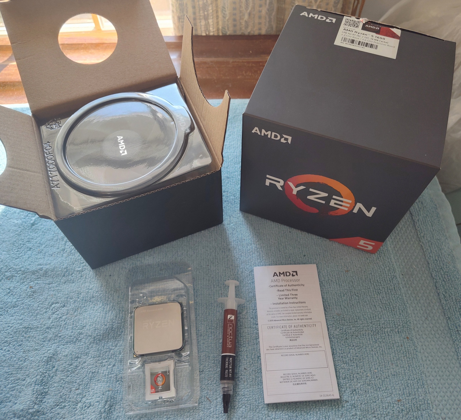 Up for sale is an AMD Ryzen 5 1600AF Socket AM4 CPU. We put this one in service in June of 2020 on an ASRock B450M-HDV R4.0 motherboard and we have now upgraded to a newer, faster processor. So, this one is left over. Hope someone out there on the internet can put it to use! It is in good used condition and includes the original box, heat sink and fan, sticker, as well as a partial tube of Noctua NT-H1 thermal paste compound. This was the 2nd run of Ryzen 5 1600 processors with the AF in the part number on the processor itself – we ran this one with Windows 11 just fine and it did not protest as being incompatible. A discrete graphics card is required to be used with this processor as it does NOT have onboard graphics!