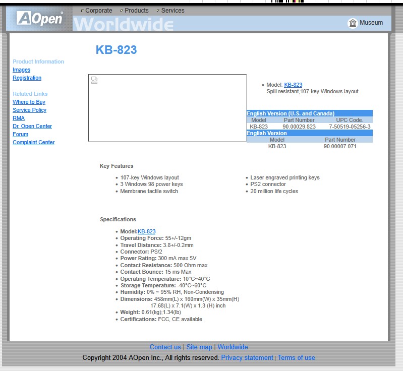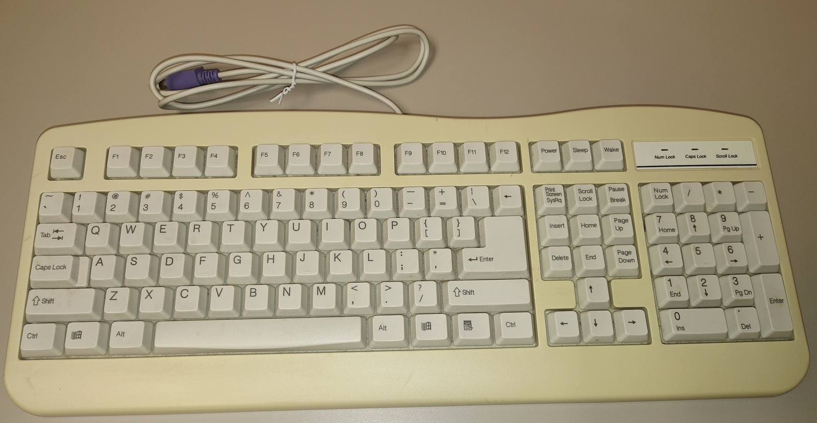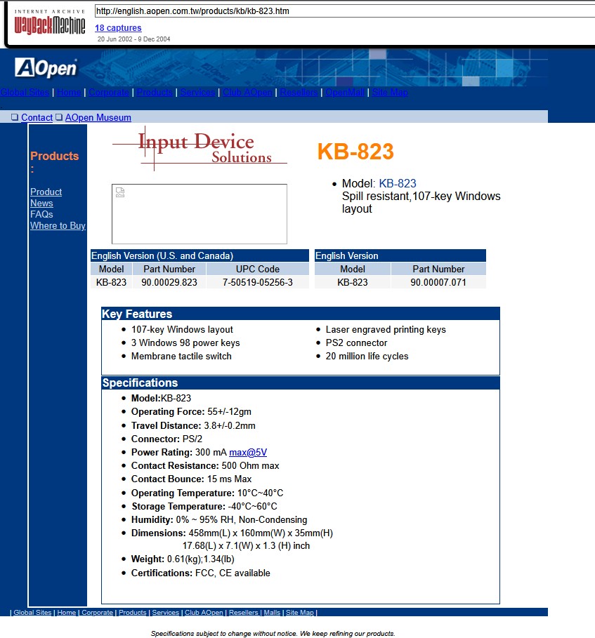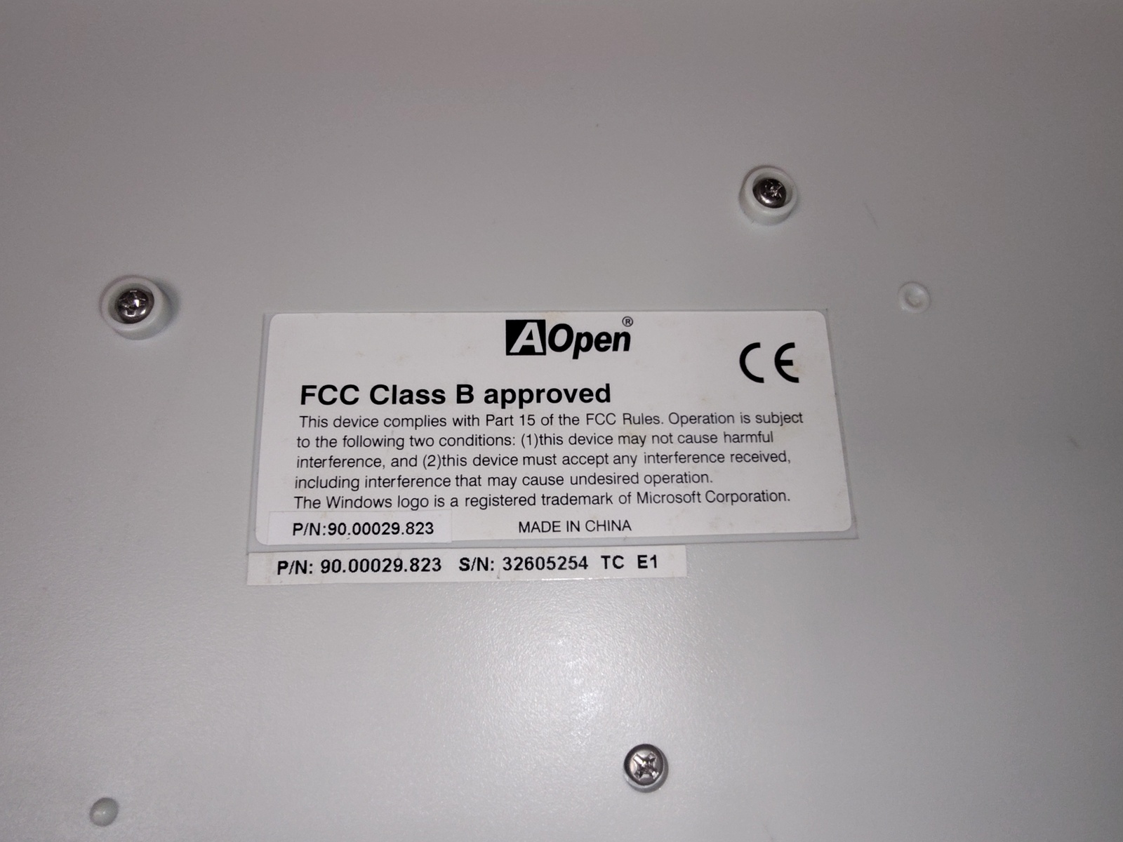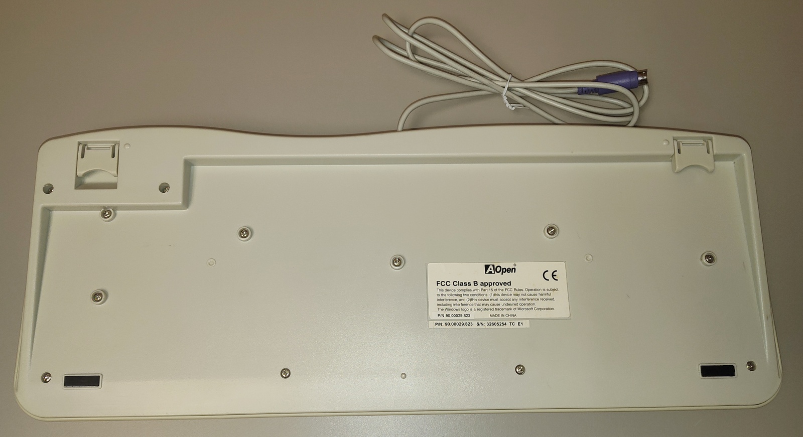 Up for sale is an old PS/2 keyboard in good used condition – we connected it to our old Windows 10 machine and it was detected as a ‘Standard PS/2 Keyboard’ and seemed to work just fine. Be sure to power off your computer when connecting or disconnecting PS/2 keyboards and mice. The last two pictures are snips from the Internet Archive and are Aopen’s webpages about this keyboard from about 2004.