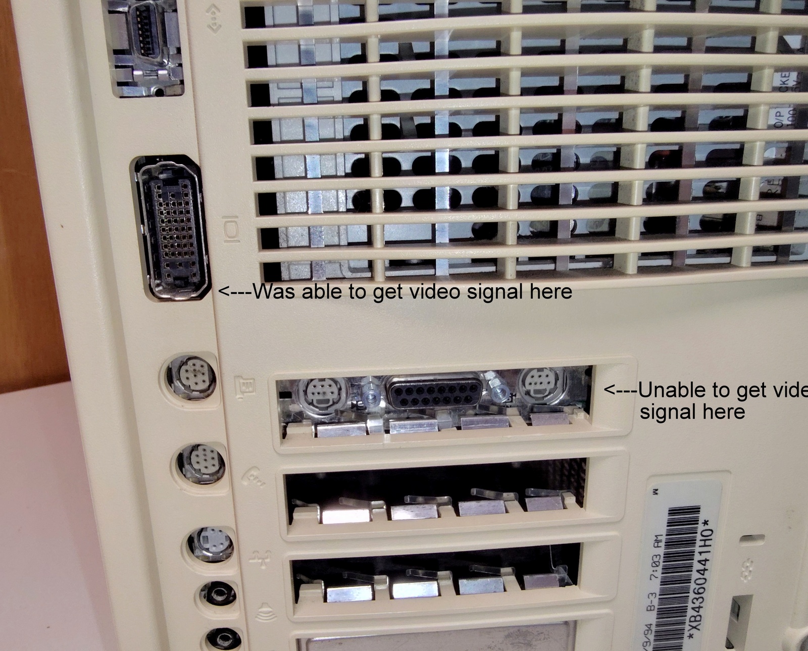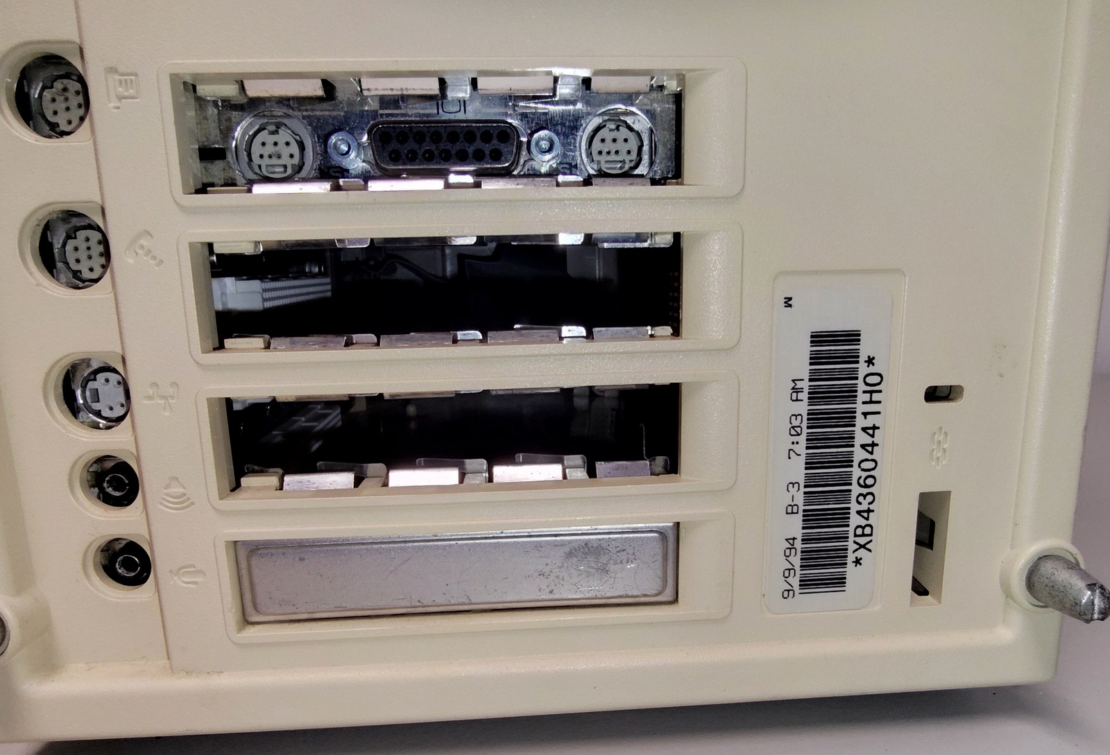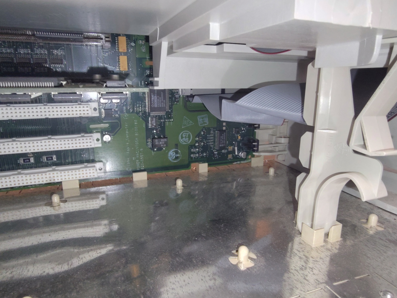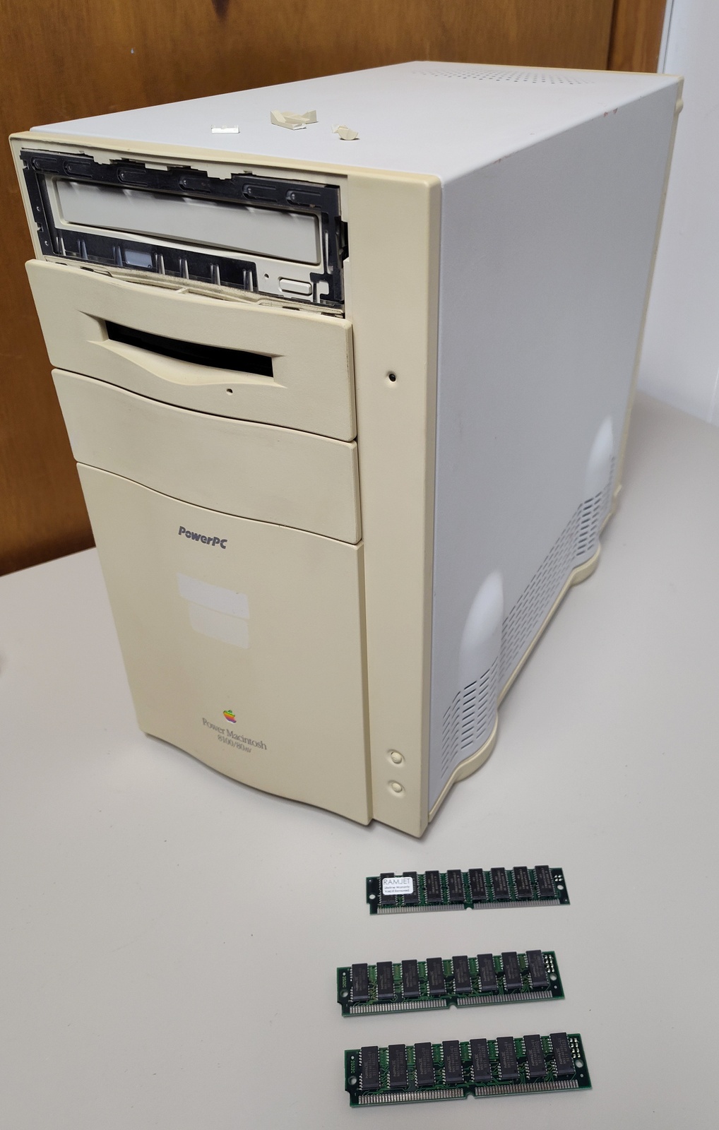 Up for sale is an old Apple Power Macintosh 8100/80av from 1994. We were unable to get this old desktop Mac to boot – when powered on, the CD-ROM drive just whirrs and whirrs and will not open and when we try to boot from a floppy, the drive just spits out the disk soon after it is inserted. We were not able to get any video output on the video card installed into one of the expansion slots, but were able to get an image from the onboard video – a floppy disk icon with a flashing question mark and one time we got the frowning Macintosh computer with the hexadecimal codes pictured. If this is anything like the other old Macs we’ve recently sold, it likely needs a BIOS battery. The plastic on the case is in very brittle condition. Some little bits of broken plastic came out when the case was removed to photograph the computer – so, it will either have to be replaced, possibly glued, or maybe someone can 3D print a new one? It is missing the CD-ROM faceplate. Anyway, it turns 30 years old this year and the plastic is brittle. The broken plastic bits are included with the computer. You only get the desktop PC and the broken plastic pieces – you will need to provide your own ADB keyboard and mouse, power cable, as well as a monitor. Apple’s support site says it will run all the way up to OS 9. This one was interesting in that it had a bunch of signatures molded into the plastic above the expansion slots – see picture! Perhaps these were the team that designed the computer? This also comes with the 3 RAM sticks pictures – they were discovered wrapped in a piece of bubble wrap and stuck inside of the case when we opened it to photograph it – so they’re included.