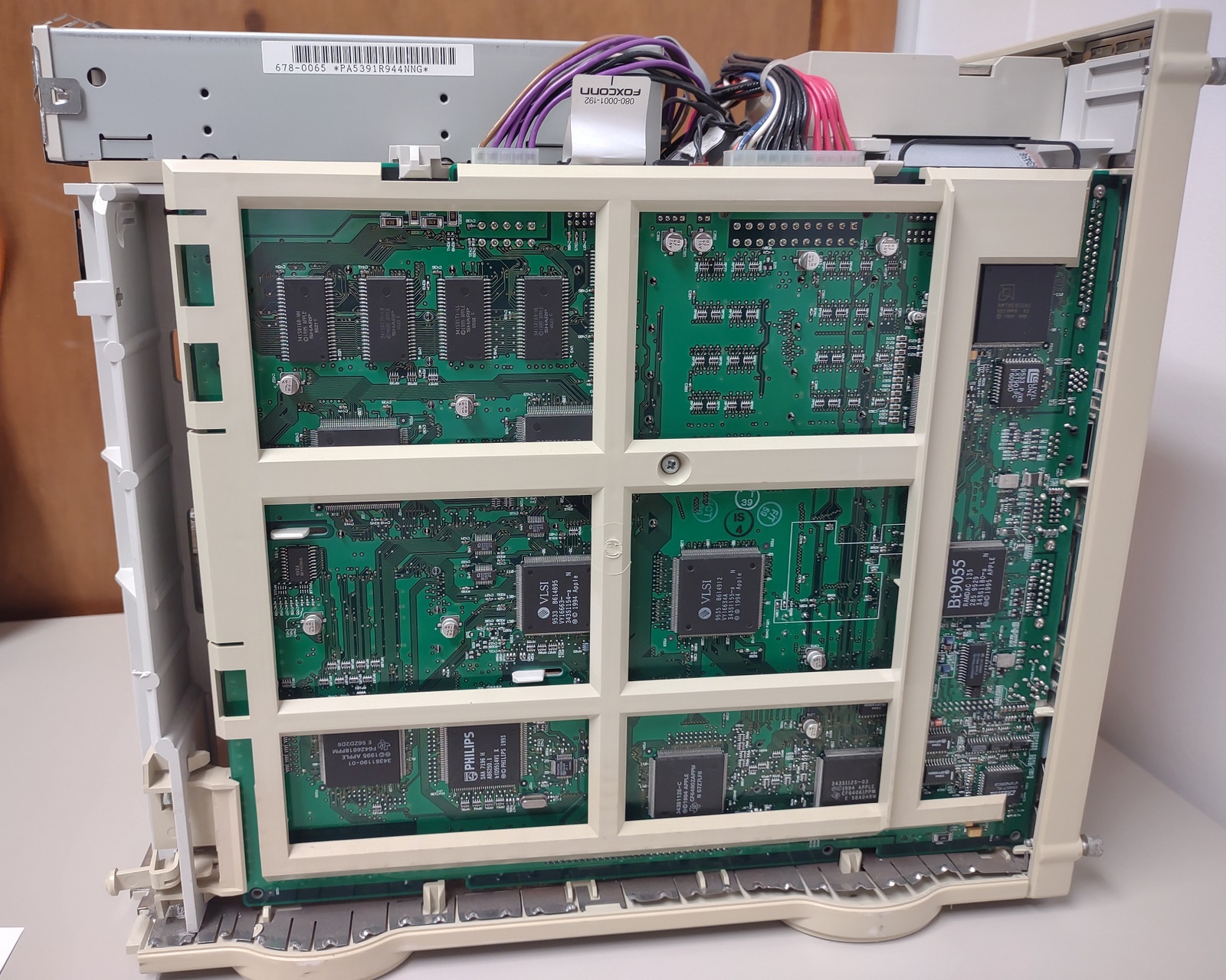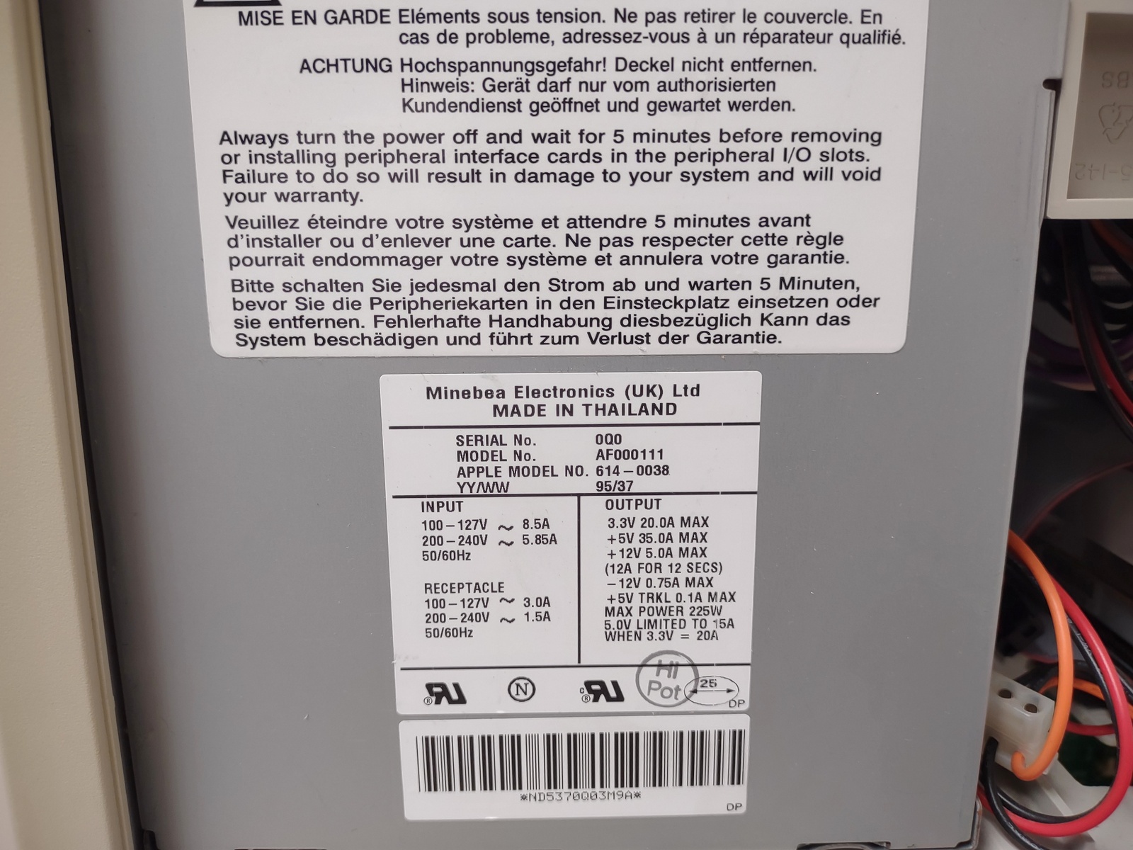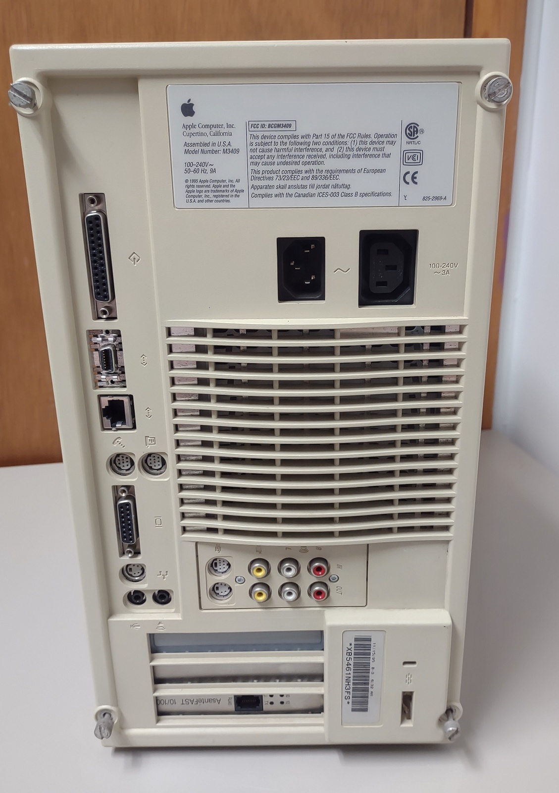 Up for sale is an old Apple Power Macintosh 8500/120 from 1995. This old desktop Mac has a clean install of MacOS System 7.5.2 on its 1GB Quantum SCSI hard drive. The date and time were incorrect which means that it needs a BIOS battery. The plastic on the case is in generally good condition, with the exception of the power switch linkage – this broke when the case was removed to photograph it – so, it will either have to be replaced, possibly glued, or maybe someone can 3D print a new one? Anyway, it is pushing 30 years old and the plastic is brittle. To power it on, you will either need a chopstick to reach into the hole where the power switch linkage used to be, or remove the outer case and access the button which is on the front of the motherboard. The broken pieces of the switch linkage are included with the computer. You only get the desktop PC and the broken plastic pieces from the power switch linkage – you will need to provide your own ADB keyboard and mouse as well as a monitor. This one came with a PCI fast ethernet card installed: Asante 10/100 as an upgrade from the 10MB onboard NIC. We did not try to test the networking, but there are TCP/IP settings in the control panel – you might do better with a newer OS – Apple’s support site says it will run all the way up to OS 9.