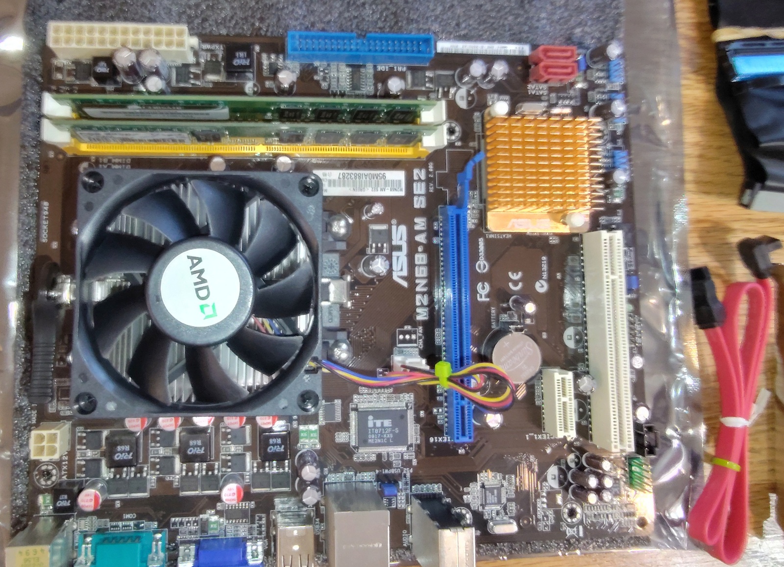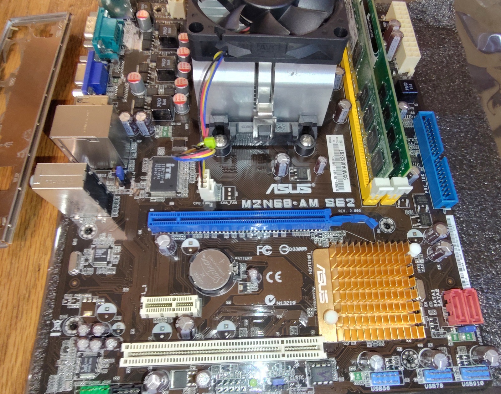 Up for sale is an Asus M2N68-AM SE2 Socket AM2+ uATX Motherboard with an AMD Athlon 64 X2 5200+ CPU AND 4GB RAM (2 x 2GB Modules). This motherboard was put into service in summer of 2009 and in November 2023 the system was upgraded to a newer, faster motherboard, processor, & RAM. So, we have this one left over. Hope someone out there on the internet can put it to use. This originally had Windows XP Home on it and had been upgraded to Windows 7 Home, then Windows 10 Home during the free upgrade period, so you might be able to activate Windows 10 Home on it without a product key, but NO PRODUCT KEY is included. The original product key from Windows XP Home is included, but we don’t have any product keys for either Windows 7 Home or Windows 10 Home. You will also need to provide your own install media. When we upgraded to Windows 10 in December 2015, we upgraded the system to an SSD (NOT included) and the included Syba PCIe SATA III controller card since the onboard SATA was only SATA II. However, after this upgrade and setting the system BIOS to boot from the Syba card, the system would not boot with a USB Hard Drive or Thumb Drive plugged into the motherboard – it would always try to boot from the USB device and not from the Syba, so we had to remember to unplug the USB external devices when rebooting the computer. The other upgrade we did in 2015 was the HD5450 video card as the onboard video did not have drivers for Windows 10 – this PCIe video card is included in the lot. Good luck!