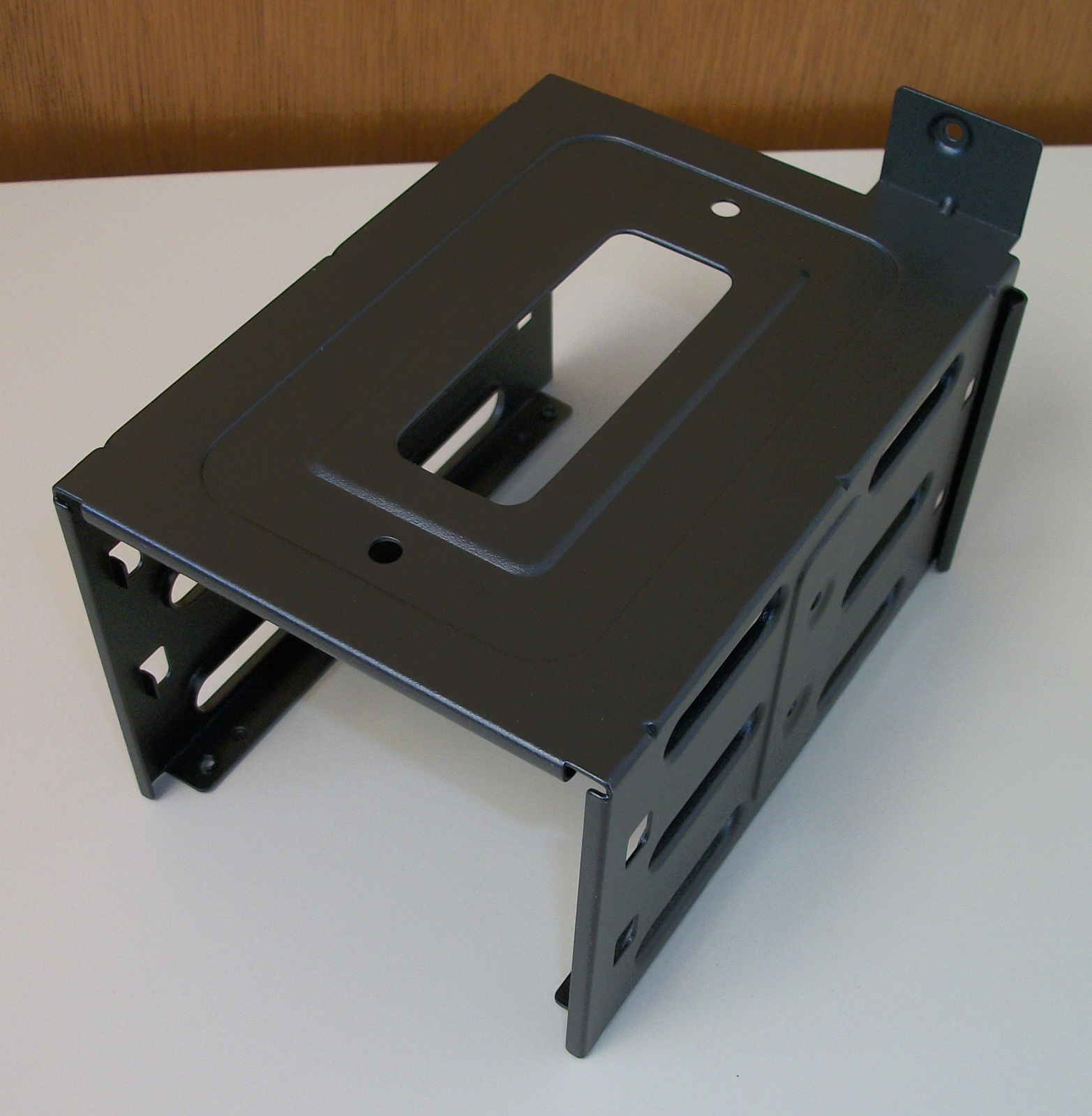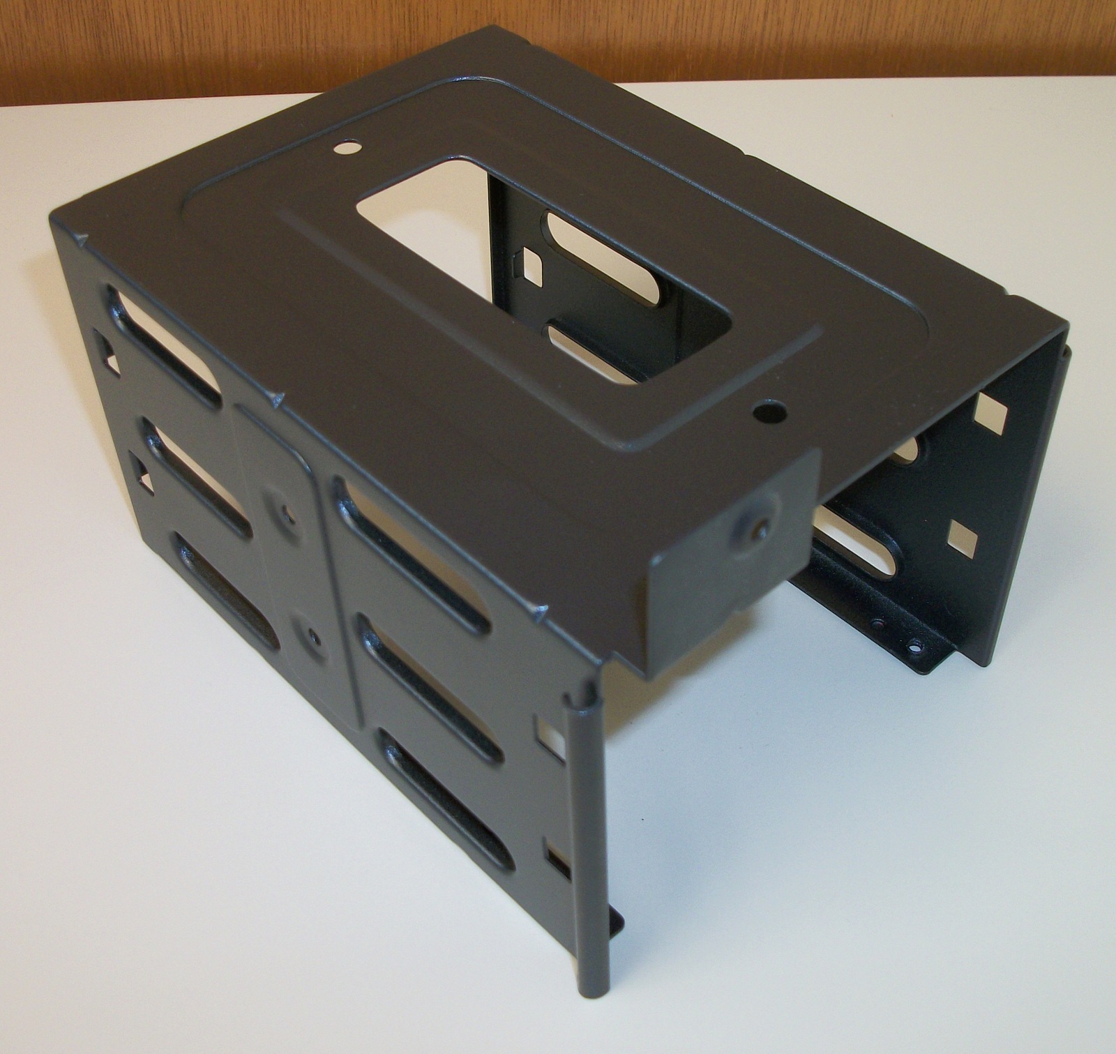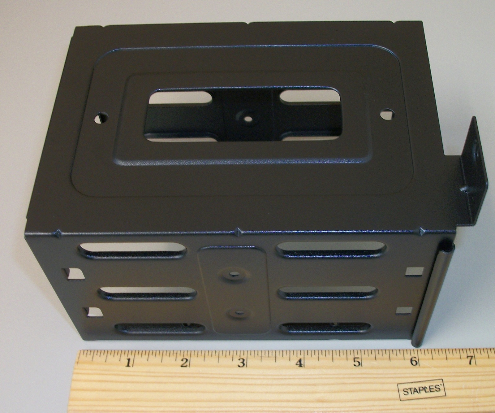 Up for sale is a black steel internal bracket for 3.5″ hard drives for a Corsair Carbide 275R computer case. It holds 2 x 3.5″ drives. The screws to fasten the bracket to the case are included – see pictures). HOWEVER, you will need to provide your own mounting sleds for the drives. Hope someone out there on the internet can put it to use! It also might be useful in your own custom creation – it measures about 3.5″ tall x 6.5″ deep x 4 1/4″ wide and is made of steel and painted black.