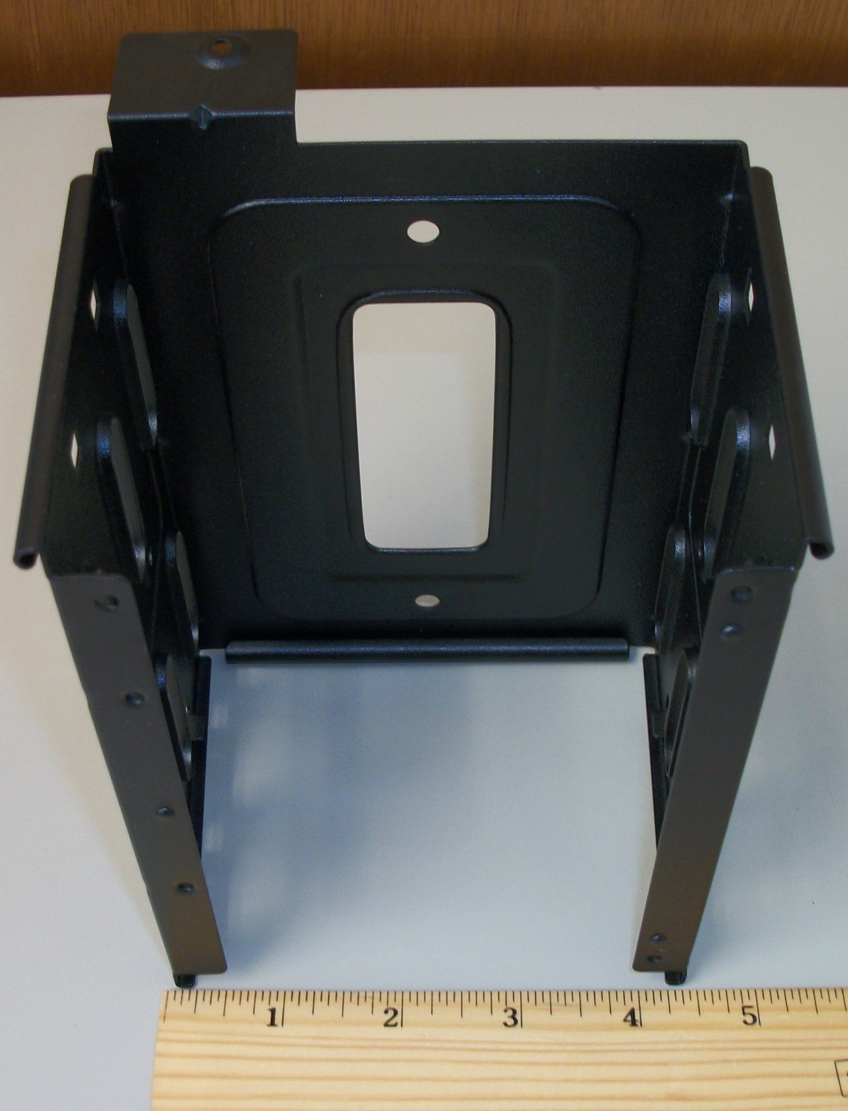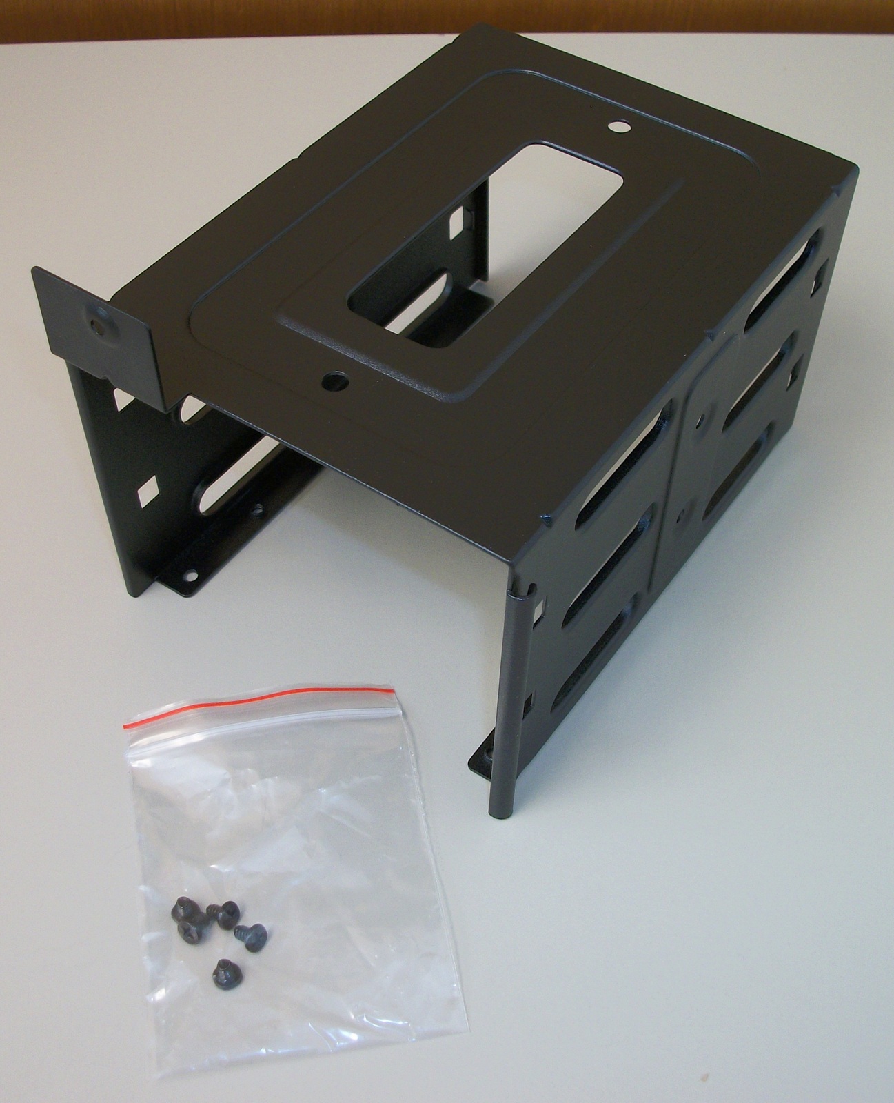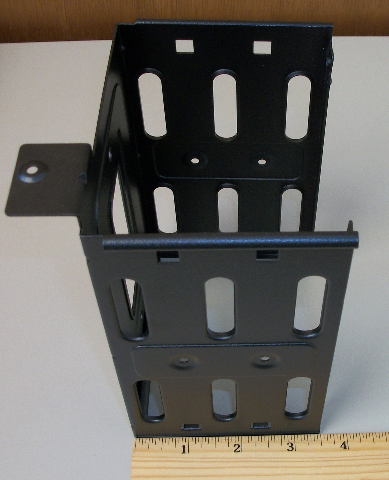Up for sale is a black steel internal bracket for 3.5″ hard drives for a Corsair Carbide 275R computer case. It holds 2 x 3.5″ drives. The screws to fasten the bracket to the case are included – see pictures). HOWEVER, you will need to provide your own mounting sleds for the drives. Hope someone out there on the internet can put it to use! It also might be useful in your own custom creation – it measures about 3.5″ tall x 6.5″ deep x 4 1/4″ wide and is made of steel and painted black.