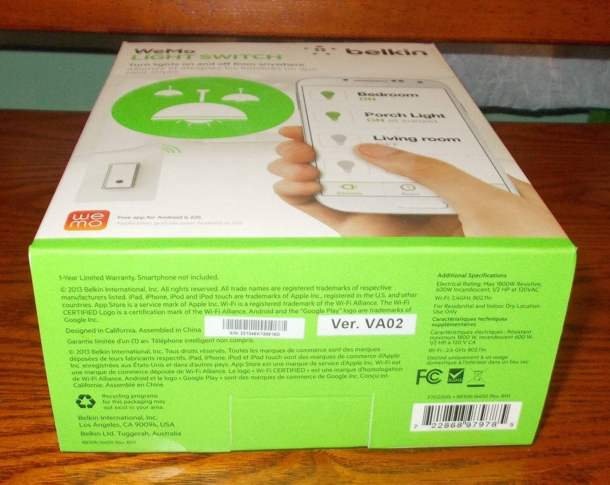 Up for sale is a new in the box Belkin WeMo smart light switch. Version VA02. We bought this with the intention of installing it, but ended up using a different product so we have this left over. Hope someone out there on the interwebs can put it to use.