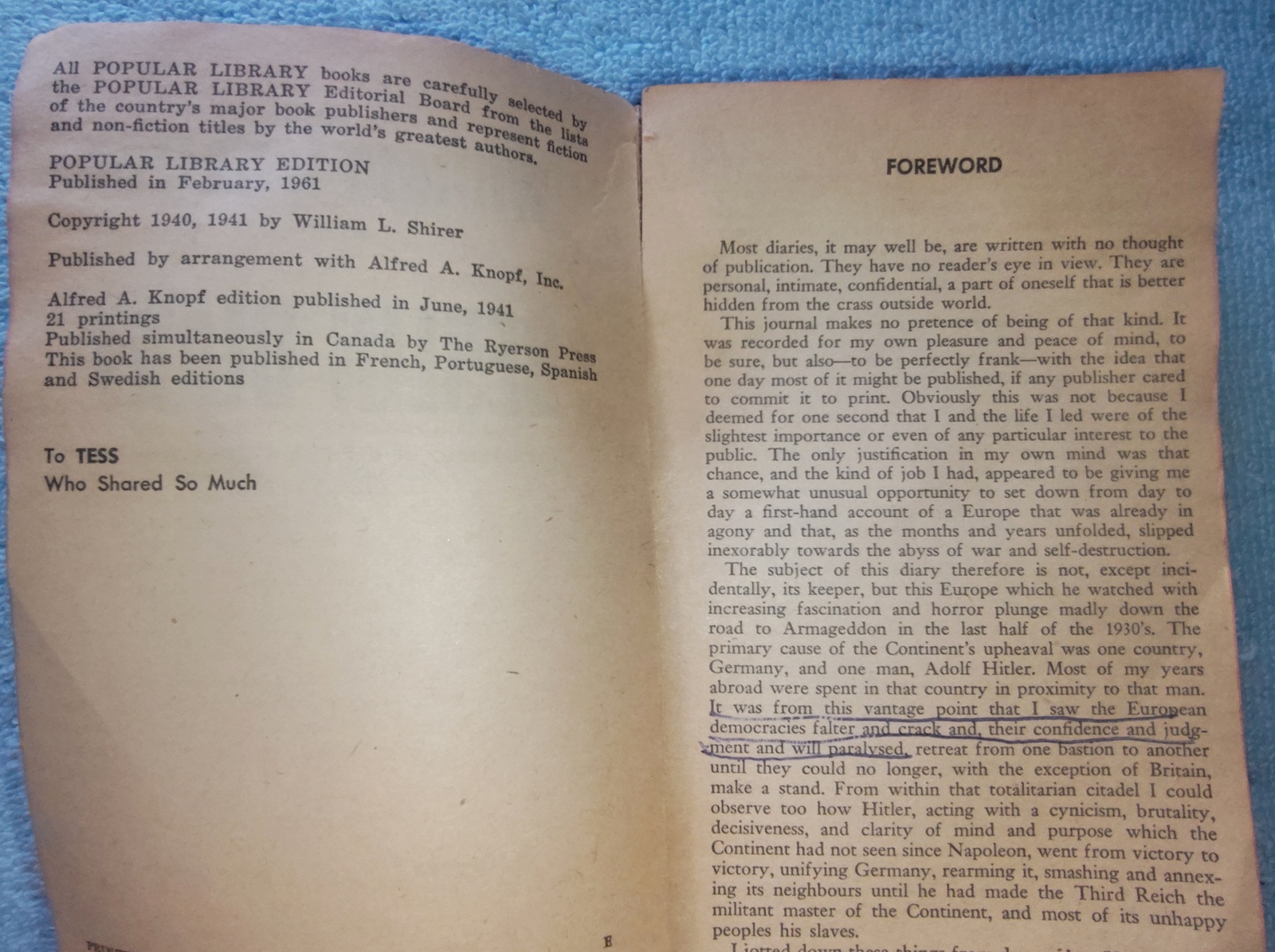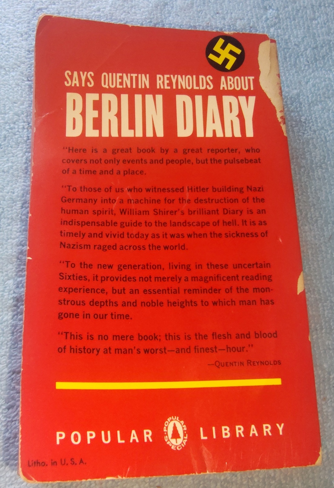 Up for sale is a paperback book: Berlin Diary by William L. Shirer. This is in good readable condition with creasing / scuffing on the cover as well as some very slight underlining. Examine the pictures BEFORE you make your decision to purchase this book! 1961.