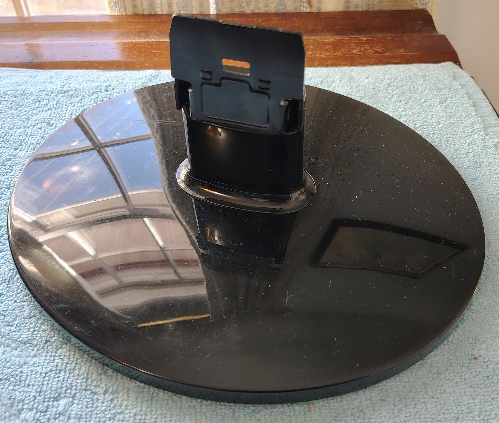 Up for sale is a stand that came with a Samsung 23.6″ S24C230BL monitor from 2014 and is in good used condition – the monitor was mounted to an adjustable stand and this stand was not needed and left over. Hope someone out there can use it. It may fit other Samsung monitors, but we’re not sure which ones, so please check with Samsung for compatibility with your monitor BEFORE you purchase this stand. The metal piece which pushes up into the monitor measures about 2 1/2″ wide by about 1 3/16″ tall. This stand is in used condition with minor scrapes / scratches / missing foot pads / et cetera – see pictures!