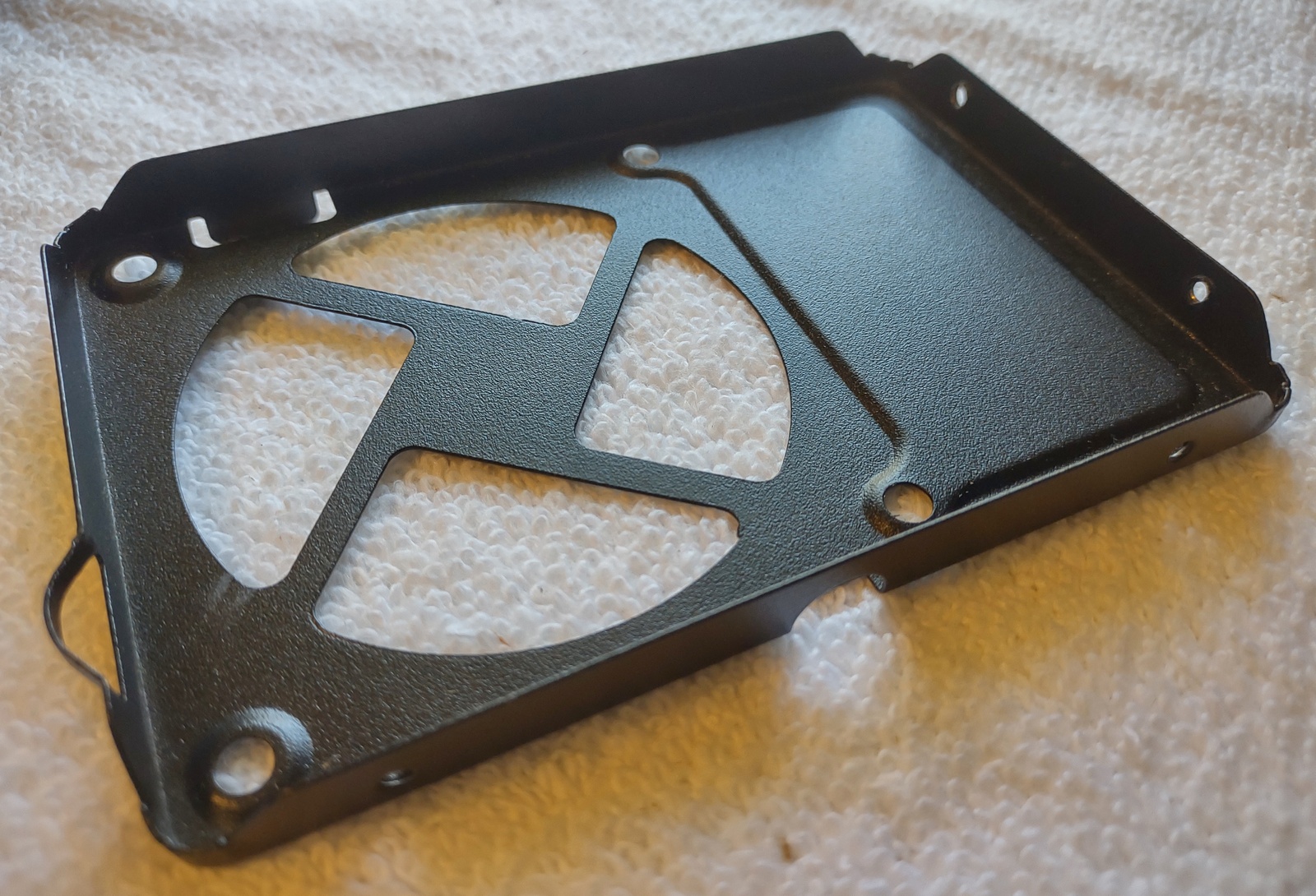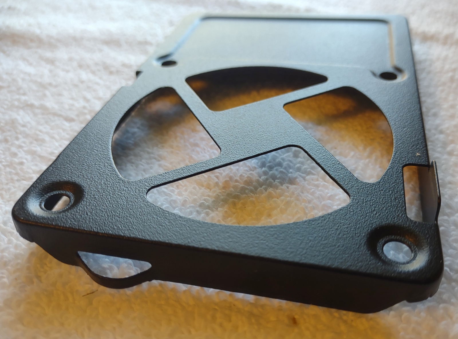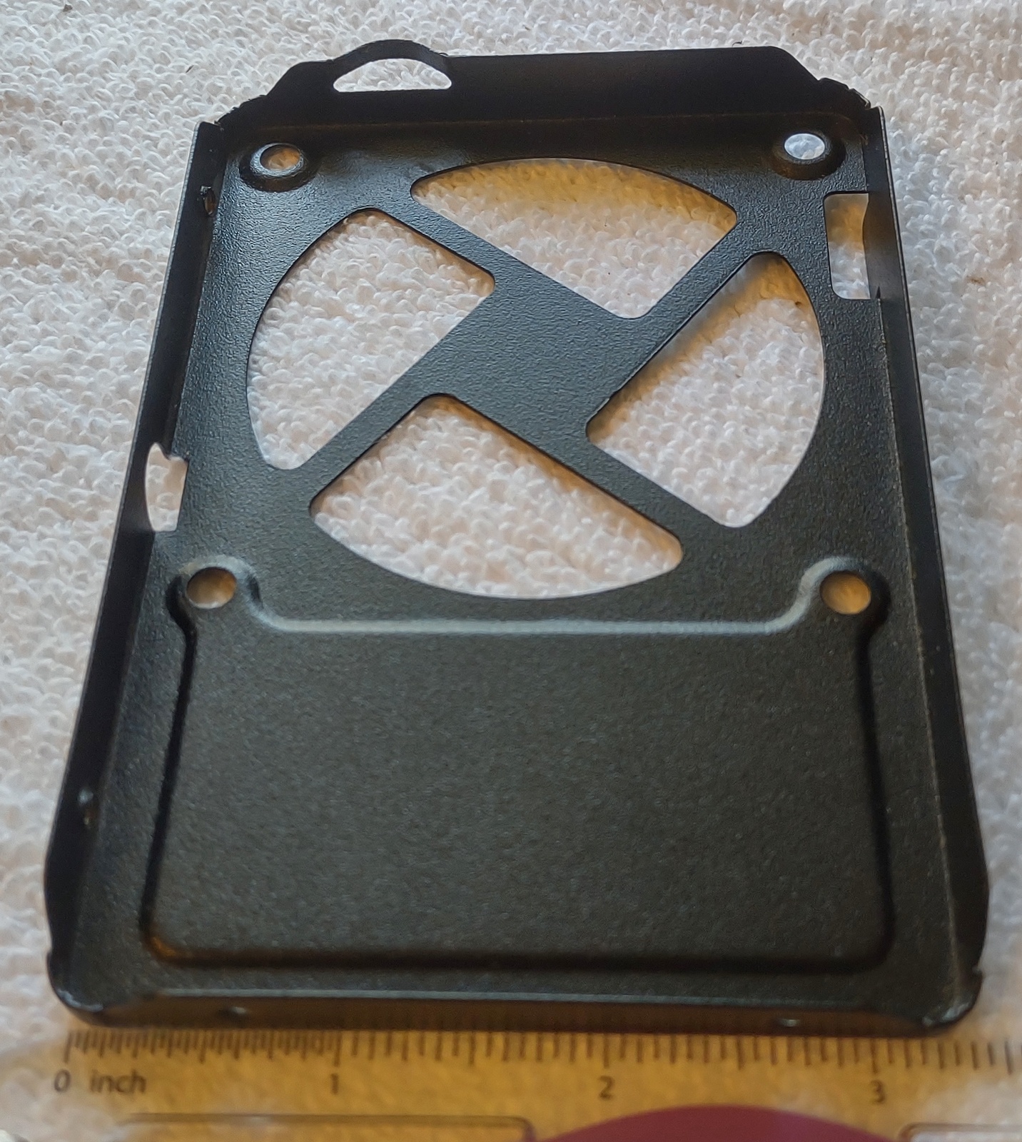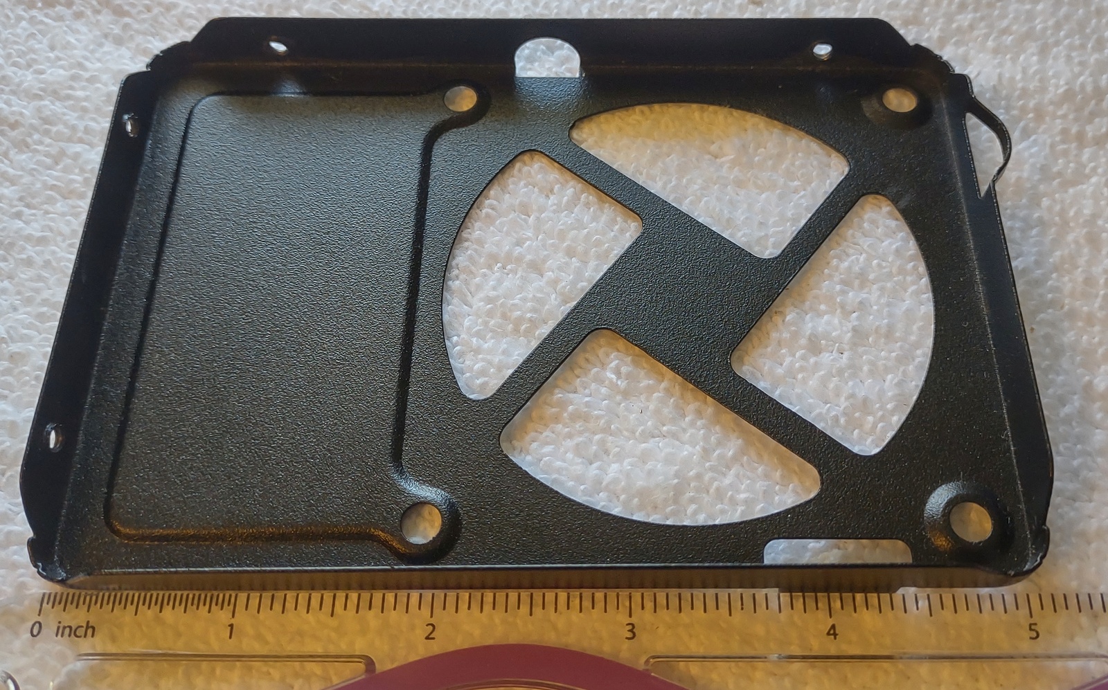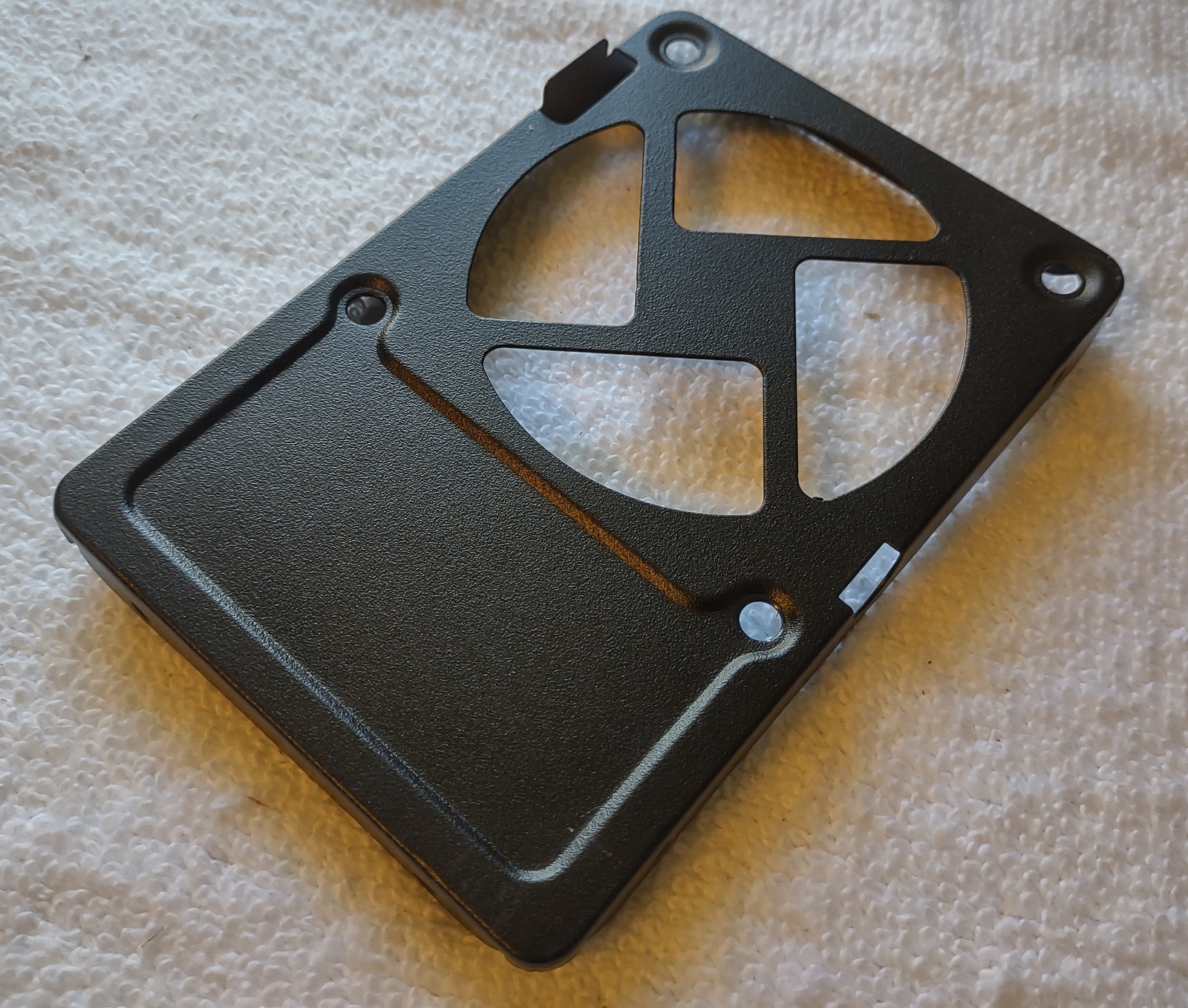 Up for sale is a good used cooling fan bracket for Cooler Master Elite 120 Advanced computer cases. This originally held an 80mm x 15mm cooling fan and mounted in the side of the case. The cooling fan is NOT INCLUDED. This is from a Cooler Master Elite 120 Advanced case, but may be compatible with others. Please check with Cooler Master for compatibility with your case BEFORE you purchase this item. It also might be useful you your own custom creation. It measures about 5 3/8″ long by just under 4 inches tall. No screws are included: you will need to provide your own fasteners to connect the bracket to the case and to connect your fan to the bracket. Made of steel powder coated black. This may fit the Cooler Master Elite 130 also, but we’re not for sure and you should check with Cooler Master for compatibility BEFORE you purchase this bracket.