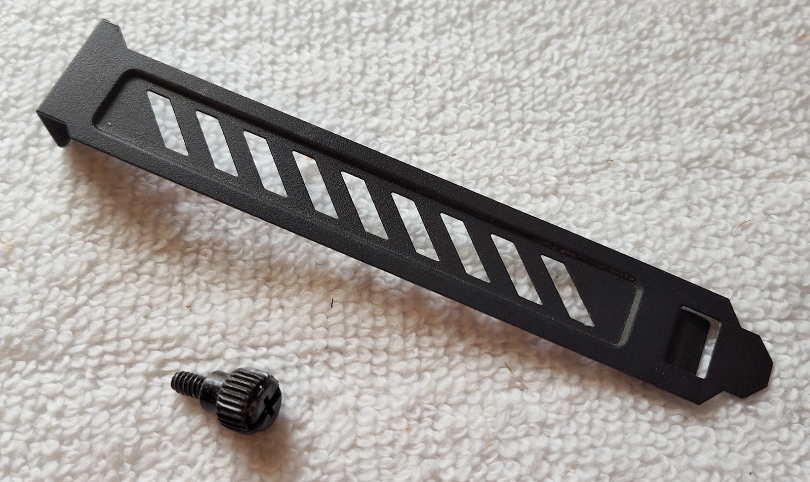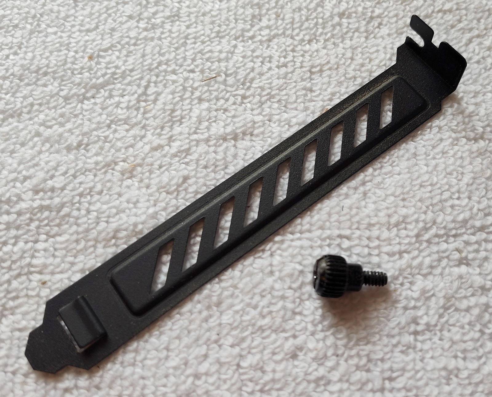 Up for sale is a black PCIe slot cover bracket for Corsair Vengeance C70 computer cases. These are for black and white Corsair Vengeance C70 cases, but may be compatible with others since PCIe slot covers are pretty standard. Please check with Corsair for compatibility with your case BEFORE you purchase this item. This is in good used condition and comes with the thumb screw. If you’re looking for one to match what you’ve got with a Corsair Vengeance C70 case, then this is it! Hope someone out there on the interwebs can put it to use!