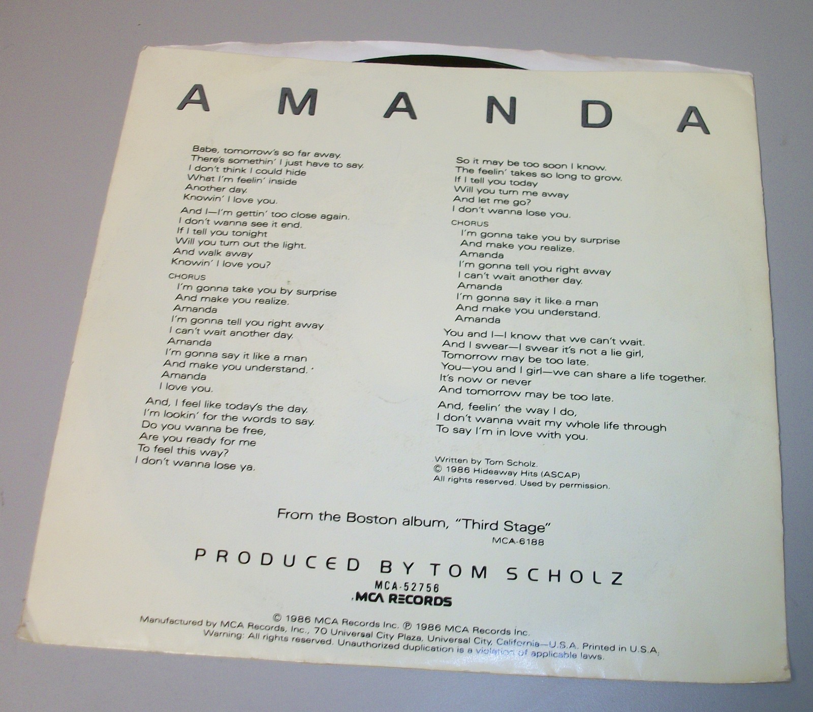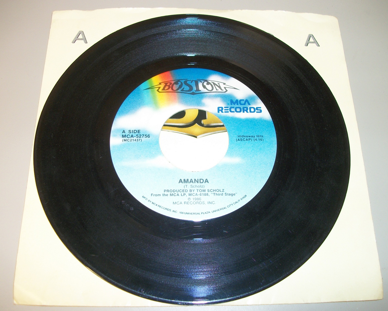 Up for sale is a 45 of the hit single Amanda by Boston from 1986 on 7″ vinyl. LOOK AT THE PICTURES! Used condition, some wear around the edges and light creases. This is in pretty good shape for a decades old record.