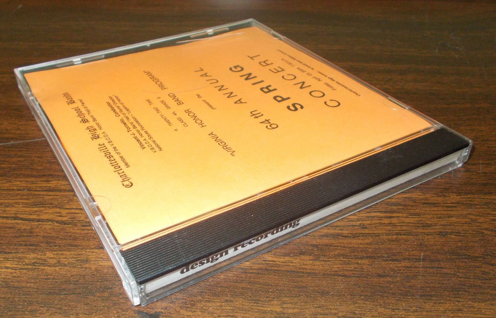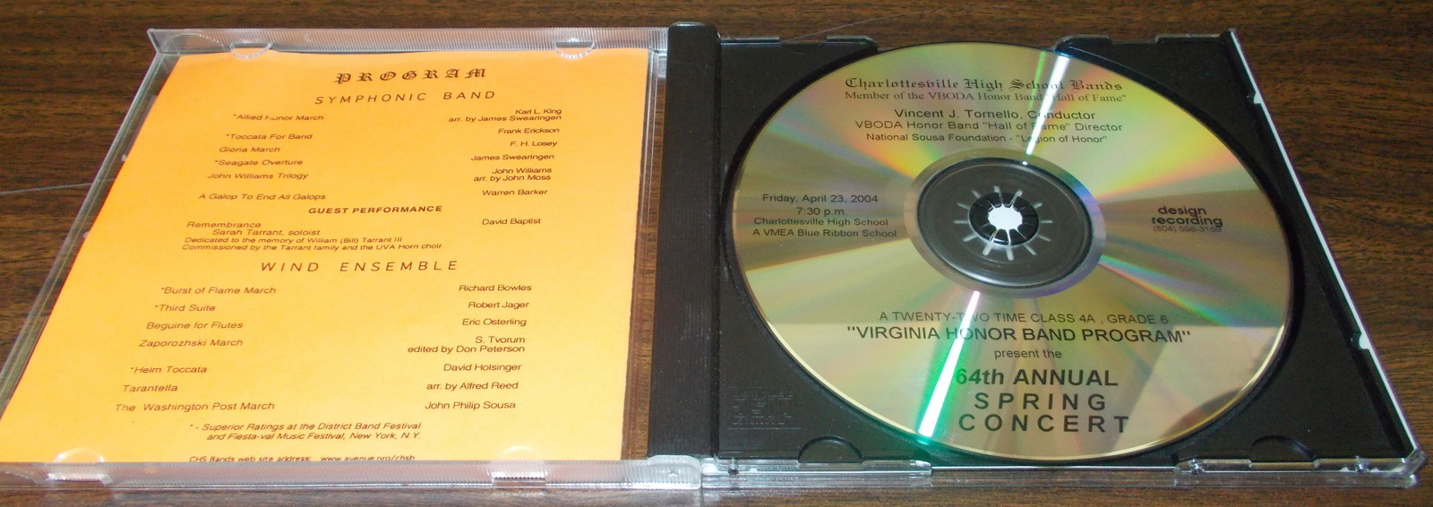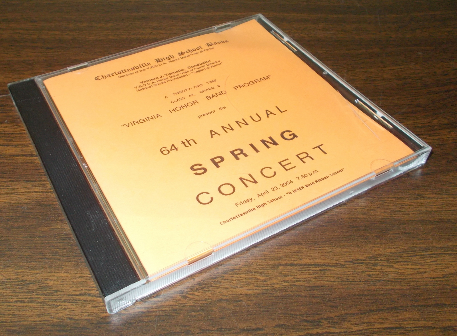 Up for sale is a recording of Charlottesville (Virginia) High School’s 64th annual Spring Concert from Friday April 23, 2004 at 7:30PM. Vincent J. Tornello, Conductor. Recorded and manufactured by design recording of Powhatan, VA. This is in good used condition with some scratches / scrapes on the jewel case – SEE PICTURES!