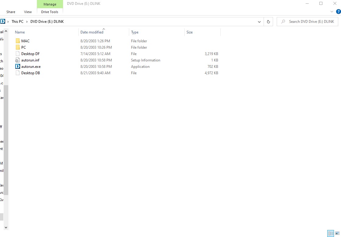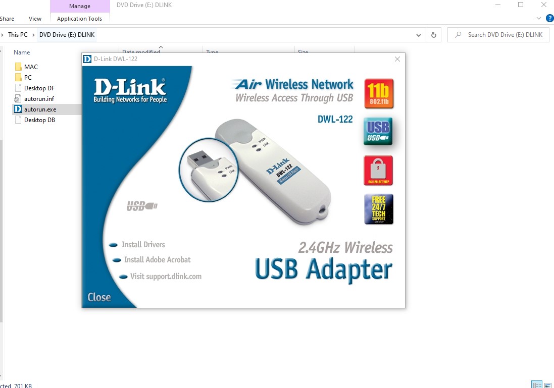 This includes documentation and driver software for D-Link DWL-122 USB wireless adapter from 2003. DO NOT EXPECT THIS TO WORK WITH A MODERN OPERATING SYSTEM! We tried to run the ‘autorun.exe’ file in Windows 10 and it seemed like it was going to install – but we did not try to go any further.