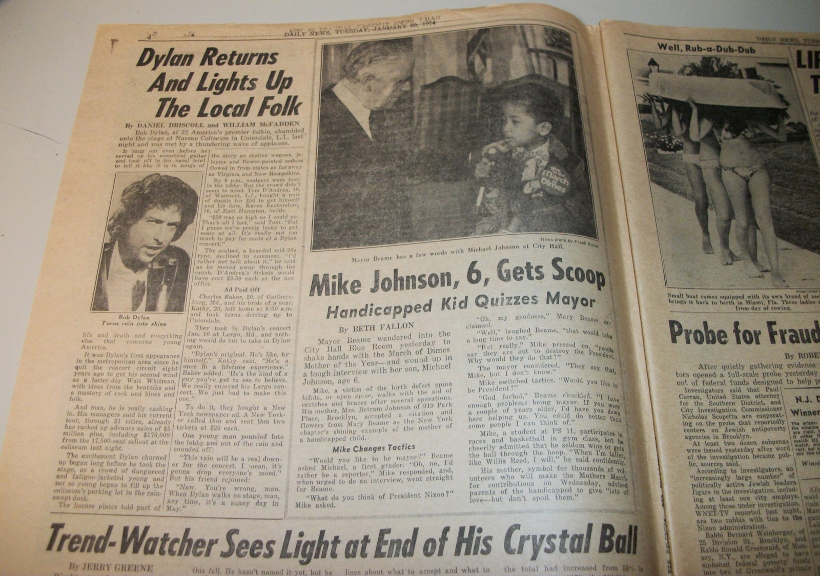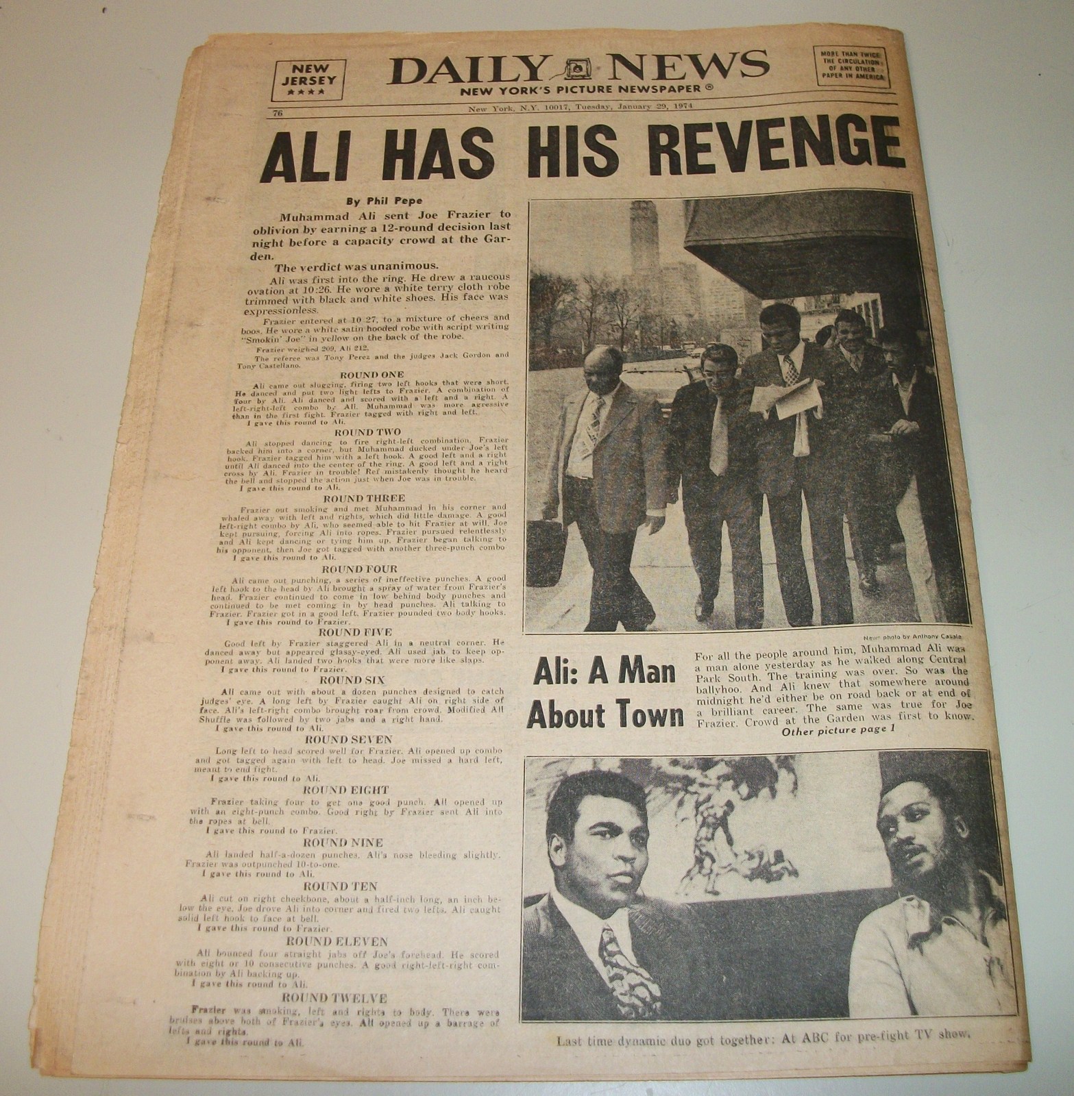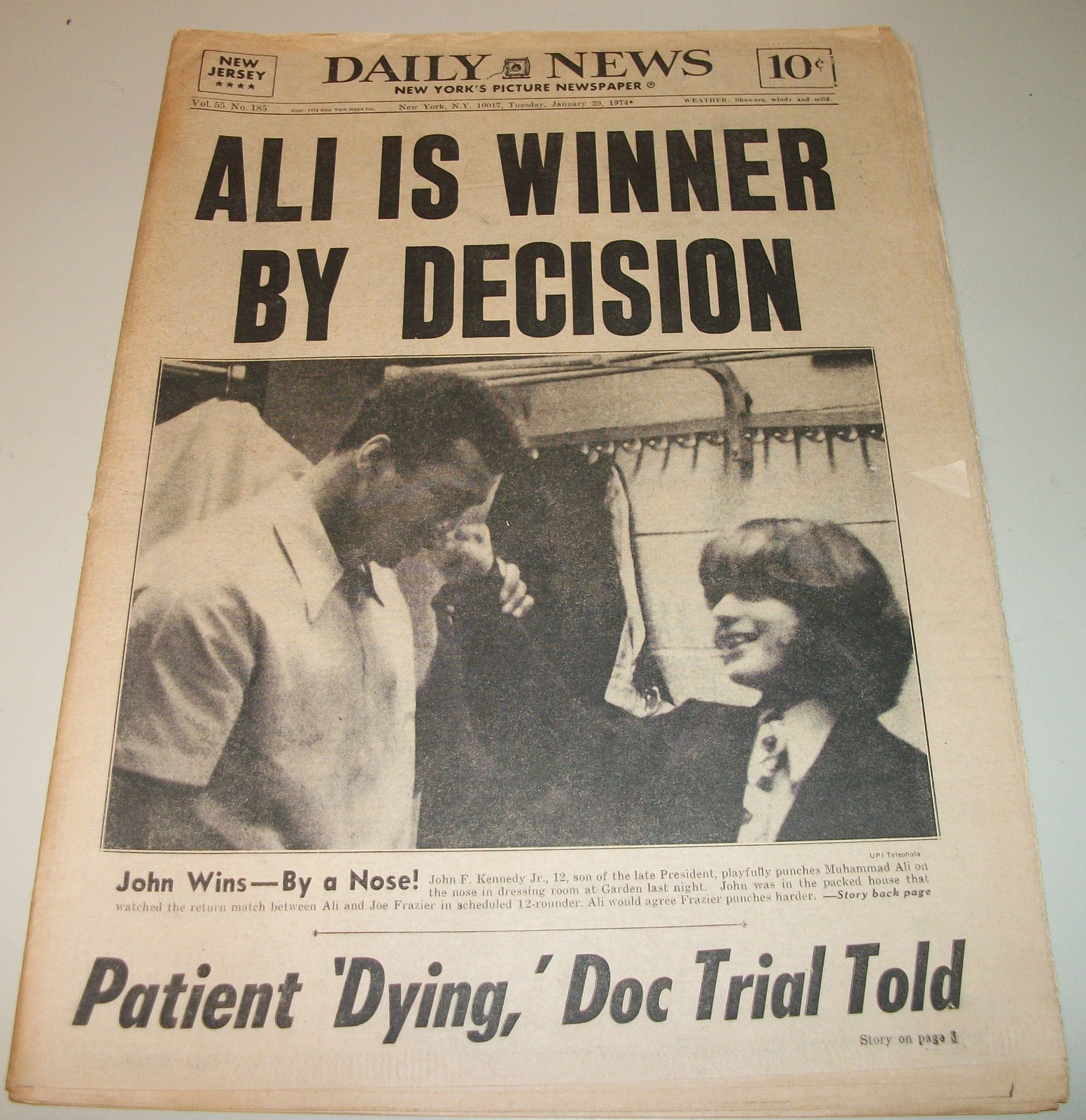 New York Daily News (New Jersey) – Tuesday January 29, 1974. What you see in the pictures is what you get. This is a very interesting old newspaper which features as the front page stories: ALI IS WINNER BY DECISION and has a picture of John F. Kennedy, Jr. (then 12 years old) playfully punching Muhammad Ali. 76 Pages.