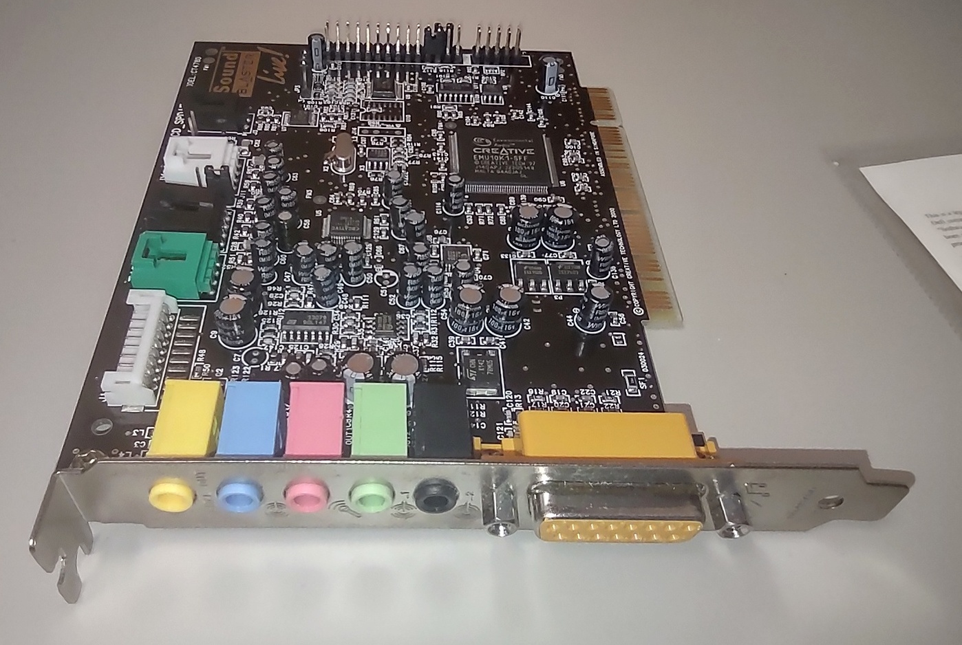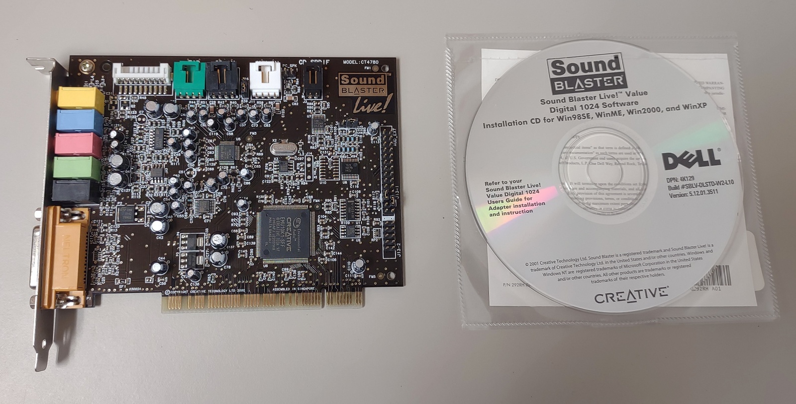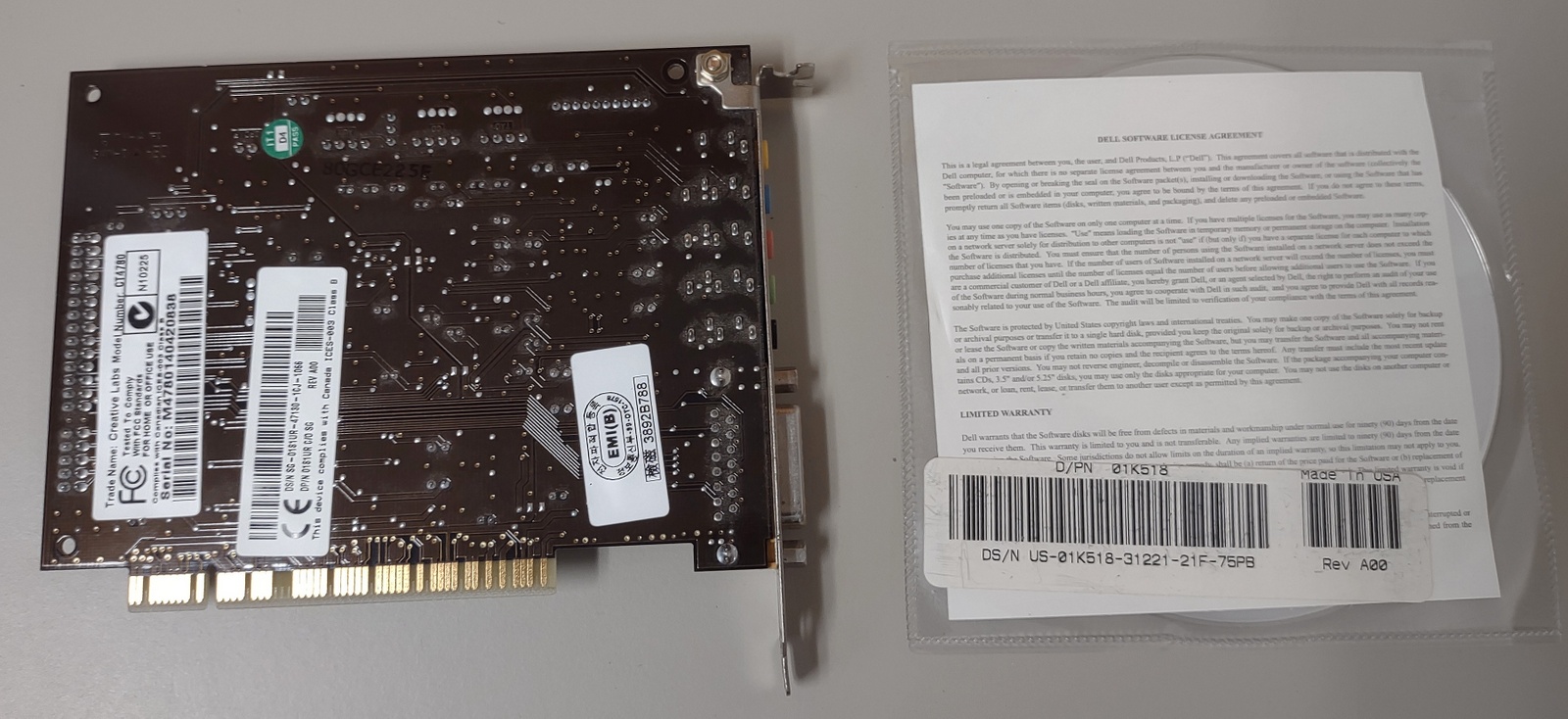 Up for sale is an old sound card which would have been used in a Dell Pentium II/III system with an PCI local bus. We installed this in our Windows XP machine and it was detected and installed the driver automatically. We were able to play sound out of it. The included disc has drivers for Windows 98SE, Windows ME, Windows 2000, and Windows XP. The disc would not work in our Windows XP machine – we think it has a bad CD-ROM drive, but it did open in our Windows 10 machine and told us it couldn’t find a sound card – SEE PICTURES.
